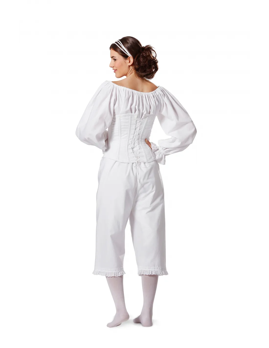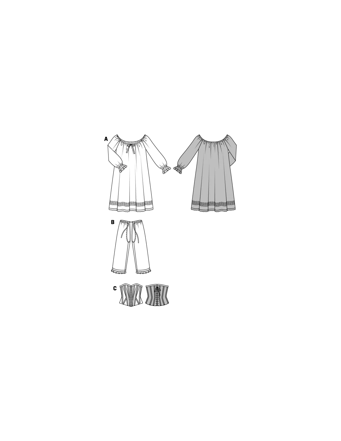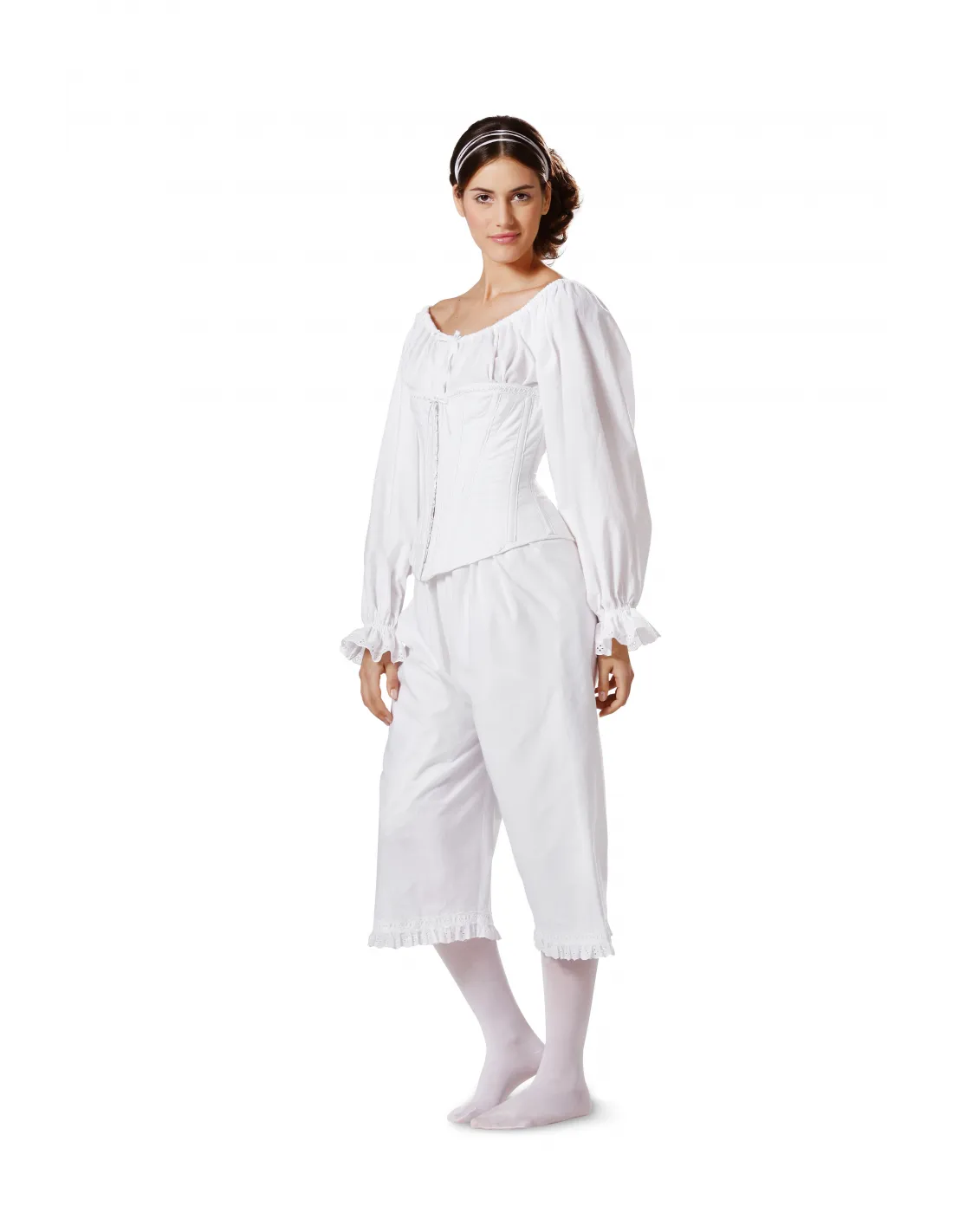 Burda CarnavalSous vêtements femme Voici des dessous dignes d'être portés sous des costumes historiques: une chemise longue froncée à l'encolure et aux manches ainsi qu'un pantalon ¾ maintenu à la taille par un simple ruban. Le corset étroit à baleines est lacé dans le dos et se ferme sur le devant par des crochets et des œillets. Tailles femme: 36 à 50 (US 10-24). Niveau de couture: facile. Tissus conseillés: cotonnade légère, batiste, lin. Langues incluses: Français, Deutsch, English, Español, Nederlands, Italiano, Svenska, Dansk, Pусский.