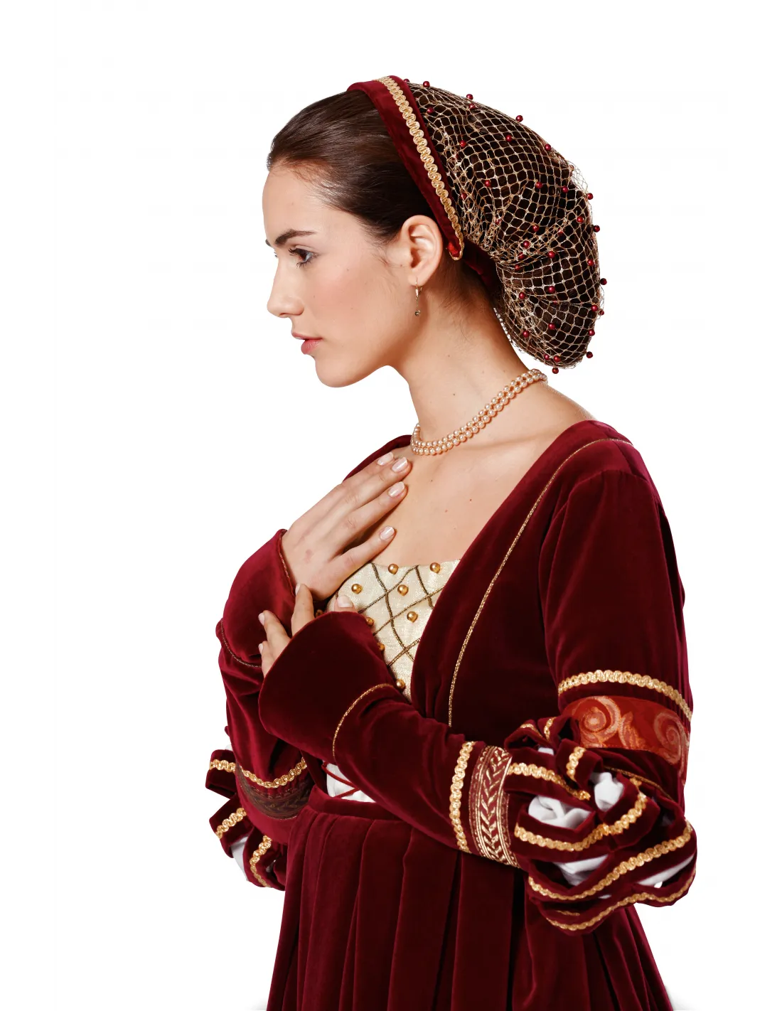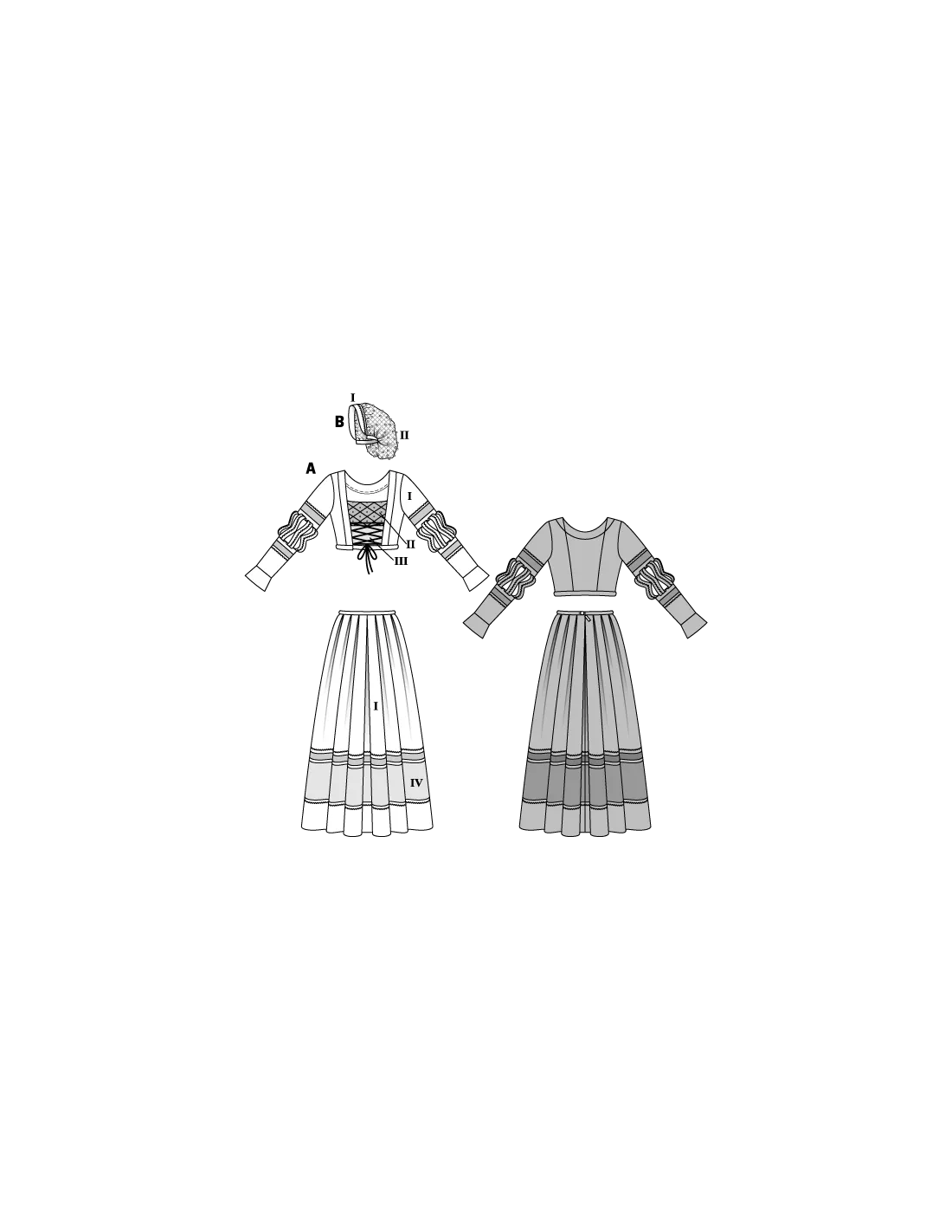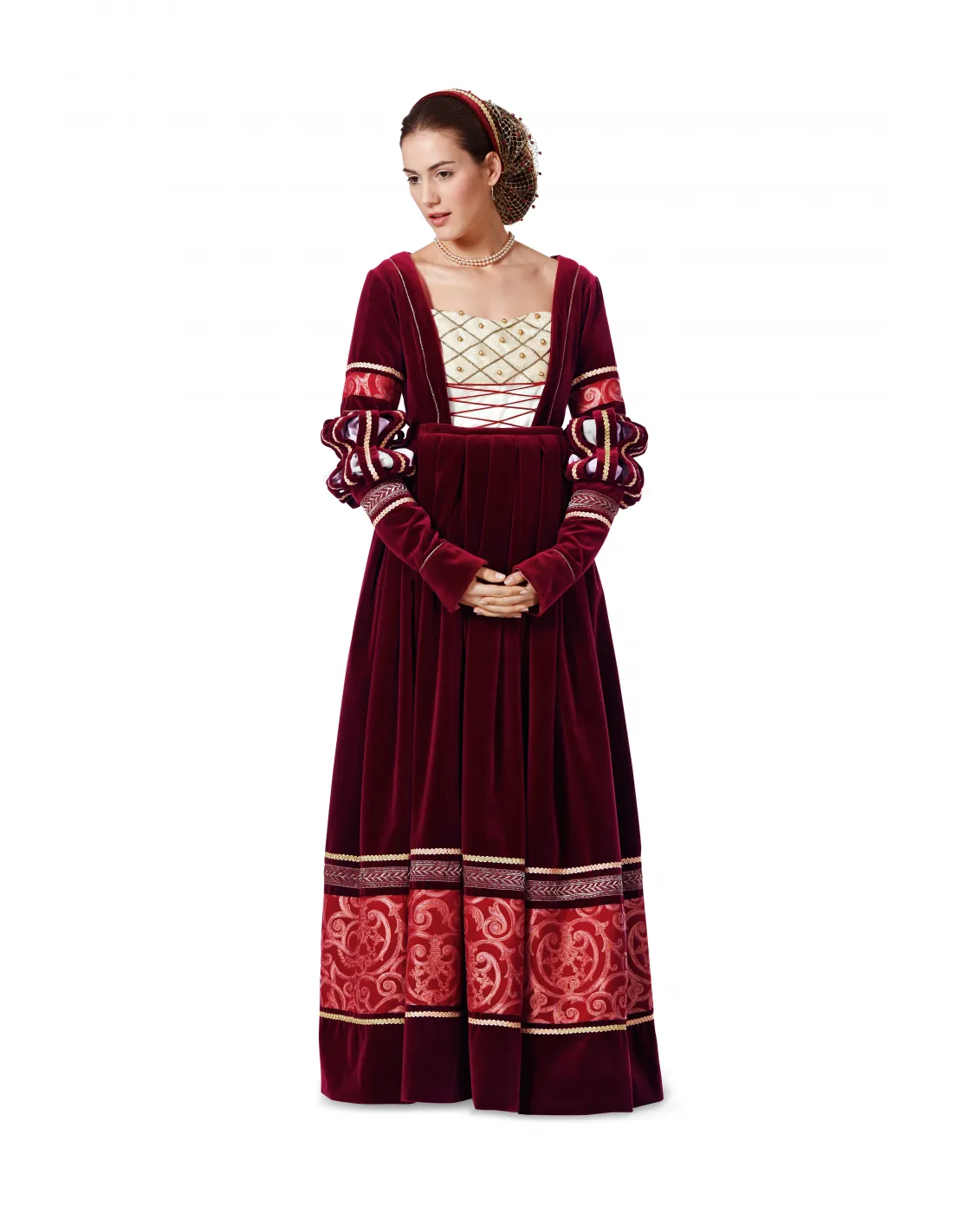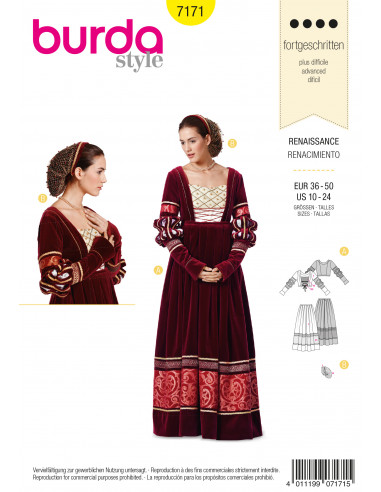 Burda CarnavalRobe historique Renaissance. Corsage, Jupe, CoiffeUne superbe robe deux pièces pour rendre hommage à l'époque Renaissance. De précieux tissus, des dentelles et des galons dorés sont mis à l'honneur. Le décolleté carré, le laçage sur le devant et les manches à fioritures partiellement ajourées ornent le bustier ajusté. La jupe est marquée de profonds plis au niveau de la taille. Le filet de la parure de cheveux est serti de perles. Tailles femme: 36 à 50 (US 10-24). Niveau de couture: difficile - expérimenté . Tissus conseillés: velours, satin, brocart, lamé. Langues incluses: Français, Deutsch, English, Español, Nederlands, Italiano, Svenska, Dansk, Pусский.