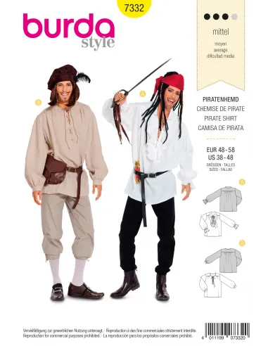 Burda CarnavalDéguisement chemise de pirate homme ample Tailles homme: 48 à 58 (US 38-48). Niveau de couture: moyen-intermédiaire. Tissus conseillés: lin, tissus en coton. Langues incluses: Français, Deutsch, English, Español, Nederlands, Italiano, Svenska, Dansk, Pусский.