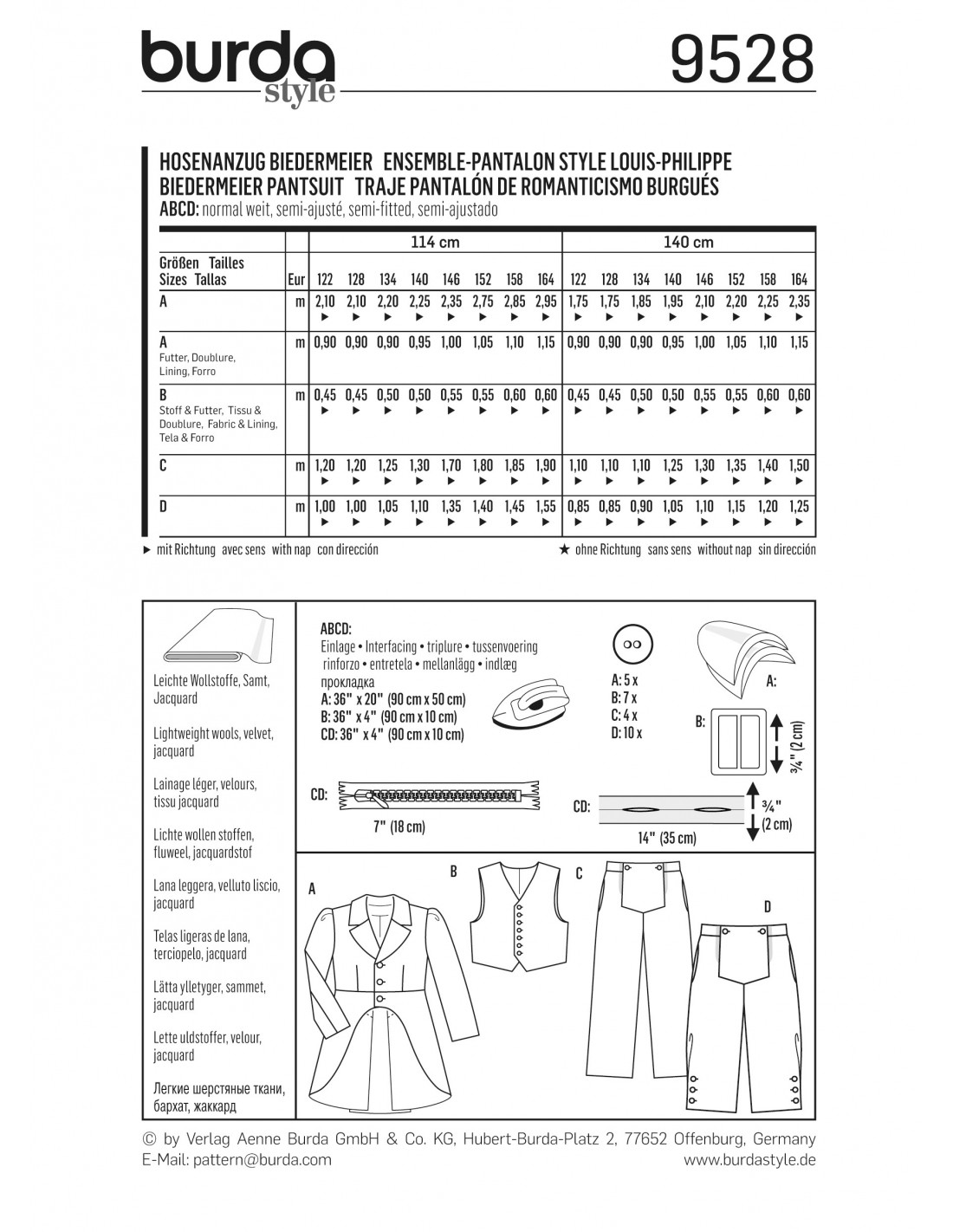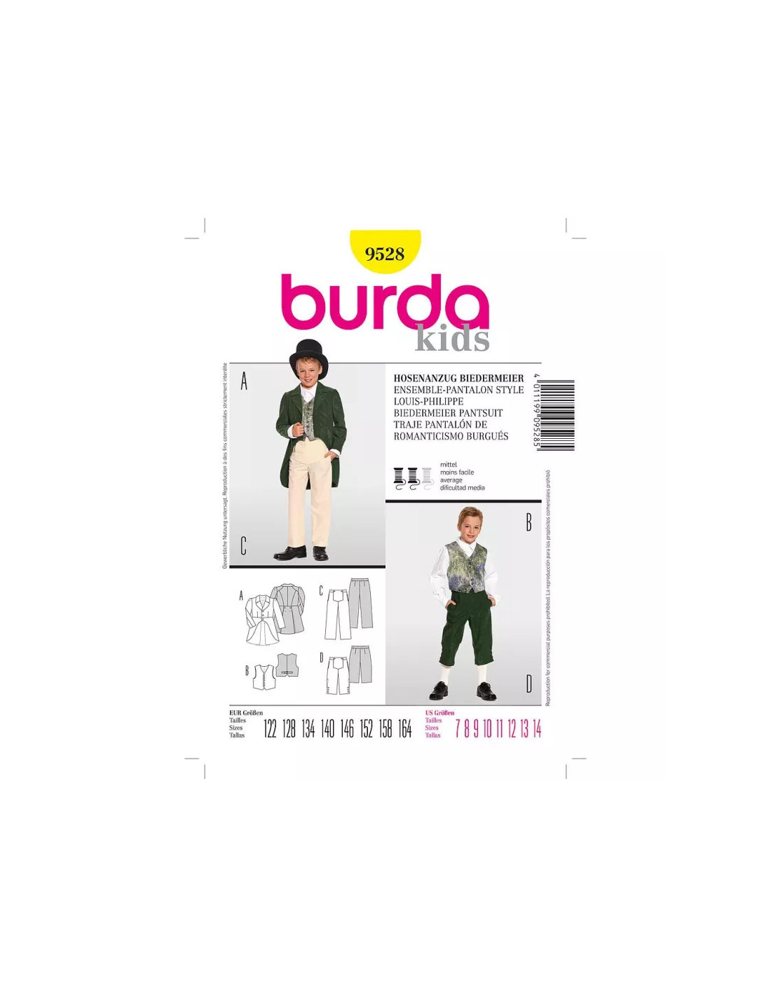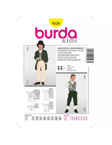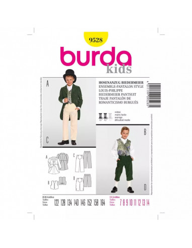 Burda CarnavalEnsemble historique pantalon style Louis-PhilippeUn ensemble pantalon sorti tout droit de l'époque Louis-Philippe. La redingote A montre un revers et une petite basque. Votre petit jeune homme la portera sur un pantalon C ou D de longueurs différentes à braguette boutonnée. Le gilet B taillé dans un noble tissu complète ce très bel ensemble. Tailles: 122 - 164cm (7 ans - 14 ans)Niveau de couture: moyen-intermédiaire. Tissus conseillés: lainages légers, velours, damassé. Langues incluses: Français, Deutsch, English, Español, Nederlands, Italiano, Svenska, Dansk, Pусский.
