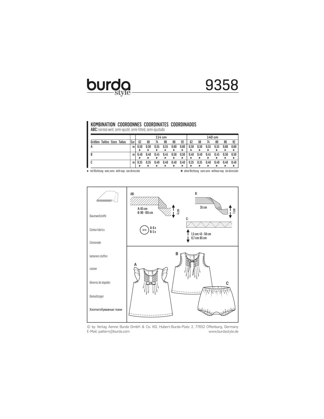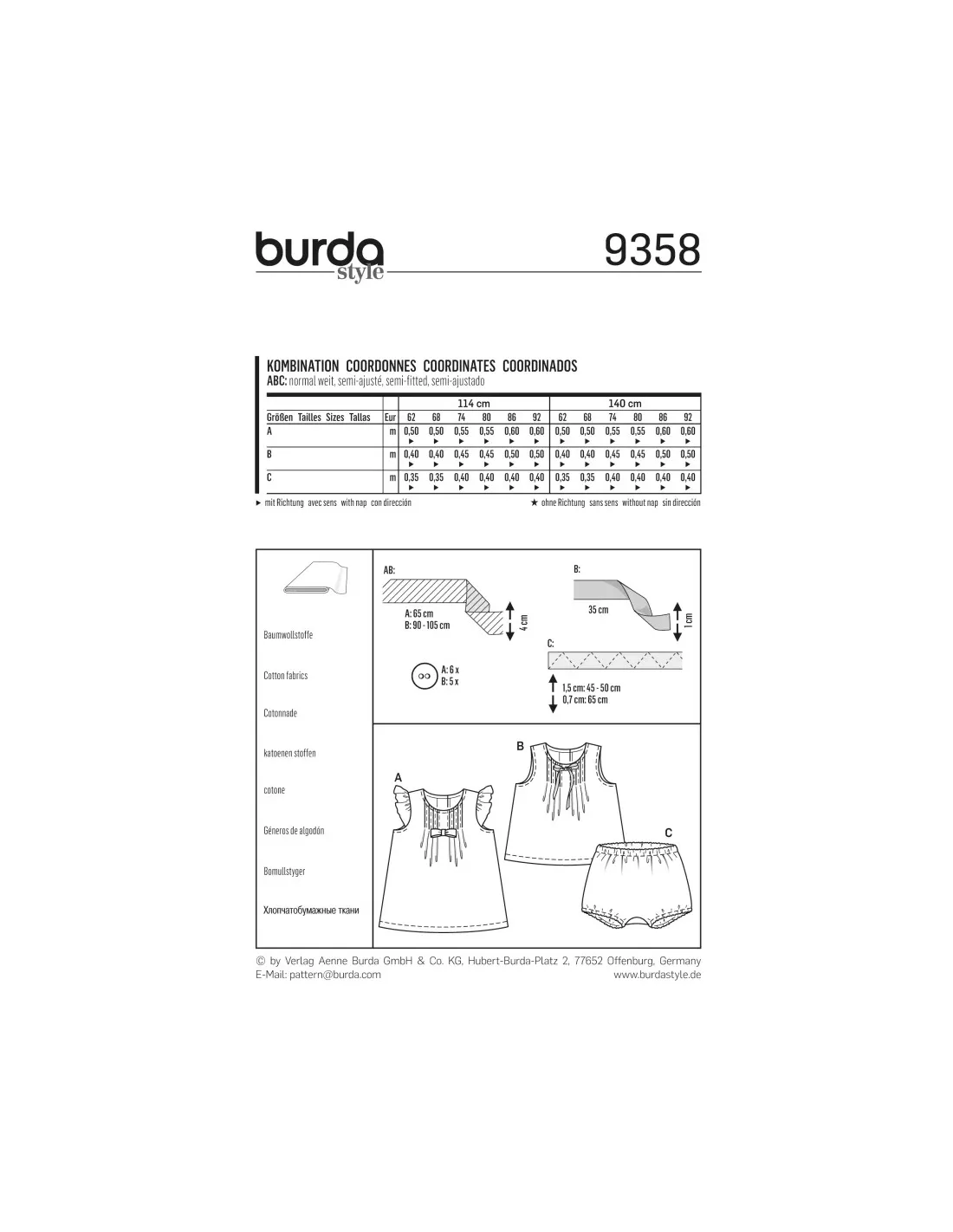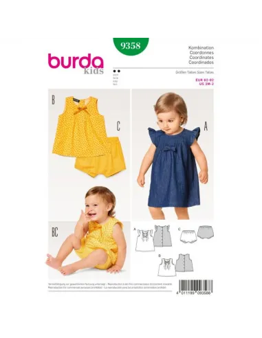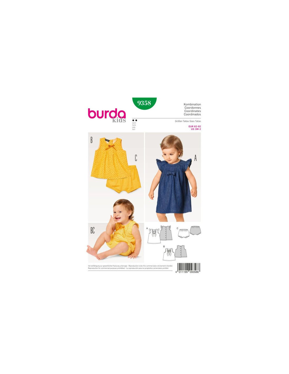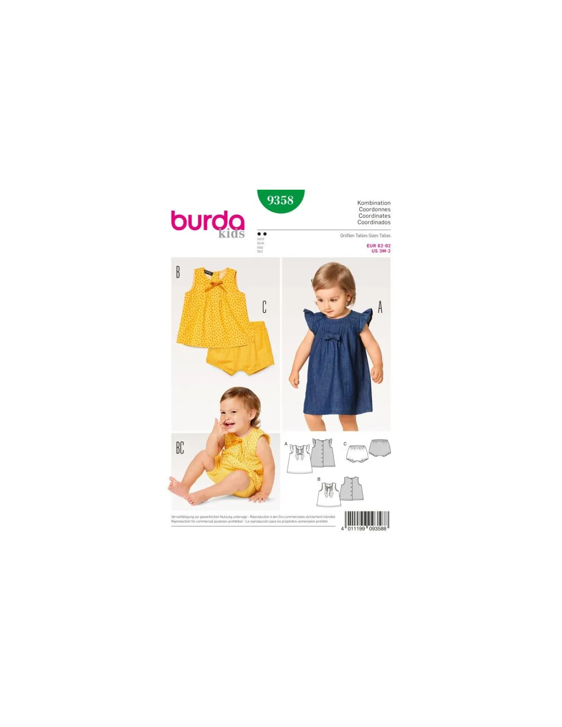 La robe et la blouse affichent de petits plis piqués sur le devant et une patte de boutonnage dans le dos. Le modèle A se pare de volants de manche froncés, le modèle B n'a pas de manches, les deux accueillent un beau nœud. Assortie à la blouse, une confortable culotte élastiquée.Tailles : 62 à 92Tissus conseillés : cotonnadeNiveau de couture : facileLangues incluses : Français, Deutsch, English, Español, Nederlands, Italiano,Svenska, Dansk, Pусский