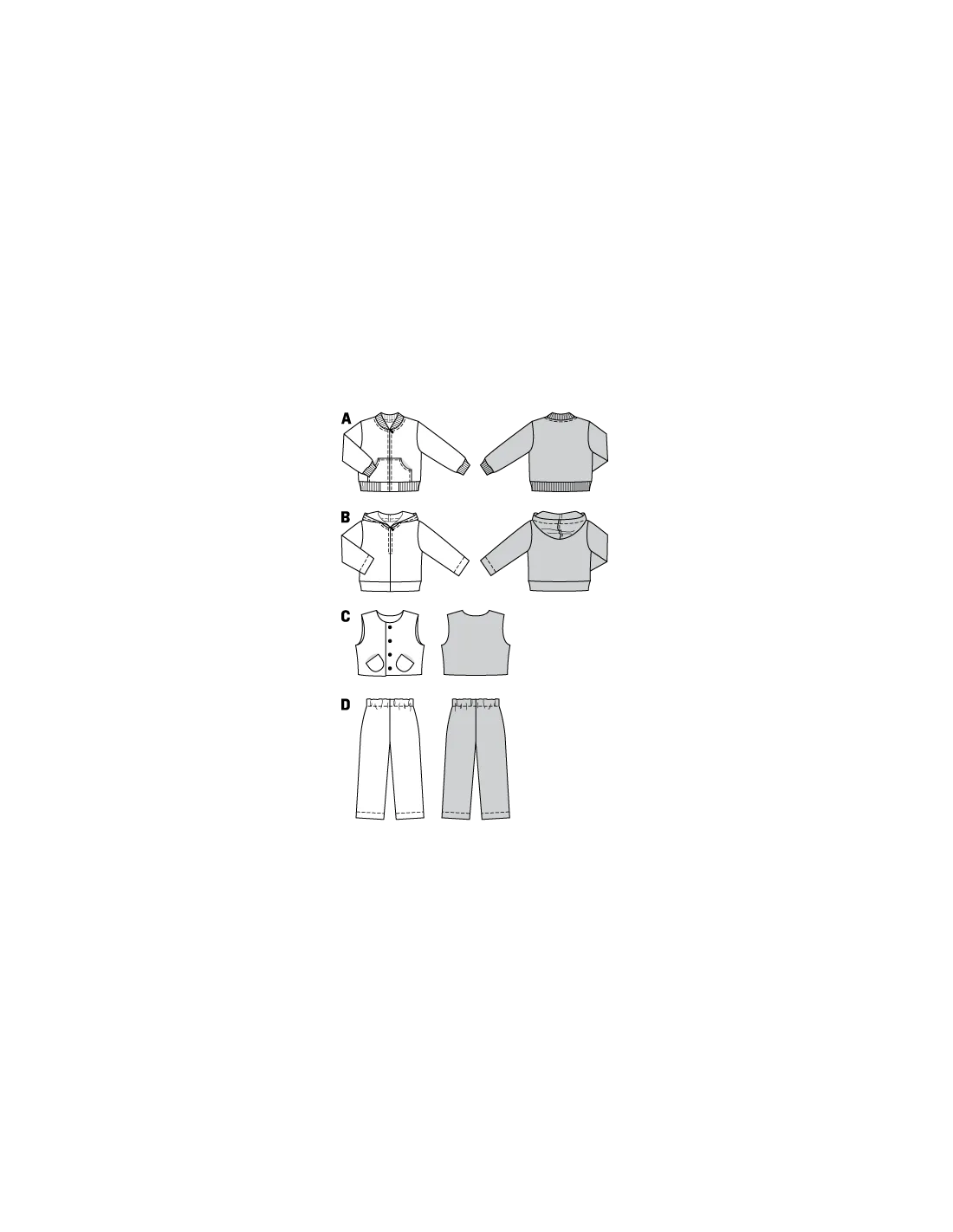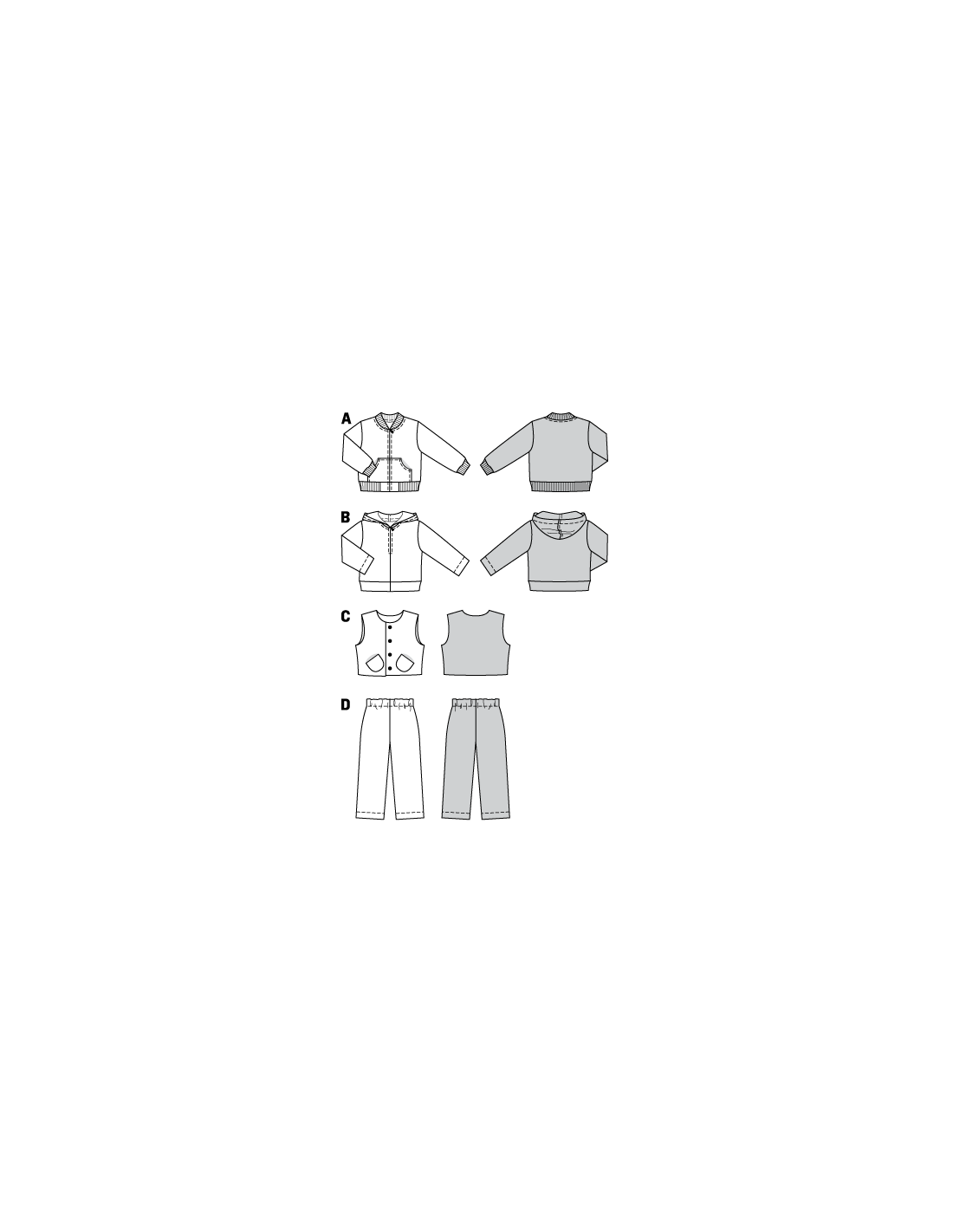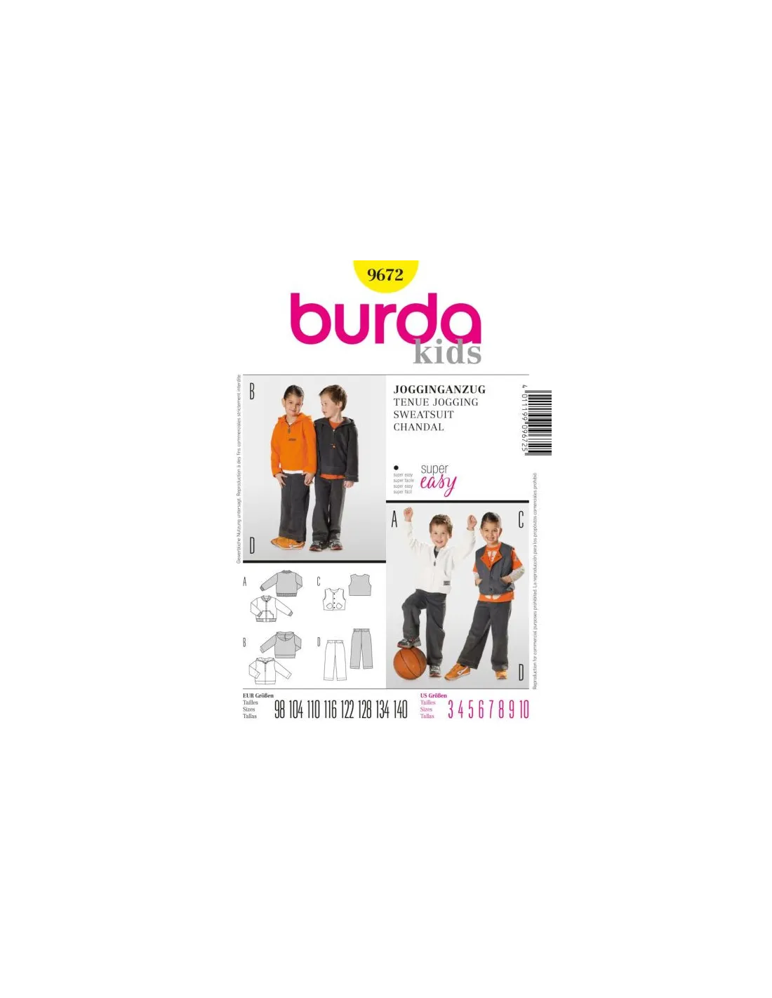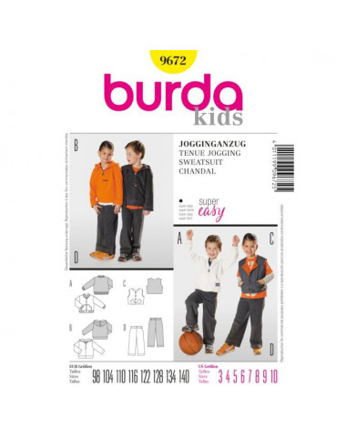 Ensemble jogging fille - garçon. Niveau couture: super facile - rapide - Ideal pour commencer Tailles : 98 - 140 cm (3 ans à 10 ans)Variable à souhait, pour fille et garçon. Veste A: se distingue par son ourlet, ses manches et son col montant en bords côtes. Zippée devant, elle se dote de poches plaquées. Shirt B: à capuche et fente zippée. Gilet C: doublé d’un tissu contrastant, il se porte avec le pantalon D très simple, à taille élastiquée. Des pièces qui se combinent à loisir. Tissu(s) conseillé(s): Jersey molletonné, velours polaire. C: en plus, cotonnade, microfibres. Langues incluses: Français, Deutsch, English, Español, Nederlands, Italiano, Svenska, Dansk, Pусский.