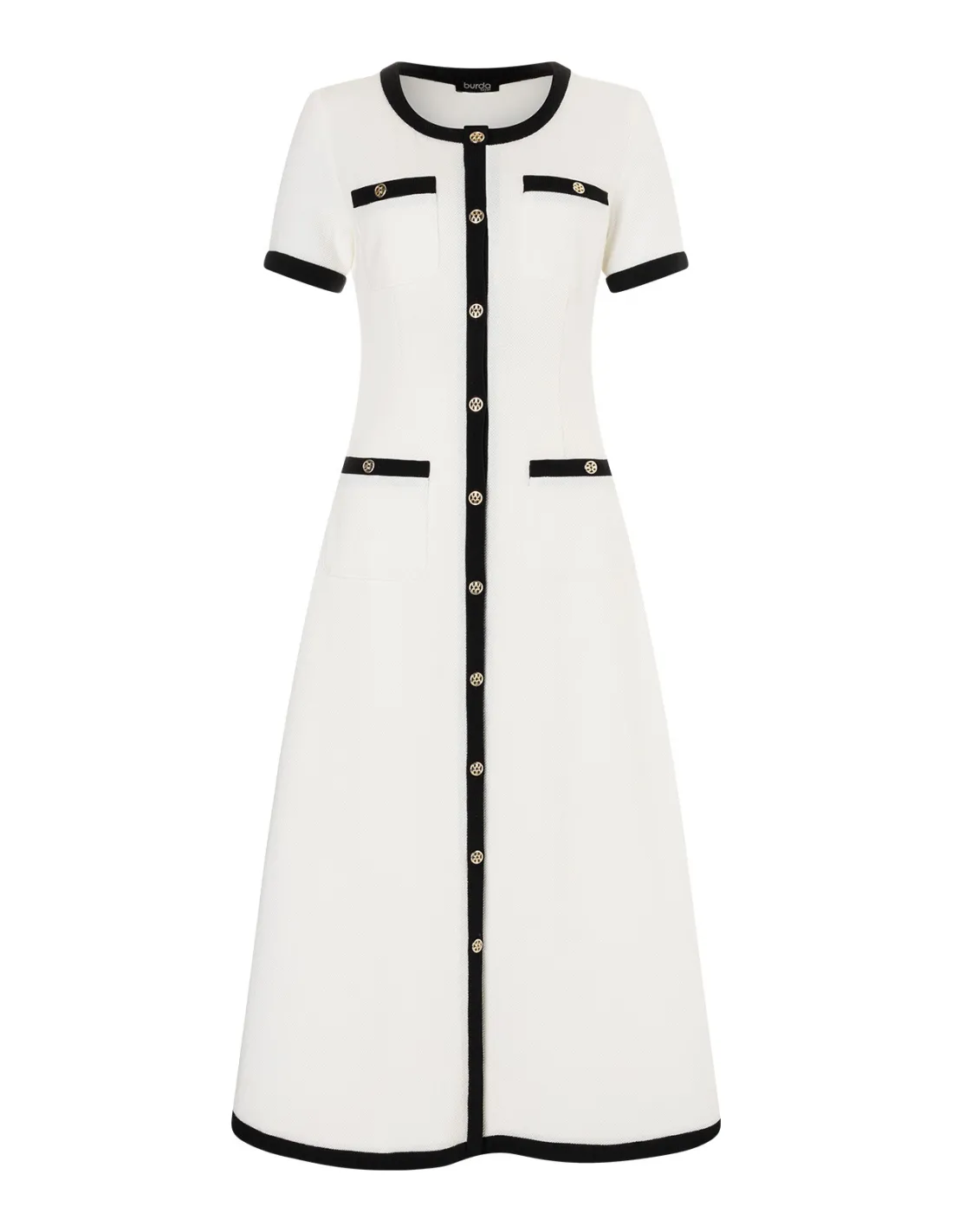 Apportez des accents élégants avec ces pièces en maille raffinées ! La robe en maille piquée séduit avec des bordures contrastantes sur les poches et l’encolure, des boutons dorés et une coupe légèrement cintrée – un Little French Jacket version robe. La petite veste avec bordures et boutons décoratifs peut se porter sur des robes d’été ou des blouses et constitue une alternative chic au blazer.