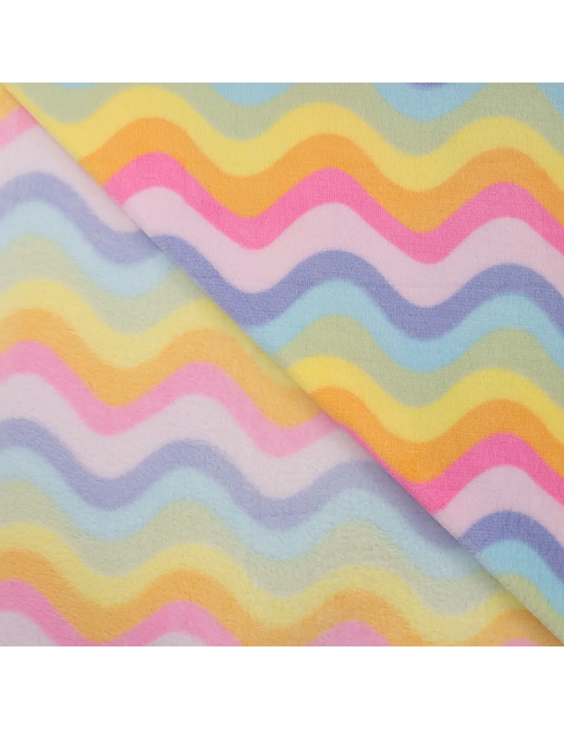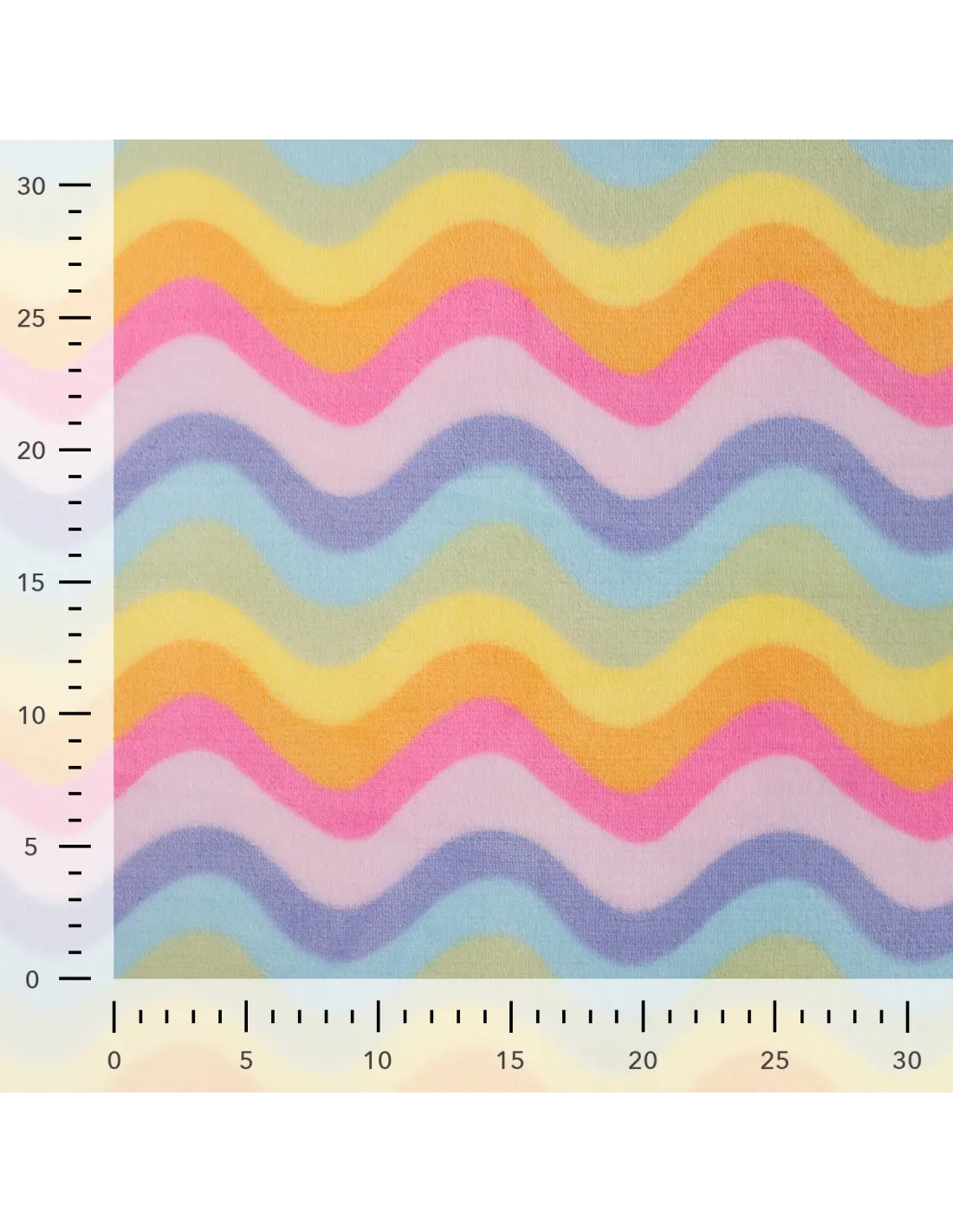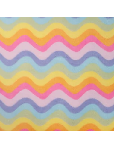 Faites le plein de bonne humeur avec notre Polaire Doudou au motif vagues multicolores "Rainbow" ! Ce tissu est une véritable injection de joie et de douceur. Les rayures ondulées dans un éventail de couleurs pastel et vives créent un effet dynamique et joyeux, parfait pour égayer les journées d'hiver.