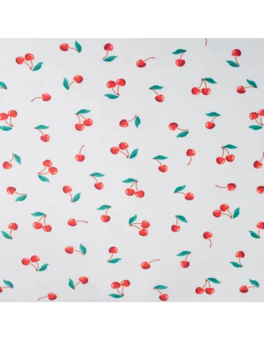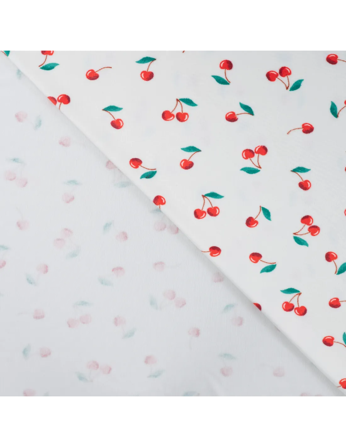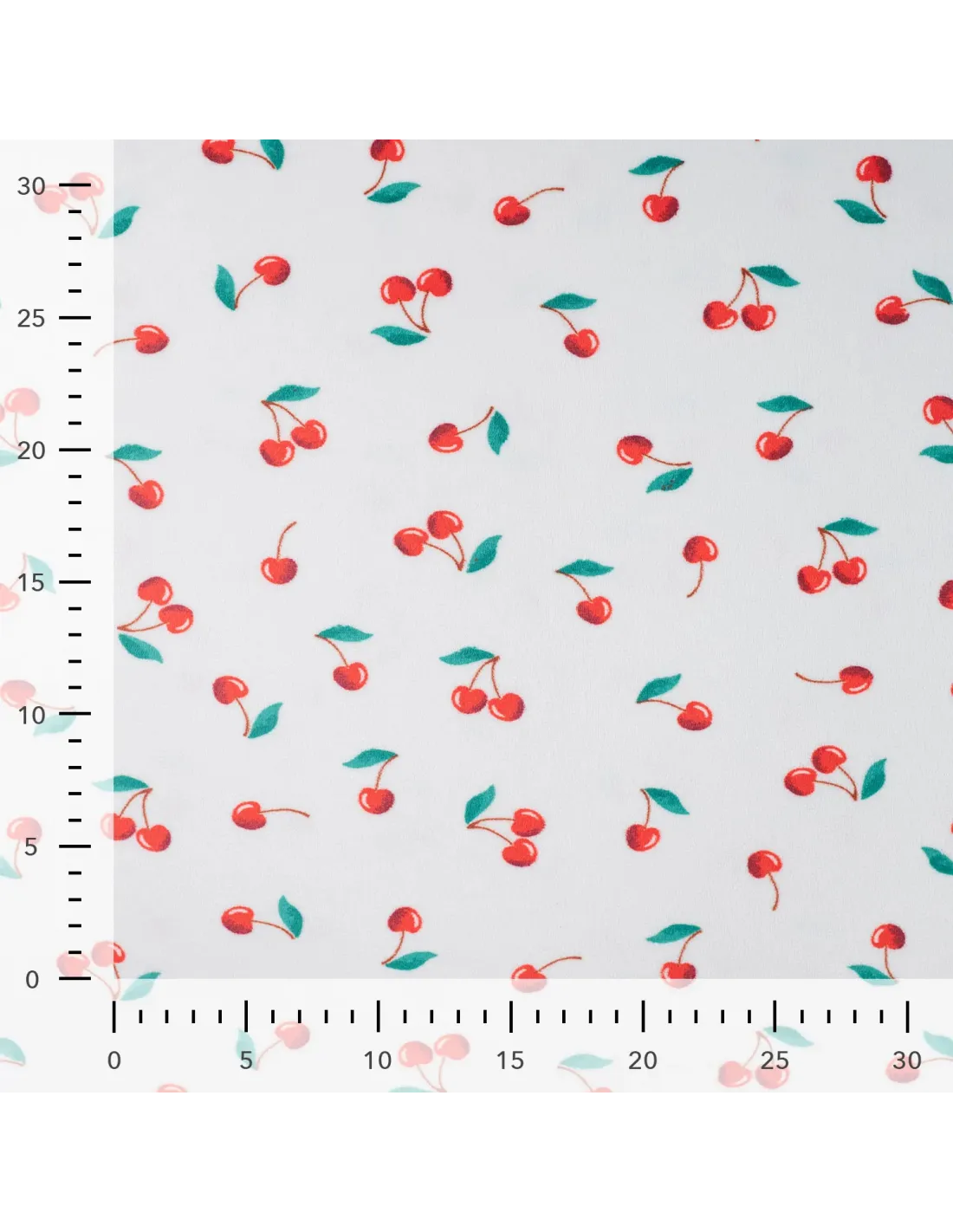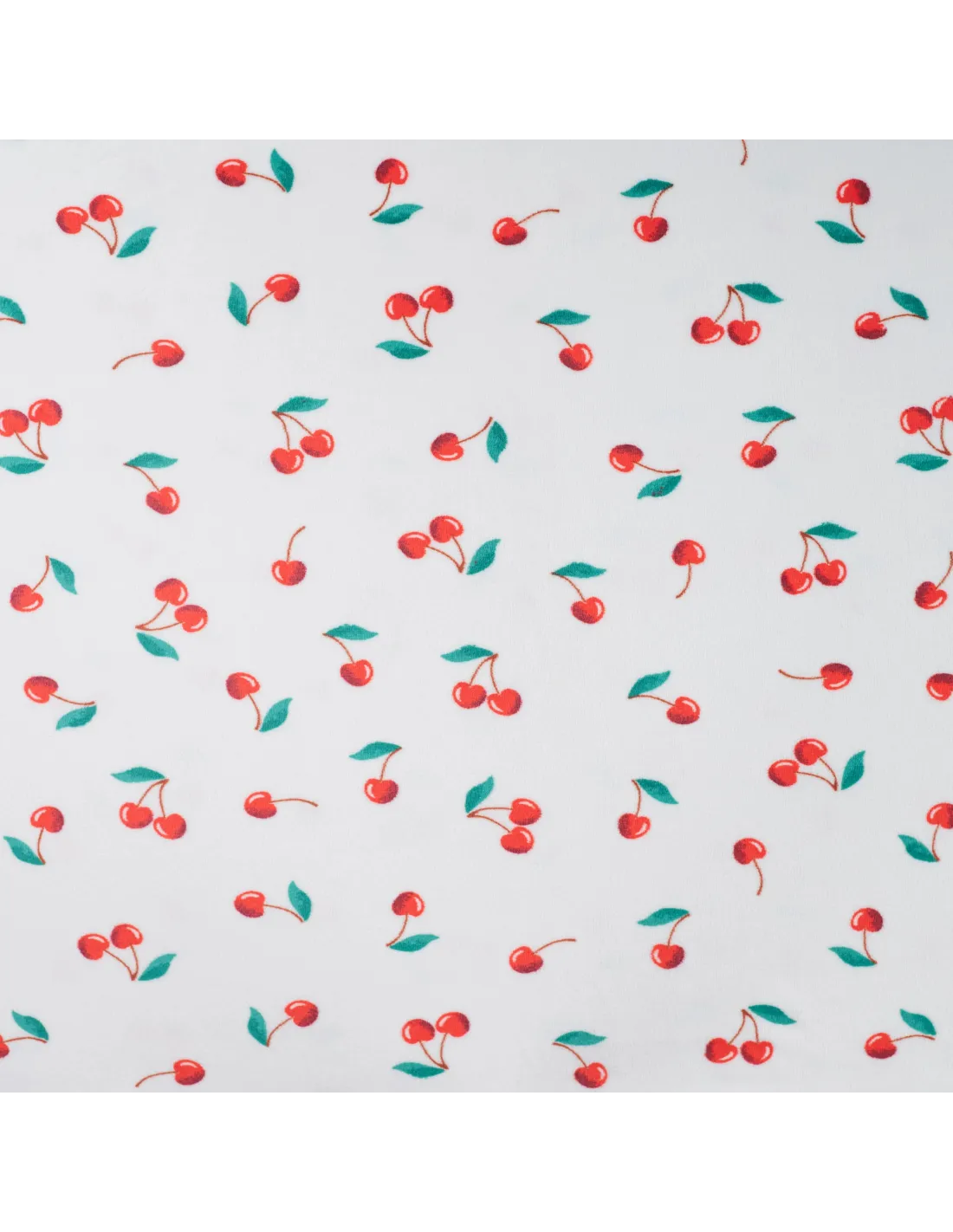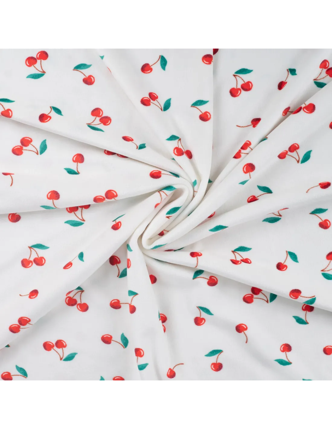 Minky stretch et lisse imprimé cerises. Tout doux pour confectionner pyjamas, doudous ou décorations.