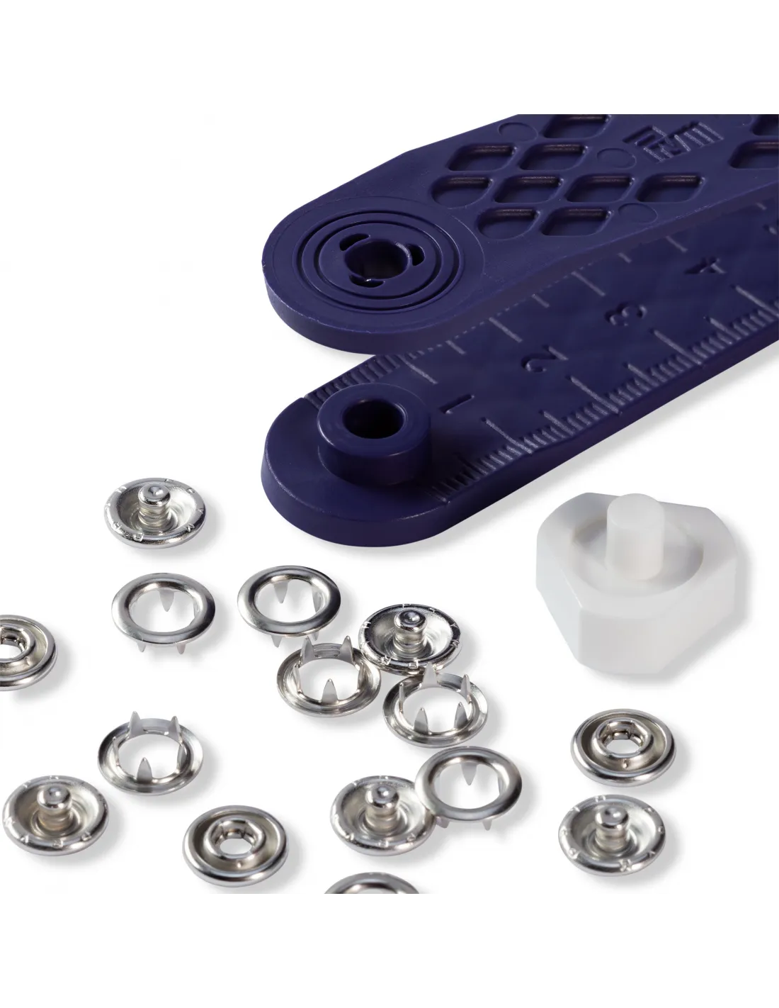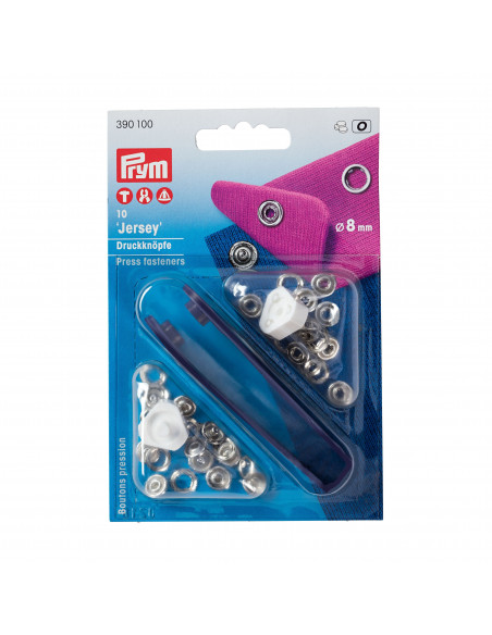 Les boutons pression « Jersey » de Prym sont caractérisés par leur force de fermeture souple à moyenne. Ils sont conçus spécialement pour les matériaux fins et élastiques tels que les vêtements bébé ou enfant. L’avantage de ce bouton pression est qu’il ne nécessite pas de percer un trou pour être posé : les boutons pression à griffes intégrés repoussent le tissu et permettent ainsi de ne pas l’abîmer. Le lavage, l’essorage, le nettoyage, le repassage à fer ou à rouleau ne posent aucun problème aux boutons pression inoxydables « Jersey » de chez Prym. Les boutons pression sont également disponibles en différents coloris et avec différents dessins. Les boutons pression de 18 mm ne peuvent être posés qu’avec l’outil fourni. Les boutons pression de 10 et 12 mm peuvent également être posés avec la pince VARIO à percer et à river ou le trépied Prym.