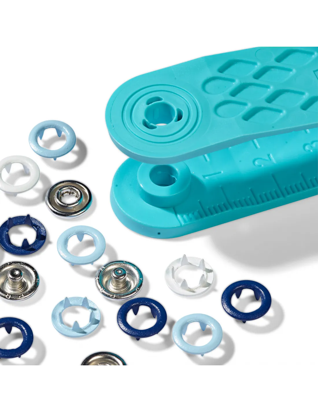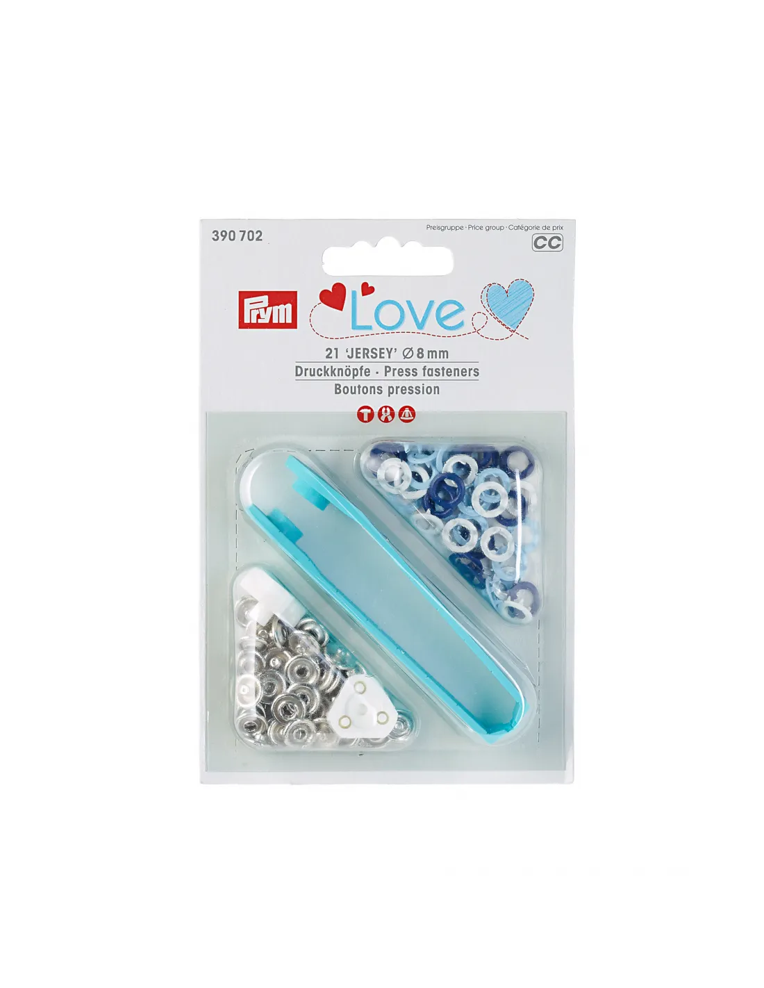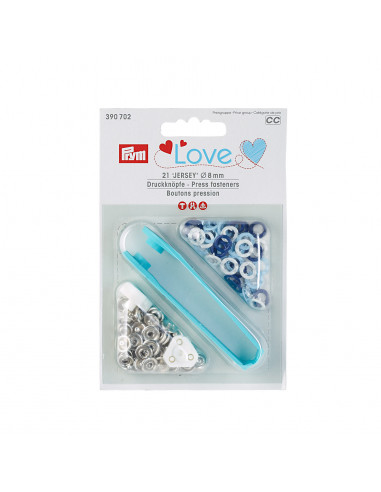 Les boutons pression sans couture « Jersey » de la série « Prym Love » se démarquent surtout par leur mélange de couleurs harmonieuses. Ils sont particulièrement adaptés pour les tissus minces, élastiques comme p. ex. pour vêtements bébé ou enfant. Les boutons pression sans couture « Prym Love » ont un diamètre de 8 mm et sont disponibles au choix en différentes combinaisons de couleurs assorties par trois. Un outil de finition est inclus dans chaque paquet. Aucun pré-perçage nécessaire pour fixer les boutons pression jersey. Un court guide se trouve au dos du paquet.
