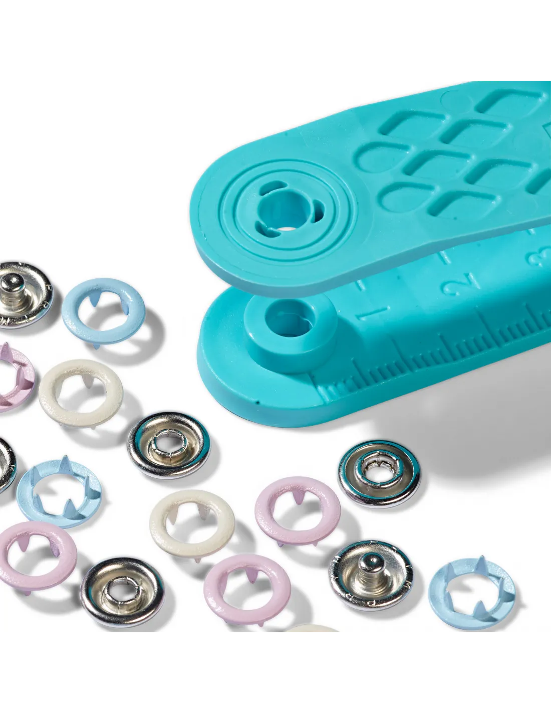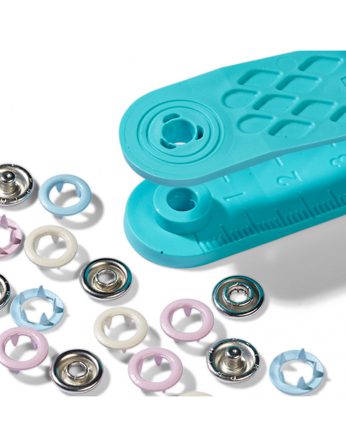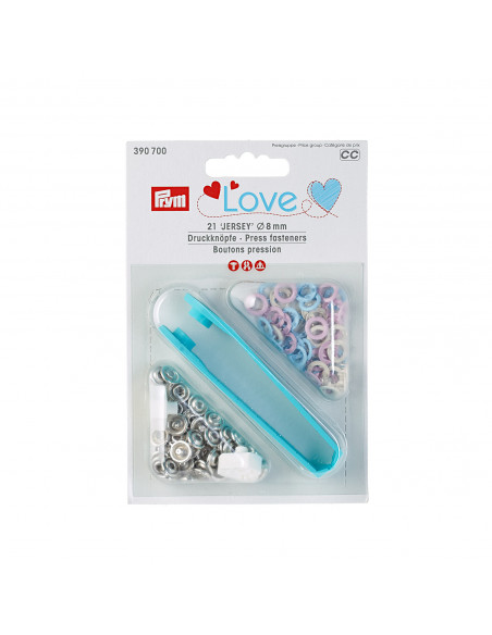 Les boutons pression sans couture « Jersey » de la série « Prym Love » se démarquent surtout par leur mélange de couleurs harmonieuses. Ils sont particulièrement adaptés pour les tissus minces, élastiques comme p. ex. pour vêtements bébé ou enfant. Les boutons pression sans couture « Prym Love » ont un diamètre de 8 mm et sont disponibles au choix en différentes combinaisons de couleurs assorties par trois. Un outil de finition est inclus dans chaque paquet. Aucun pré-perçage nécessaire pour fixer les boutons pression jersey. Un court guide se trouve au dos du paquet.