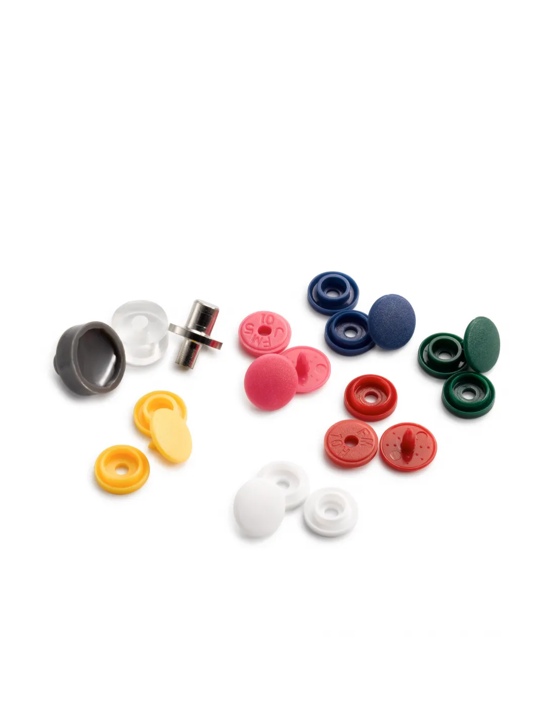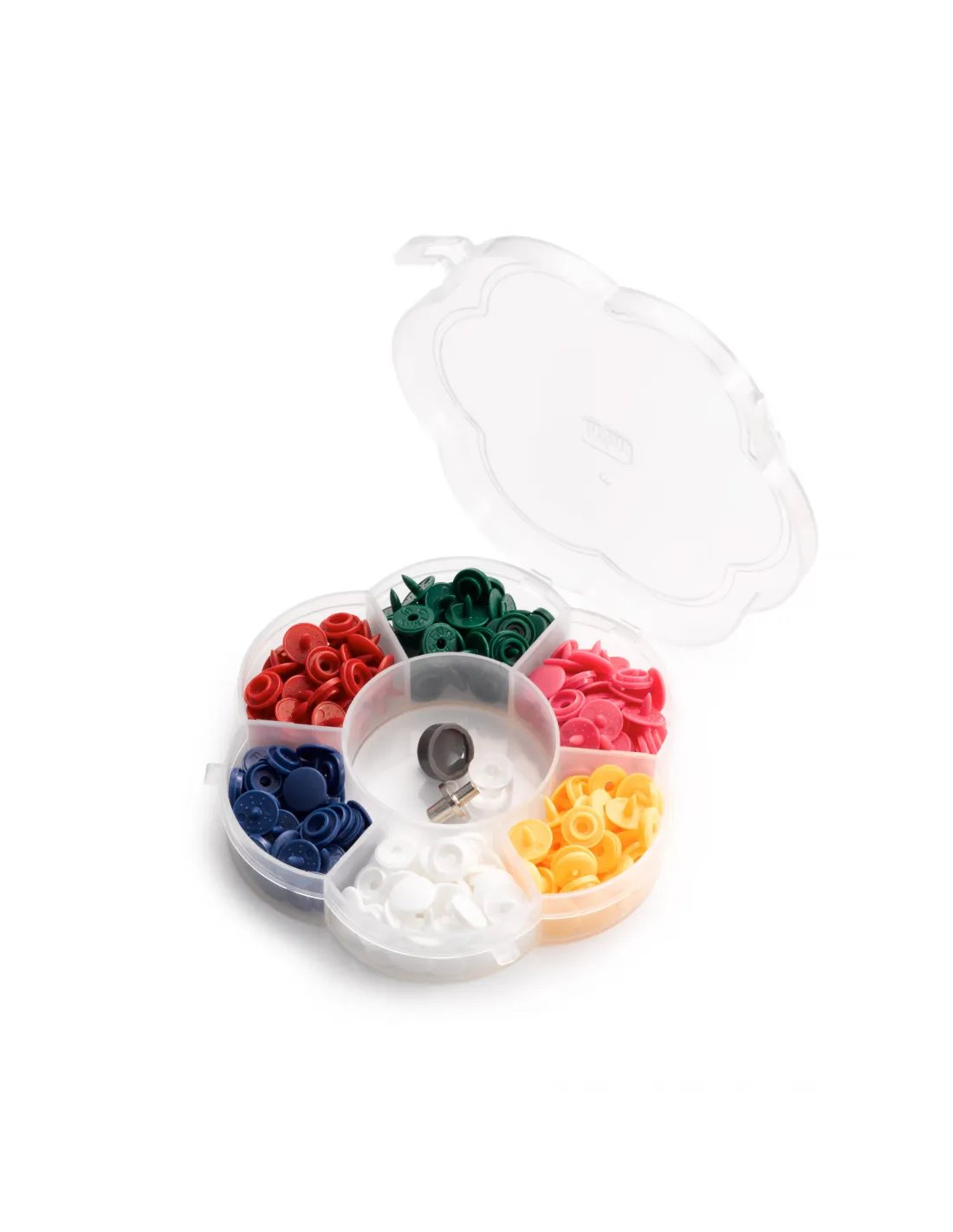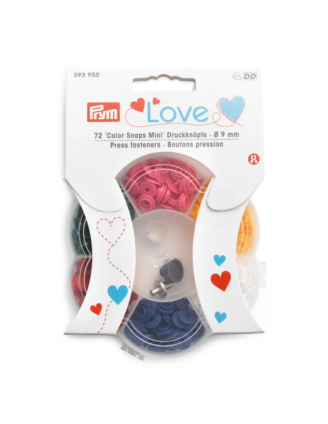 Cette boîte refermable contient 72 boutons pression sans couture « Color Snaps Mini » de la série Prym Love, en 6 couleurs gaies différentes - pour le rangement et pour un accès rapide. Ils sont idéals surtout pour les vêtements bébé et enfant. Les « Color Snaps Mini » prisés sont en matière synthétique de qualité supérieure et se posent uniquement avec la pince VARIO. Grâce au jeu d’outils joint, et à un guide pas à pas, la pose des boutons pression se réussit d’un coup, même pour les débutants, et sans réaliser de trous au préalable,