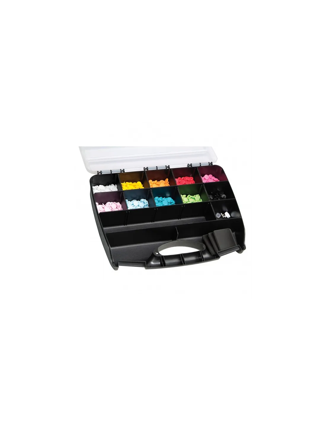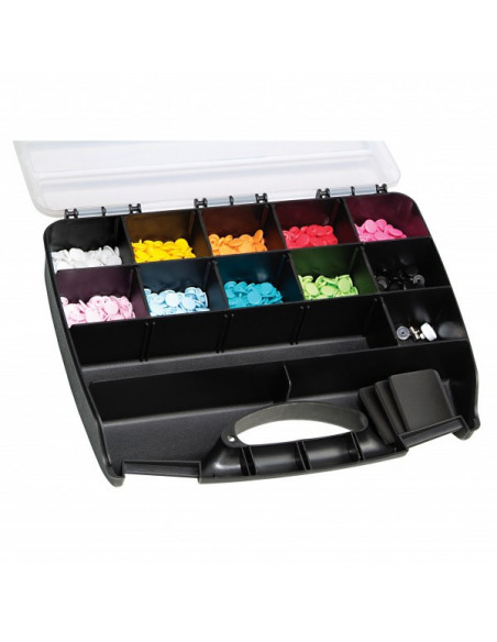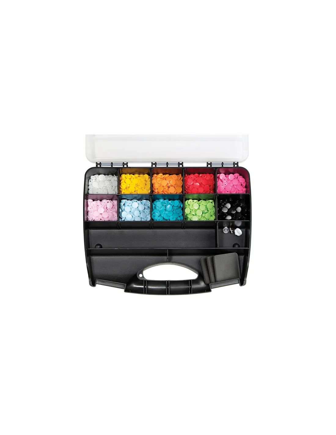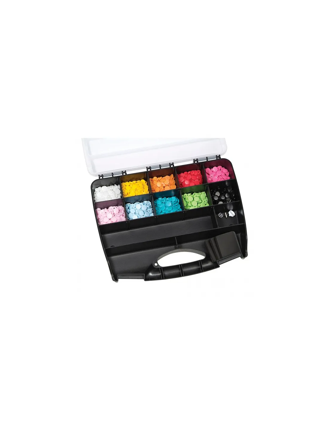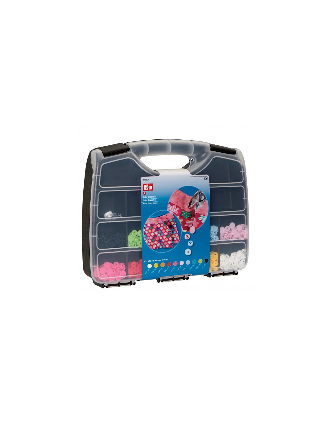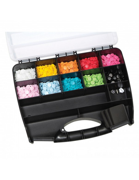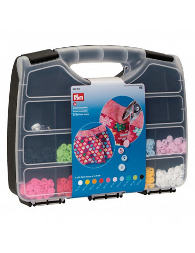 Idéal pour les couturières qui aiment le rangement : grâce à cette boîte « Color Snaps », il est bien plus rapide de trouver les favoris « Color Snaps » pour personnaliser blousons, vestes, vêtements pour enfants, accessoires et bien plus encore ! La boîte « Color Snaps » contient 300 « Color Snaps » avec force de fermeture souple dans dix couleurs gaies (blanc, jaune, orange, rouge, fuchsia, rose, bleu clair, turquoise, vert pomme et noir) ainsi qu’un jeu d’outils « Color Snaps ». Les compartiments vides de la boîte permettent de ranger une pince VARIO à percer et à river de Prym, plus de « Color Snaps » ou d’accessoires. La pose des « Color Snaps » requiert la pince VARIO à percer et à river de Prym.