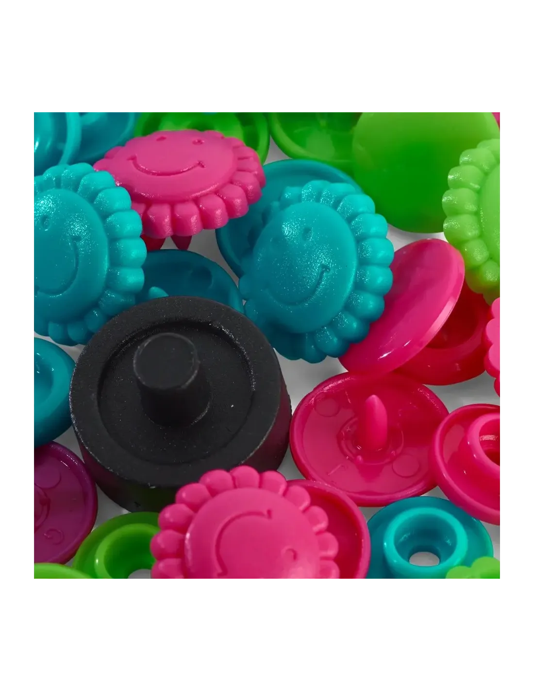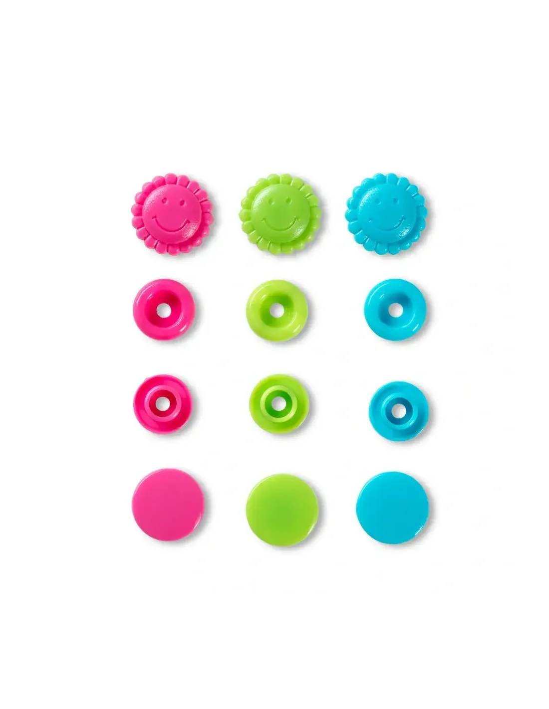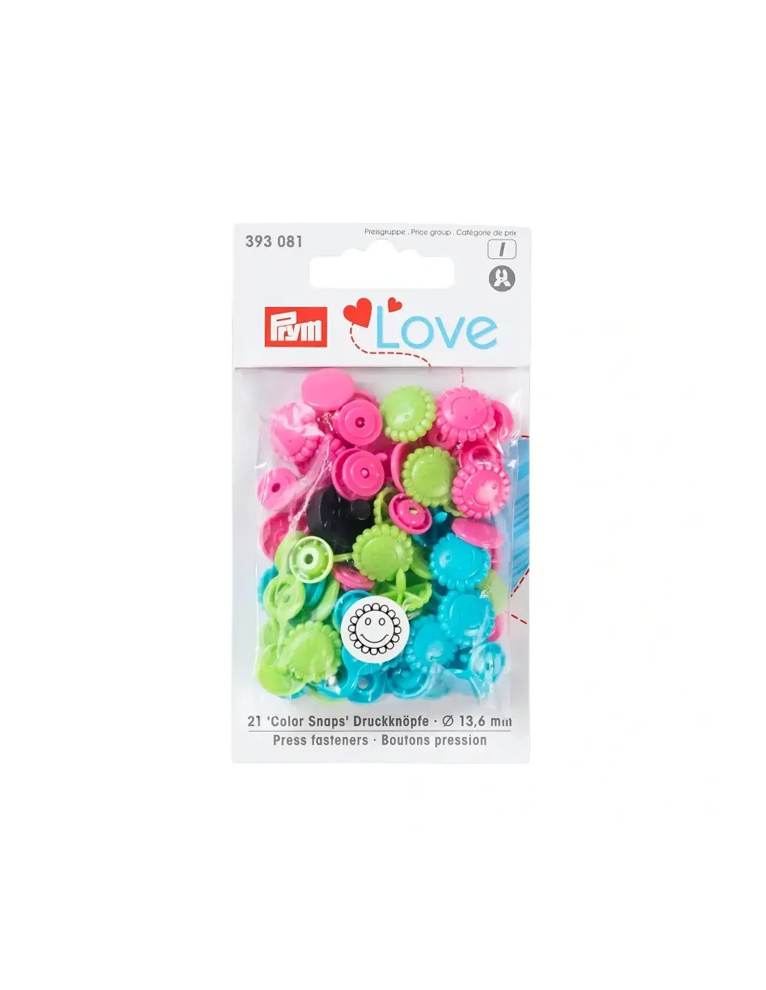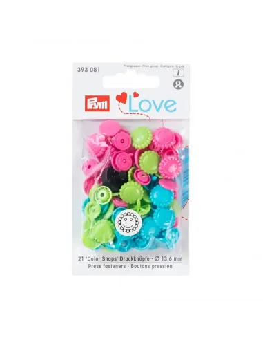 Les « Color Snaps » de la gamme « Prym Love » ont depuis longtemps acquis le statut d’incontournables. Ils sont conformes à la norme Oeko-Tex® Standard 100, classe 1 et sont volontiers utilisés pour les vêtements bébé et enfant du fait de leur force de fermeture souple. Il est également possible d’utiliser les boutons pression de couleur pour décorer très facilement blousons, vestes ou draps cousus à la main. Chaque lot contient un assortiment harmonieux de trois couleurs différentes assorties : il y a des assortiments pour absolument tous les goûts ! Les « Color Snaps » en plastique résistants sont lavables à 60 degrés. La pose des « Color Snaps » requiert l’utilisation de la pince VARIO à percer et à river de Prym ainsi que du jeu d’outil « Color Snaps ».