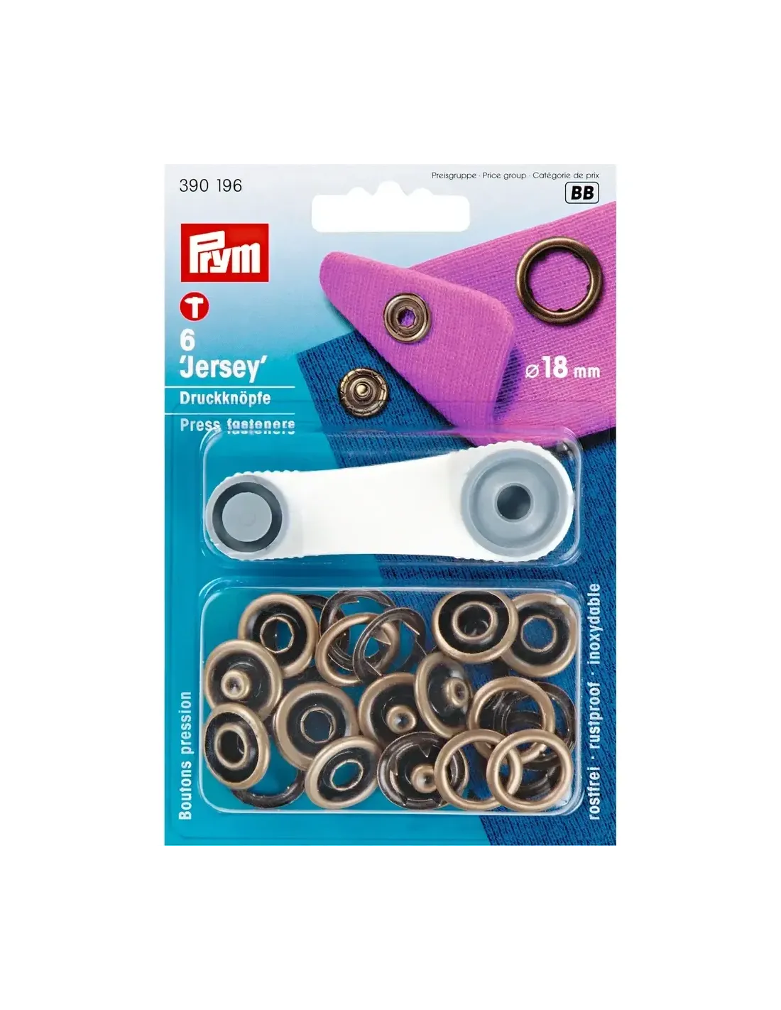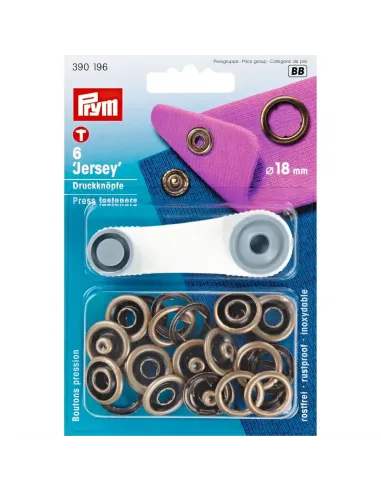 Les boutons pression « Jersey » de Prym sont caractérisés par leur force de fermeture souple à moyenne. Ils sont conçus spécialement pour les matériaux fins et élastiques tels que les vêtements bébé ou enfant. L’avantage de ce bouton pression est qu’il ne nécessite pas de percer un trou pour être posé : les boutons pression à griffes intégrés repoussent le tissu et permettent ainsi de ne pas l’abîmer. Le lavage, l’essorage, le nettoyage, le repassage à fer ou à rouleau ne posent aucun problème aux boutons pression inoxydables « Jersey » de chez Prym. Les boutons pression sont également disponibles en différents coloris et avec différents dessins. Les boutons pression de 18 mm ne peuvent être posés qu’avec l’outil fourni. Les boutons pression de 10 et 12 mm peuvent également être posés avec la pince VARIO à percer et à river ou le trépied Prym.