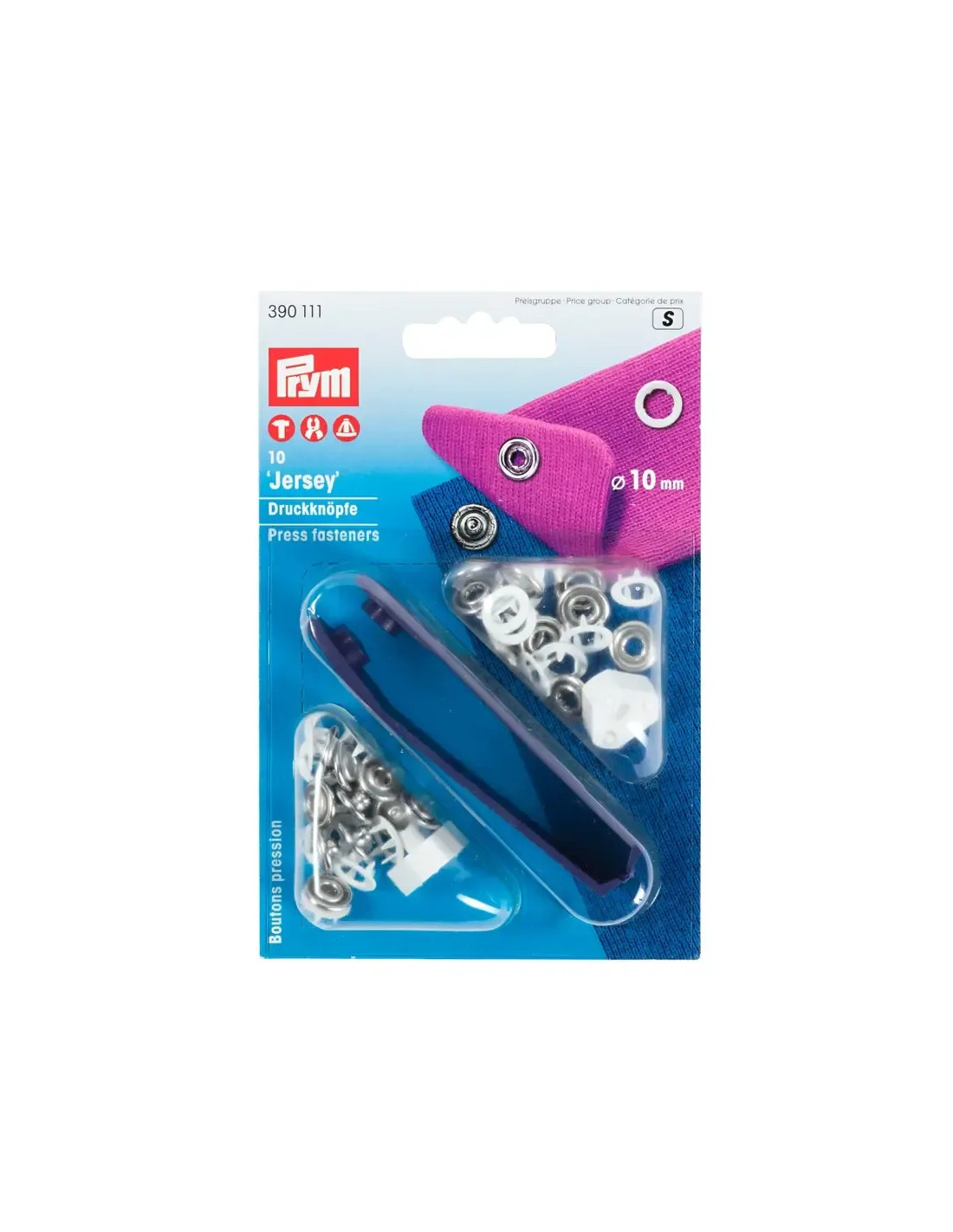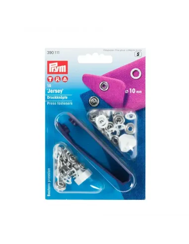 Les boutons pression « Jersey » de Prym sont caractérisés par leur force de fermeture souple à moyenne. Ils sont conçus spécialement pour les matériaux fins et élastiques tels que les vêtements bébé ou enfant. L’avantage de ce bouton pression est qu’il ne nécessite pas de percer un trou pour être posé : les boutons pression à griffes intégrés repoussent le tissu et permettent ainsi de ne pas l’abîmer. Le lavage, l’essorage, le nettoyage, le repassage à fer ou à rouleau ne posent aucun problème aux boutons pression inoxydables « Jersey » de chez Prym. Les boutons pression sont également disponibles en différents coloris et avec différents dessins. Les boutons pression de 18 mm ne peuvent être posés qu’avec l’outil fourni. Les boutons pression de 10 et 12 mm peuvent également être posés avec la pince VARIO à percer et à river ou le trépied Prym.