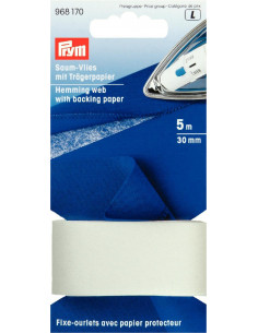 Ourler les robes, les manteaux, les jupes et les pantalons est possible sans aiguille ou machine à coudre grâce aux fixe-ourlets de Prym. Tout d'abord, l’entoilage est repassé avec le côté libre revêtu le long du bord du tissu et il est protégé par un papier de support. Après le retrait du papier de support, la ceinture peut être facilement rabattue et repassée. Le fixe-ourlets en 100 % polyamide est lavable jusqu’à 60 degrés. Il est disponible en quatre largeurs différentes (20 mm, 30 mm, 38 mm et 75 mm) par carte à une longueur de 5 m. Avec la largeur de 38 mm, Prym offre également l’entoilage thermocollant pratique en longueur de 50 m dans une cassette.