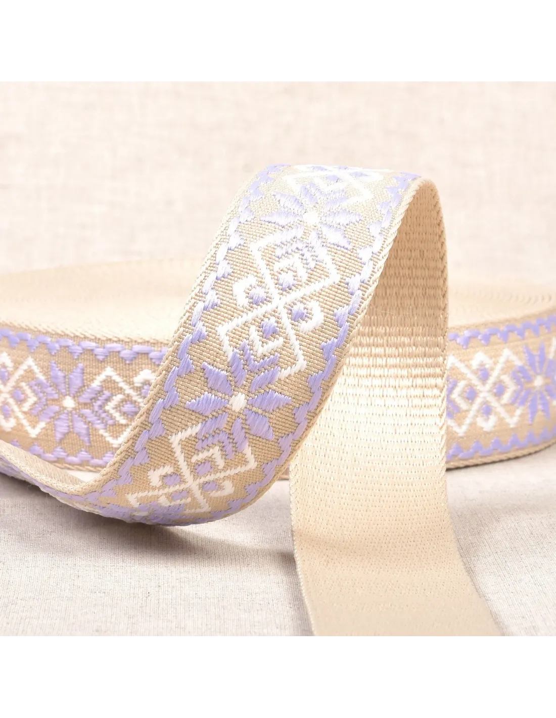 Sangle fleurs, ethnique, 38mm, parme/beige