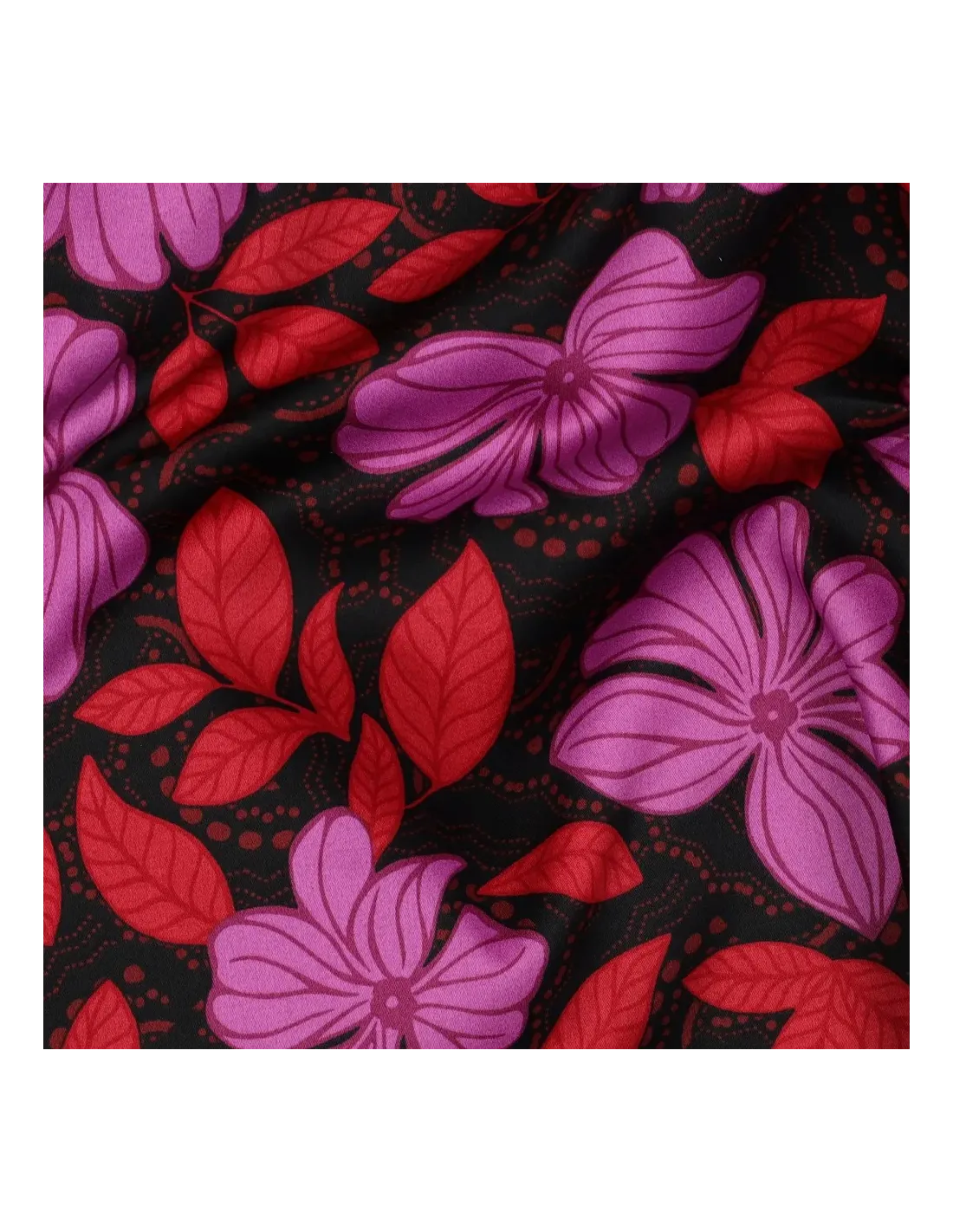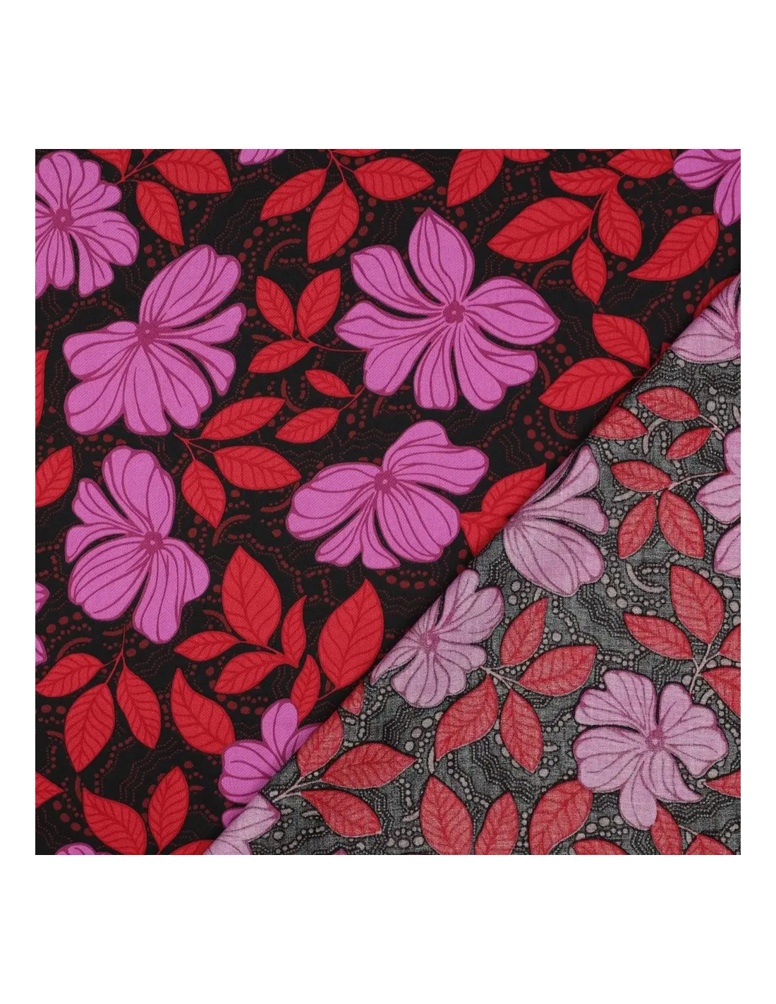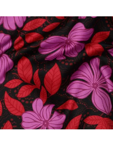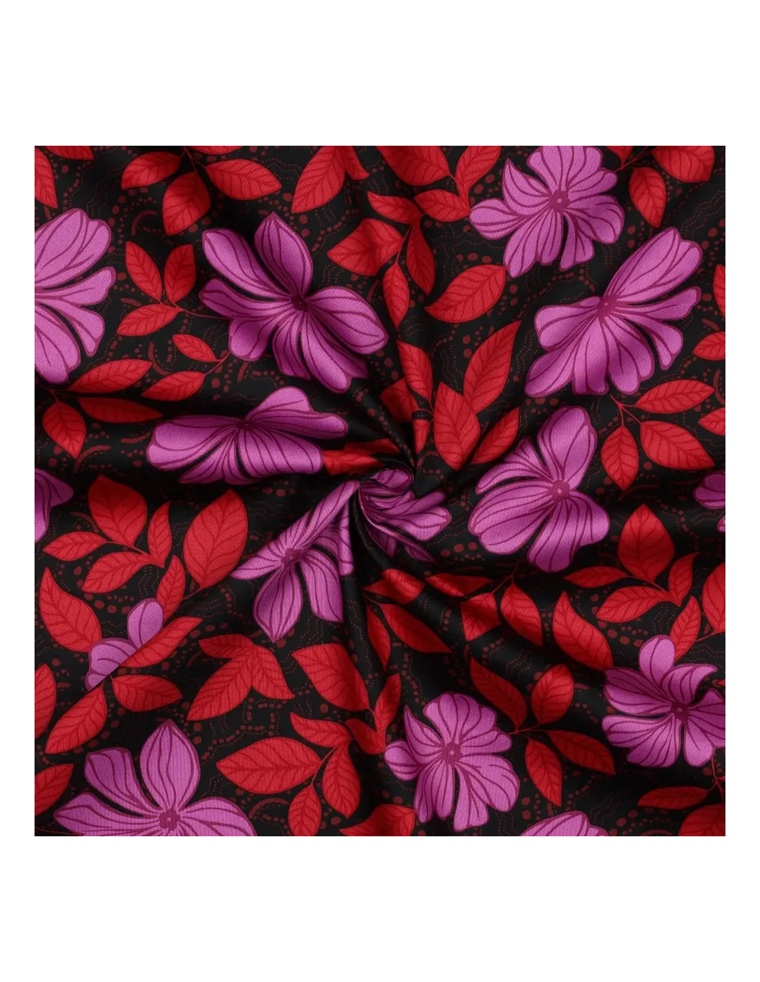 Découvrez l'élégance mystérieuse de ce satin de coton, un tissu qui allie la douceur et le raffinement. Sur un fond noir profond, des motifs floraux se déploient avec un contraste saisissant : des fleurs aux délicates teintes mauves se mêlent à des feuilles d'un rouge intense. Ce design audacieux et sophistiqué est parfait pour des créations à la fois chic et pleines de caractère.