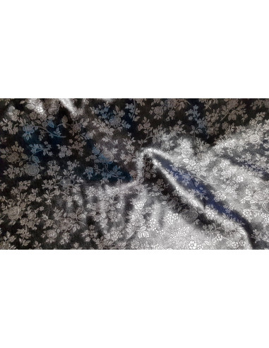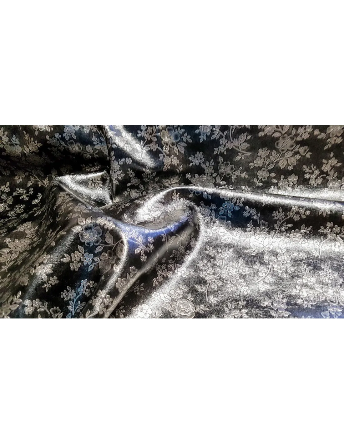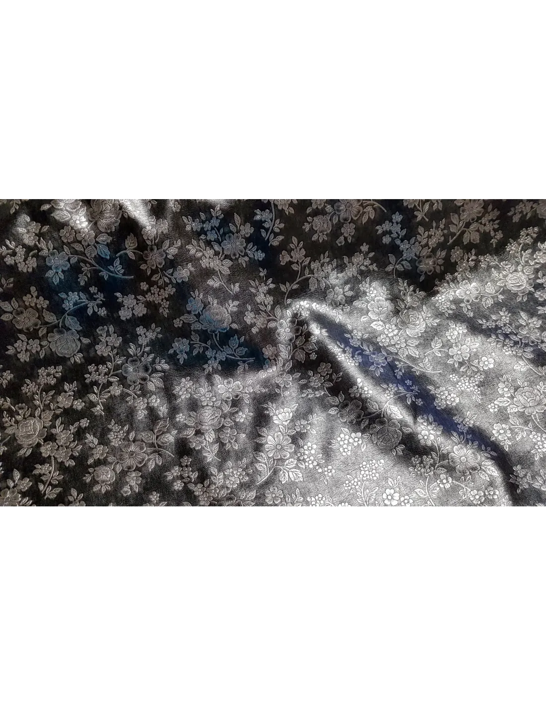 Très beau simili cuir d'habillement avec des fleurs argentés sur fond gris-noir. Du plus bel effet. Ce tissu est assez souple et peu s'utiliser pour l'habillement (jupe, haut, veste...)