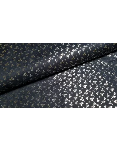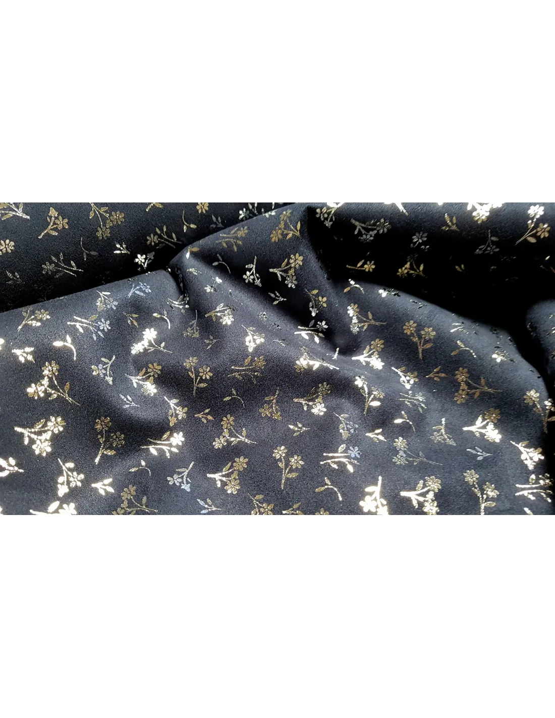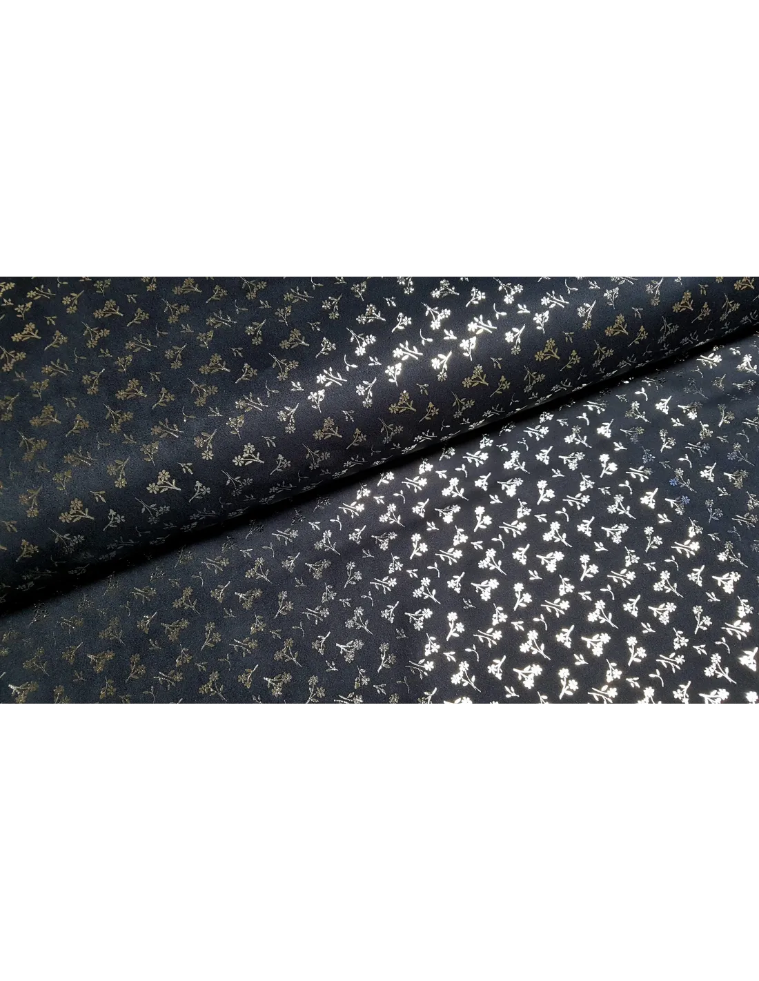 Belle suédine stretch à imprimés fleurs argentées sur fond bleu marine .