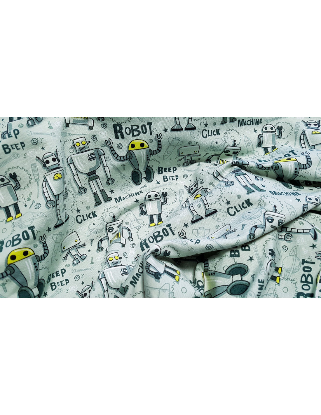 Magnifique French Terry à imprimés robots sur fond vert olive. Ce tissu jersey épais ou sweat léger est idéal pour la confection de t-shirt, sweat, jogging...