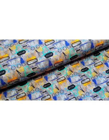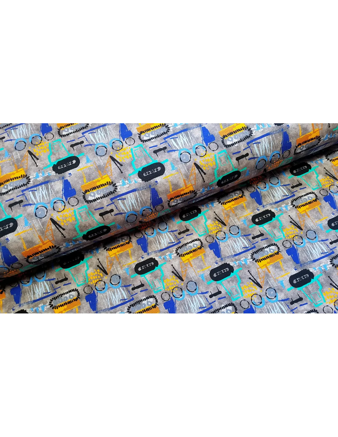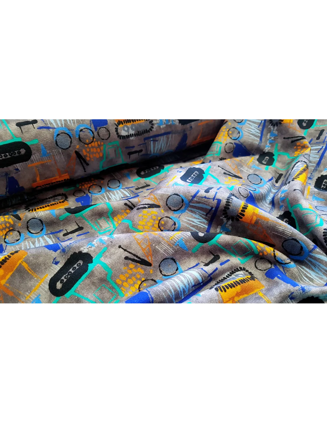 Sweat (french terry) avec engins de chantier. Ce tissu moyennement chaud est idéal pour la confection de sweat, jogging…