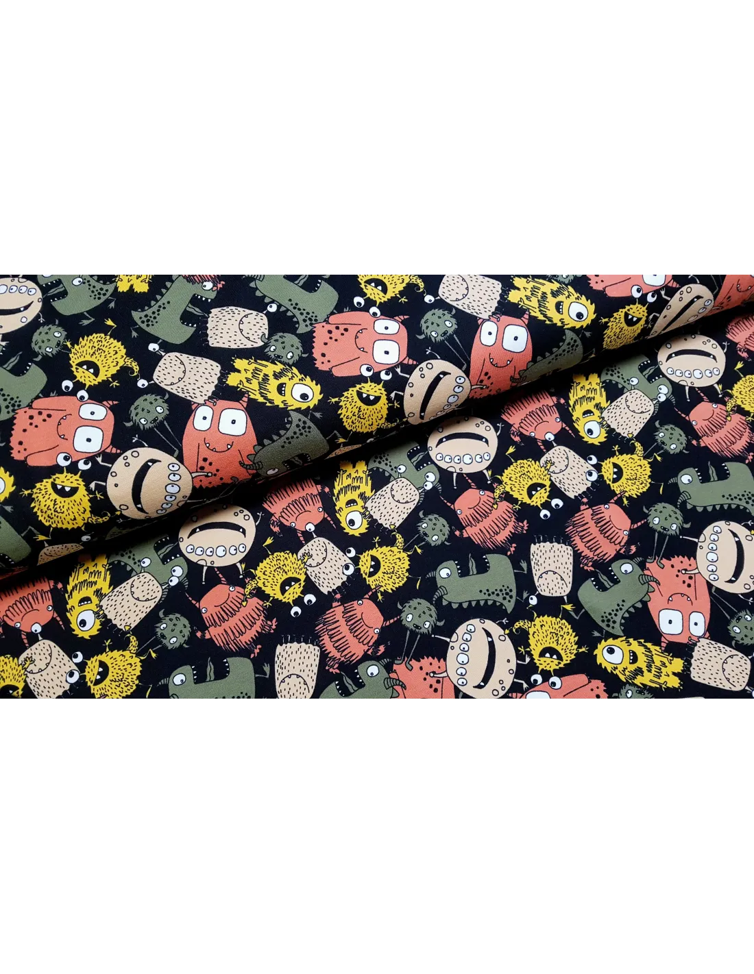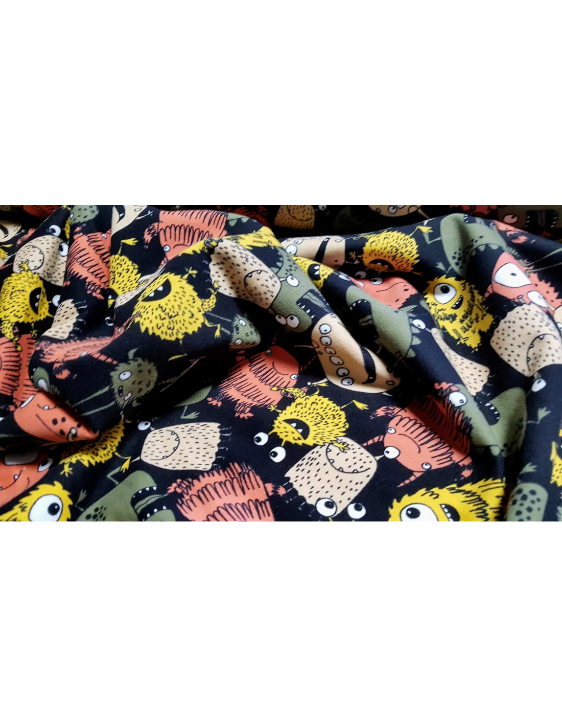 French Terry monstres rigolos sur fond noir. Ce tissu jersey épais ou sweat léger est idéal pour la confection de t-shirt, sweat, jogging...