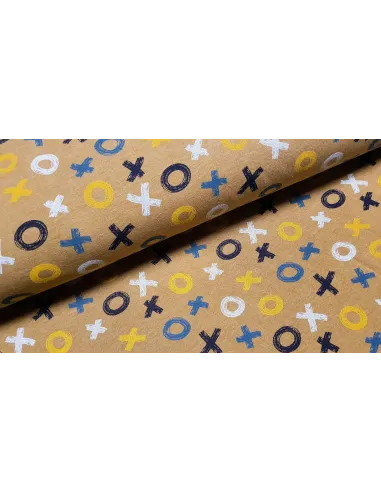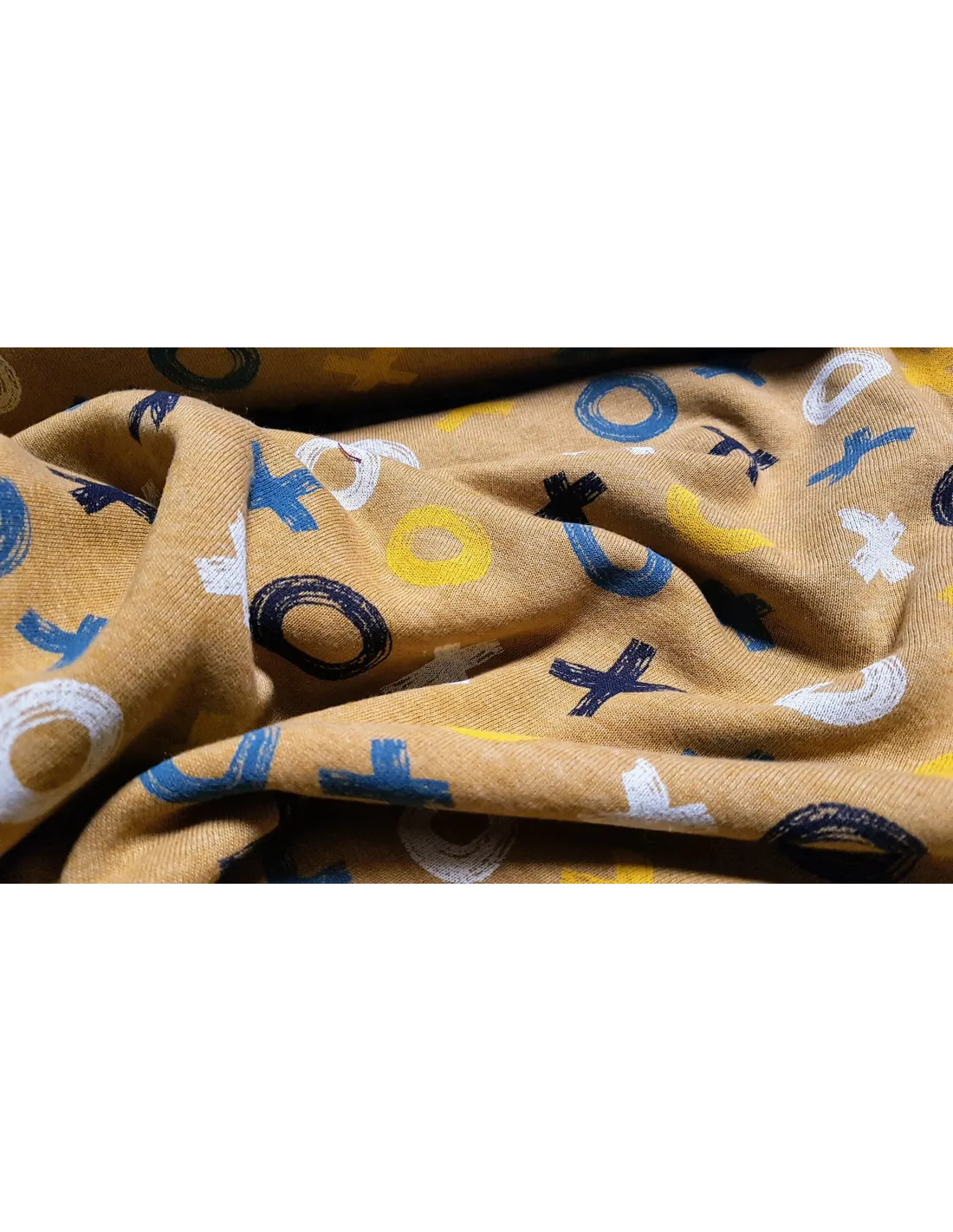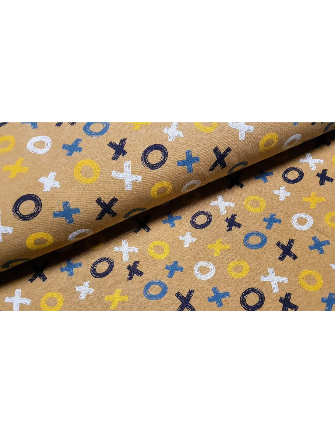 French Terry imprimé XOXO sur fond ocre. Ce tissu jersey épais ou sweat léger est idéal pour la confection de t-shirt, sweat, jogging...