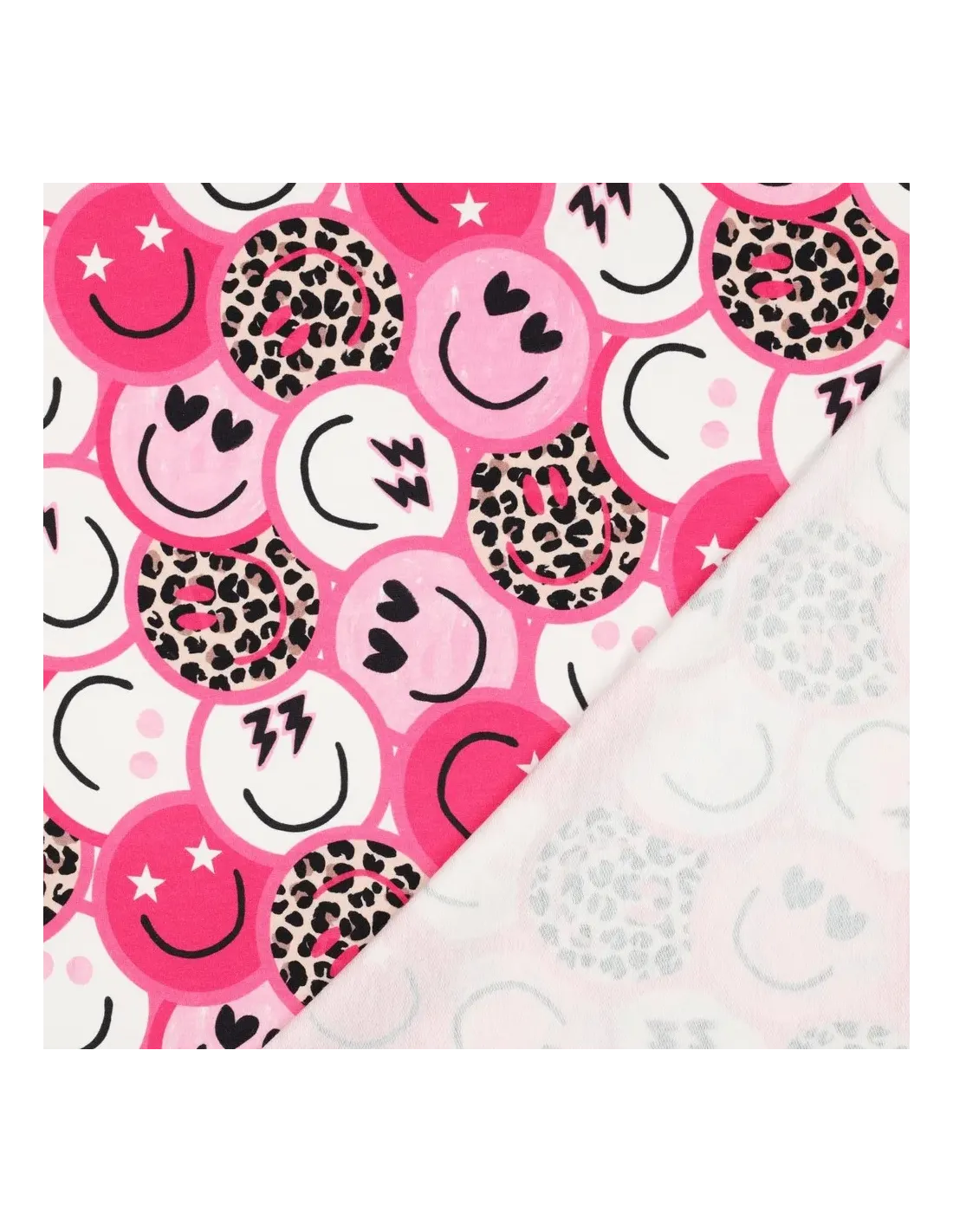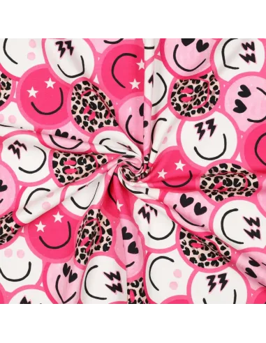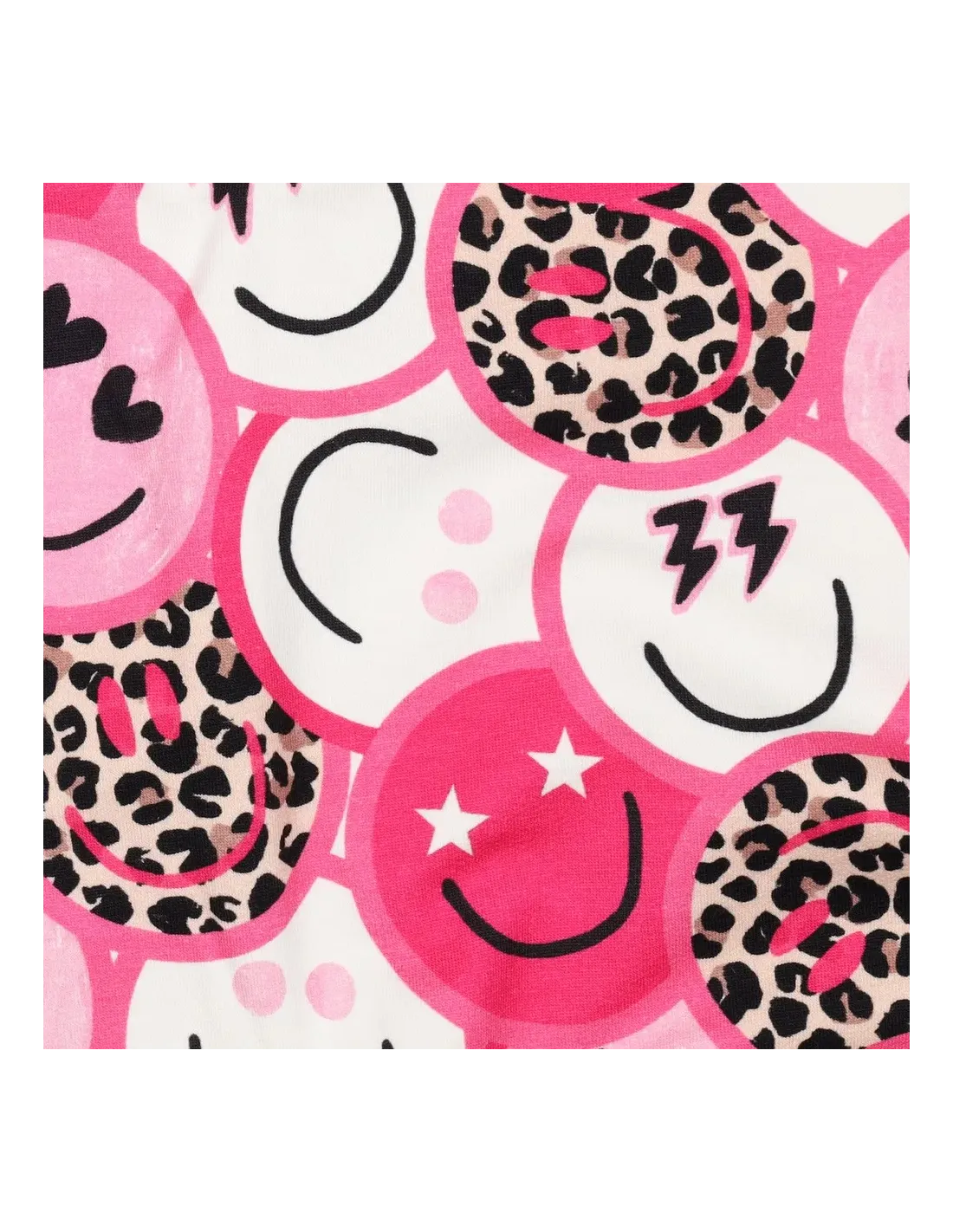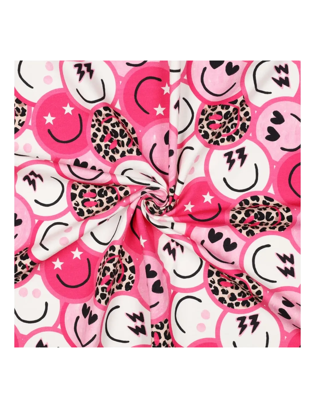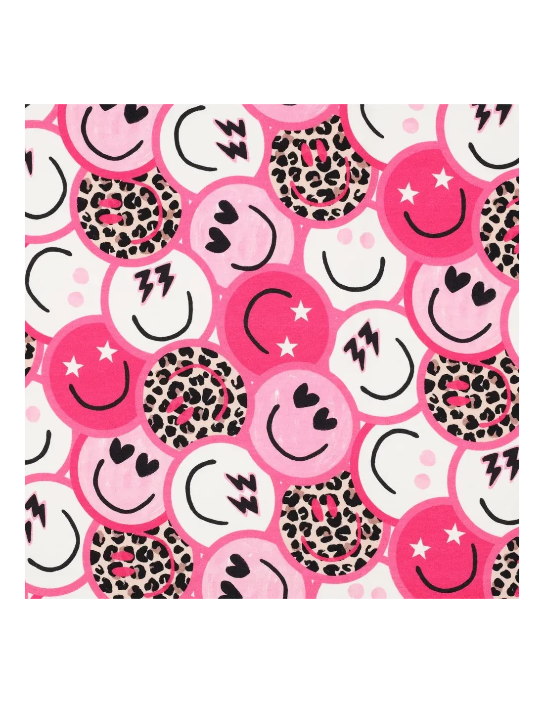L'imprimé smileys rose et léopards est réalisé en impression digitale de haute qualité. Cette technique garantit une excellente fidélité des couleurs et des motifs, qui resteront vifs même après de nombreux lavages. Le mélange inattendu de ces deux motifs est parfait pour créer une pièce forte et tendance qui ne passera pas inaperçue.