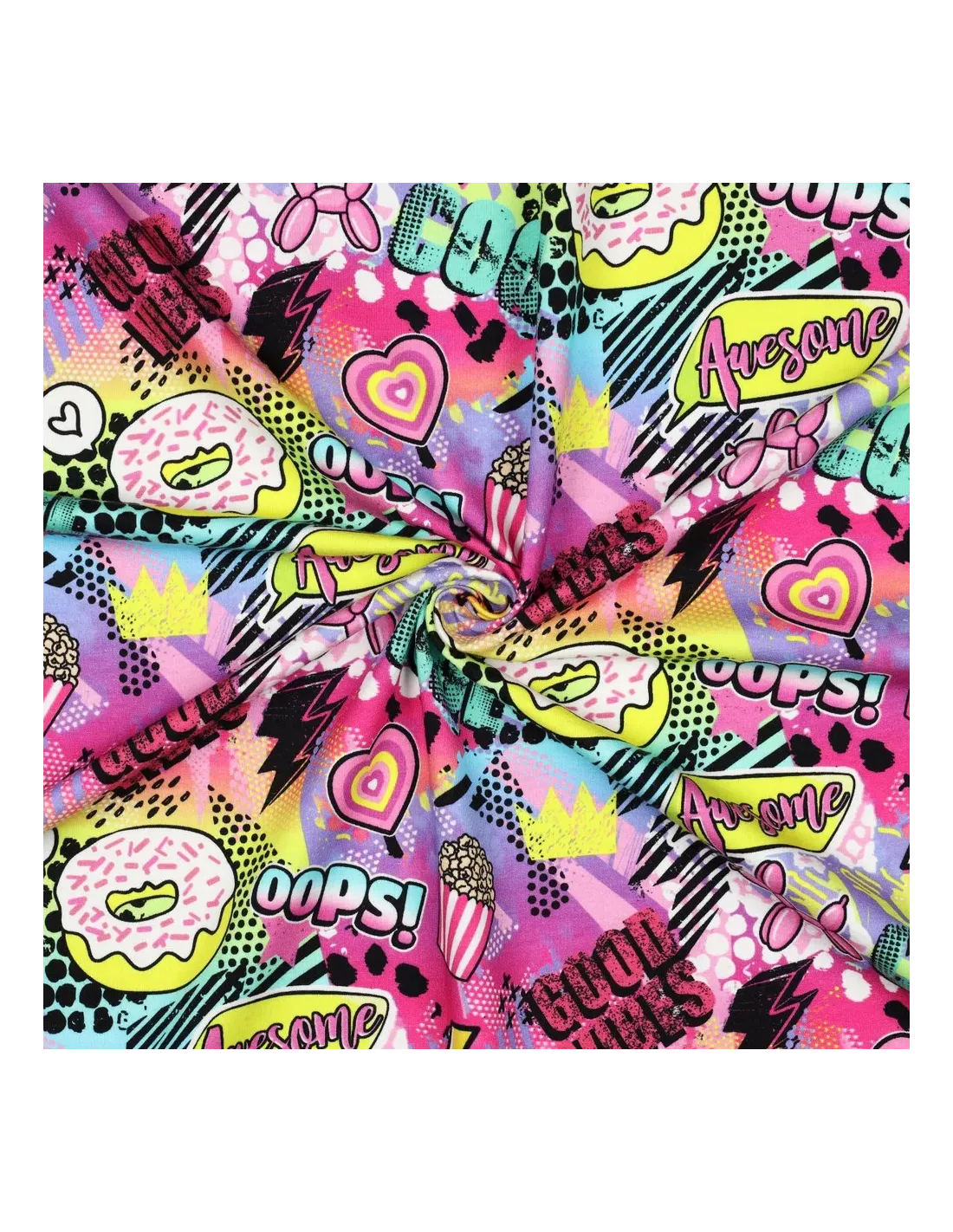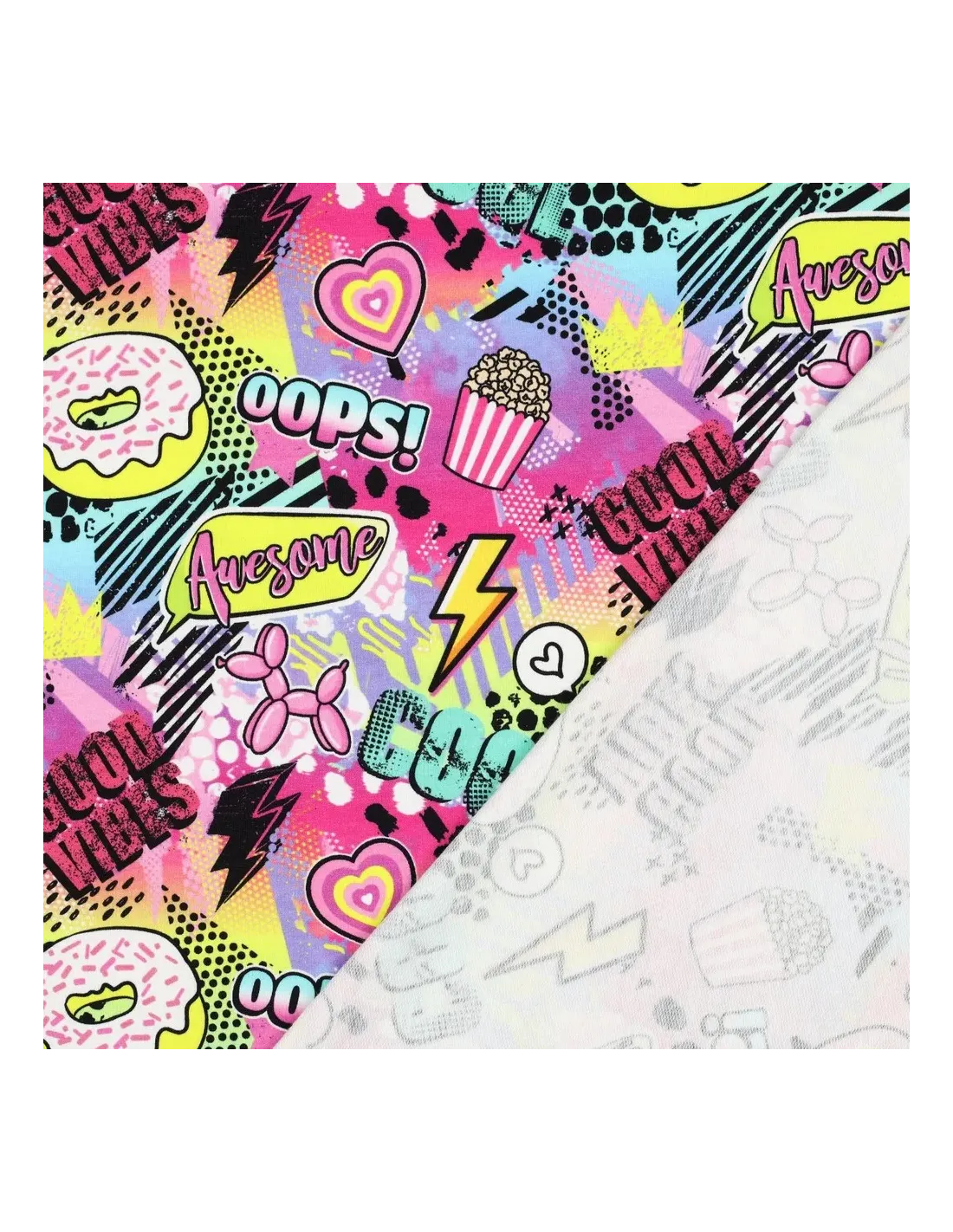 Découvrez la douceur et le style urbain de ce French Terry en coton, un tissu parfait pour des créations qui ne passent pas inaperçues. Son motif pop et audacieux est une explosion de couleurs vives (rose, orange, mauve, jaune), mettant en scène des éléments graphiques inspirés de la culture pop, des cœurs et des éclairs. Un design plein d'énergie pour des vêtements qui ont du caractère.