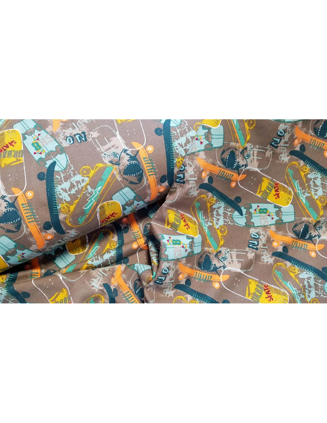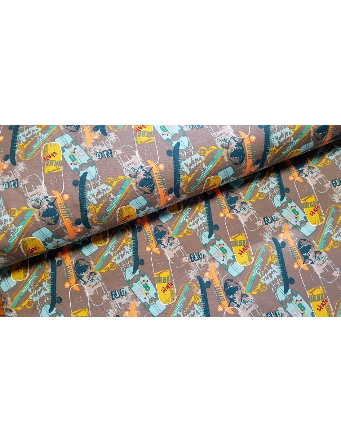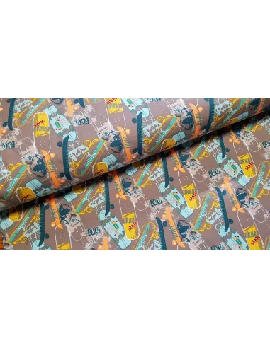 Beau tissu sweat bio, à imprimés skateboards tons verts sur fond marron