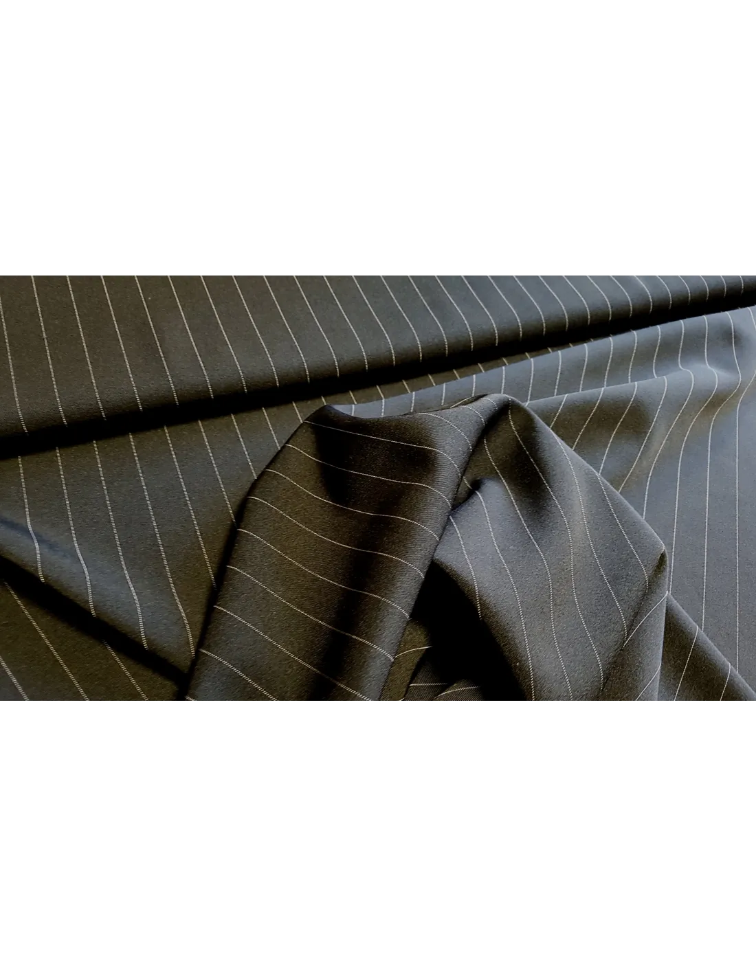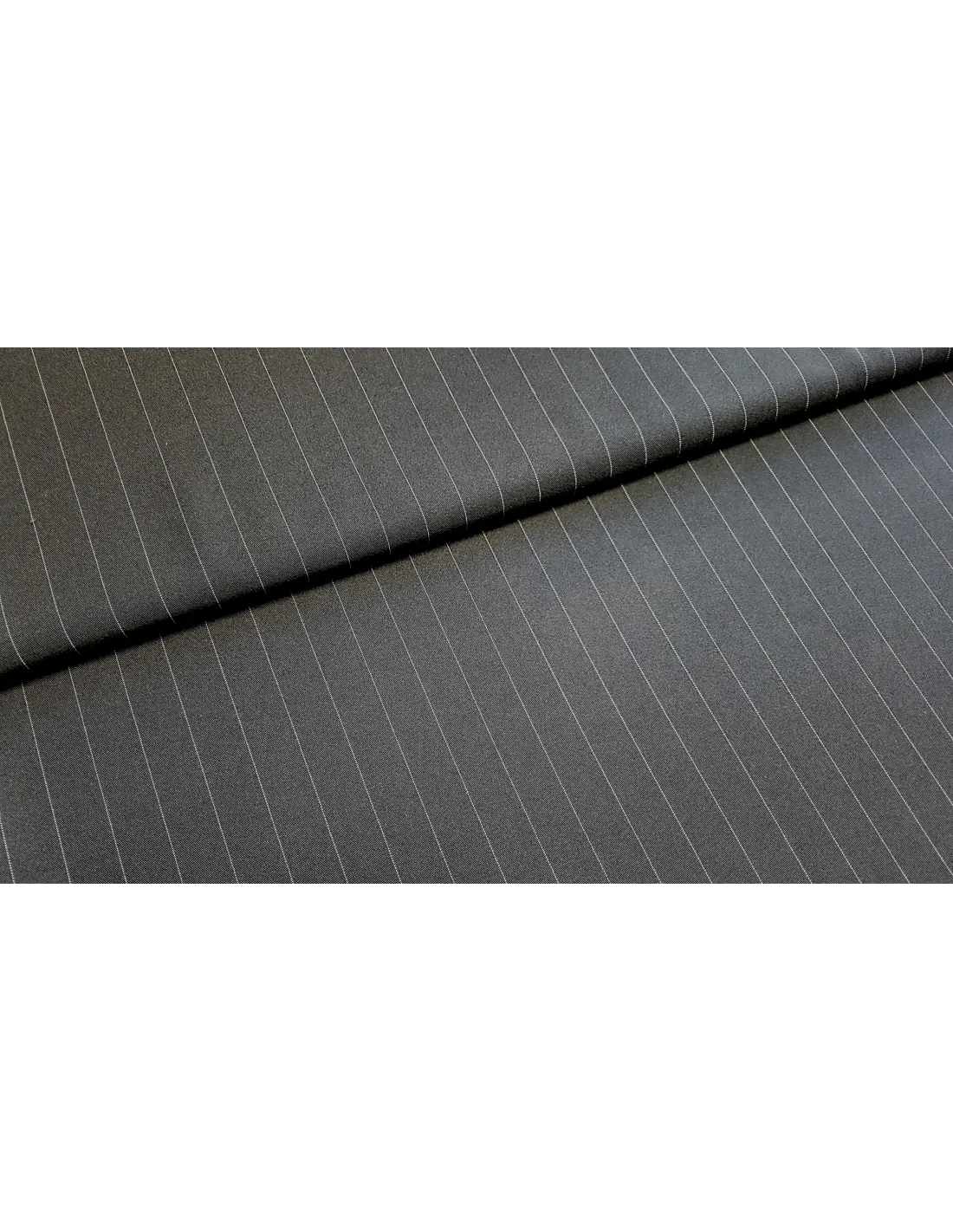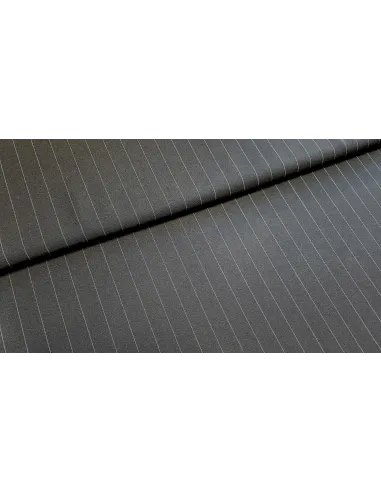 Beau tissu tailleur avec fines rayures blanches sur fond gris. Ce tissu possède une bonne fluidité pour la confection de pantalons, vestes et jupes tailleur.