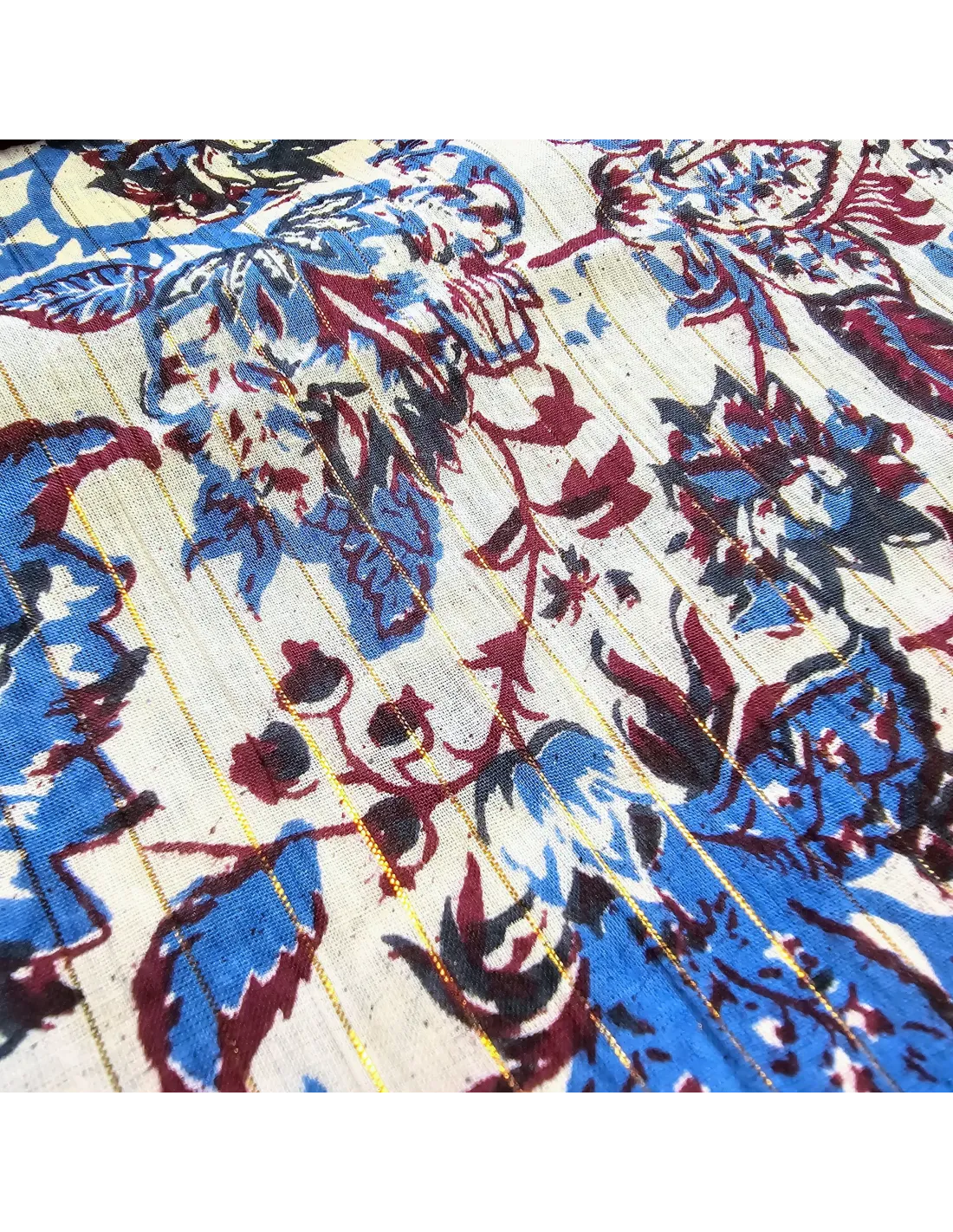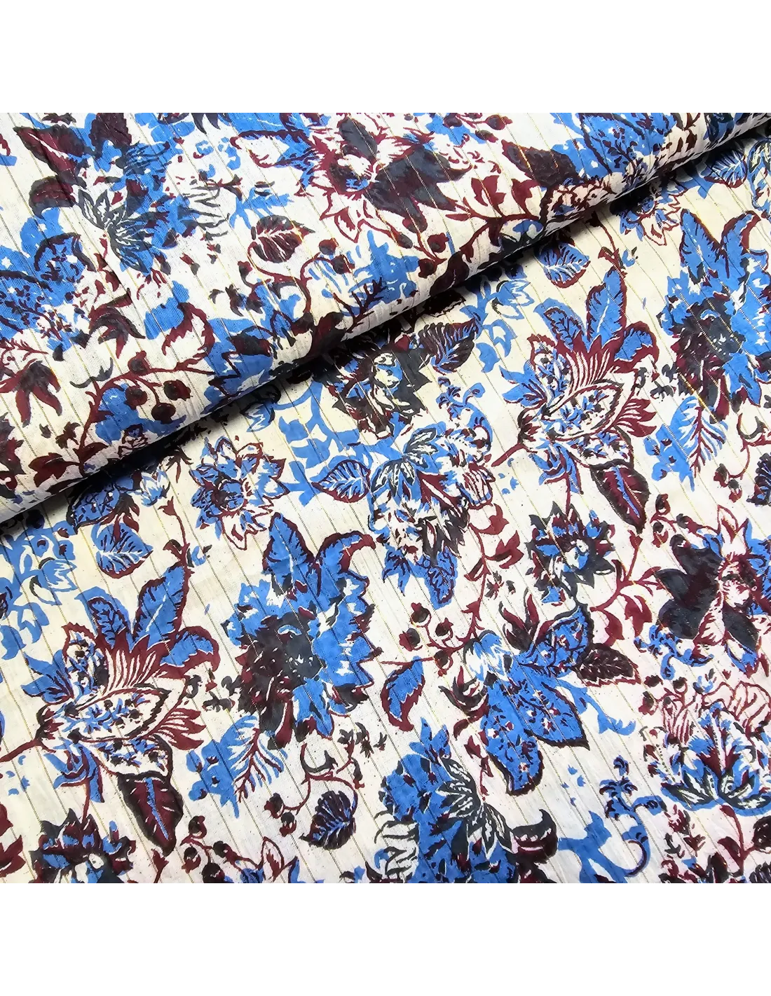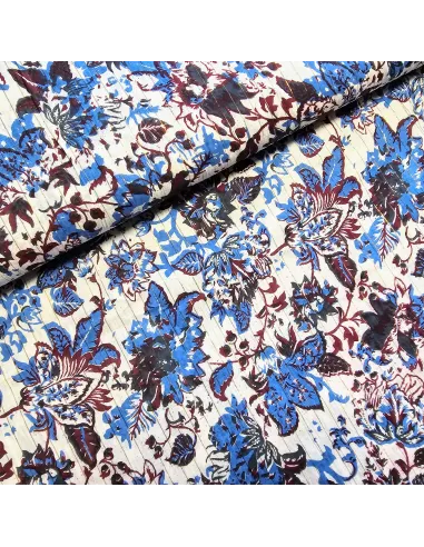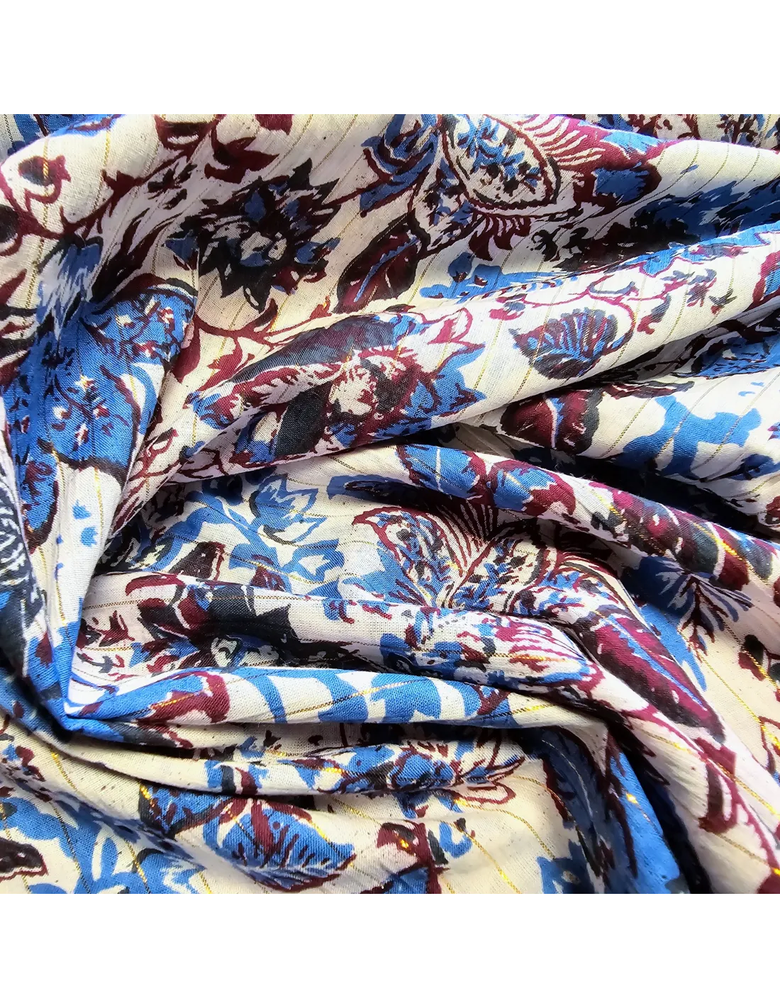 Laissez-vous envoûter par le charme profond de notre Voile de Coton Indien ! Ce tissu fin est une véritable œuvre d'art textile. Son imprimé floral d'inspiration block print associe des fleurs bleues intenses et des motifs de feuilles et de tiges dans des tons riches de bordeaux/lie-de-vin et de noir. Le tout est subtilement rehaussé par des fils de Lurex tissés qui ajoutent une note d'éclat discret et sophistiqué.