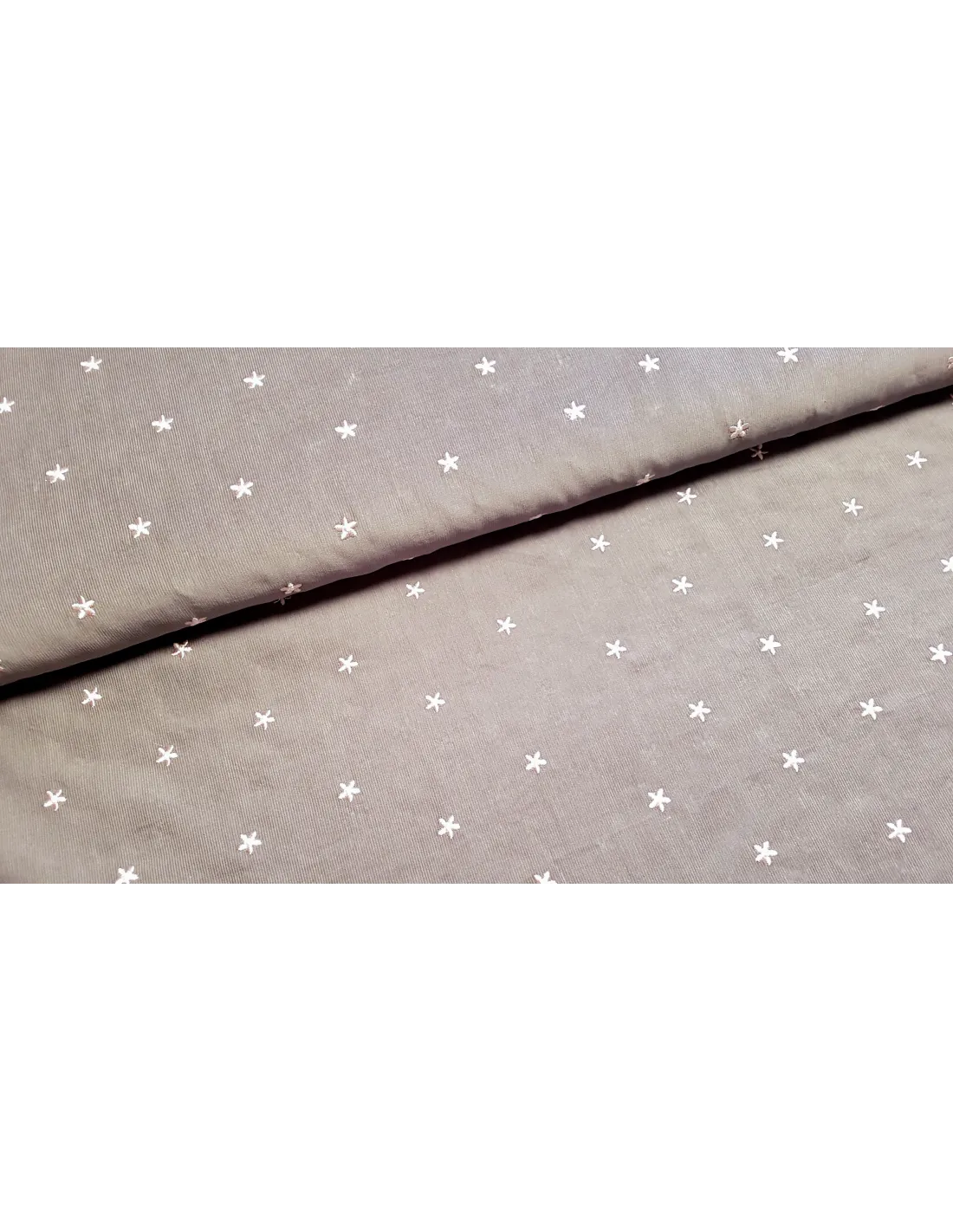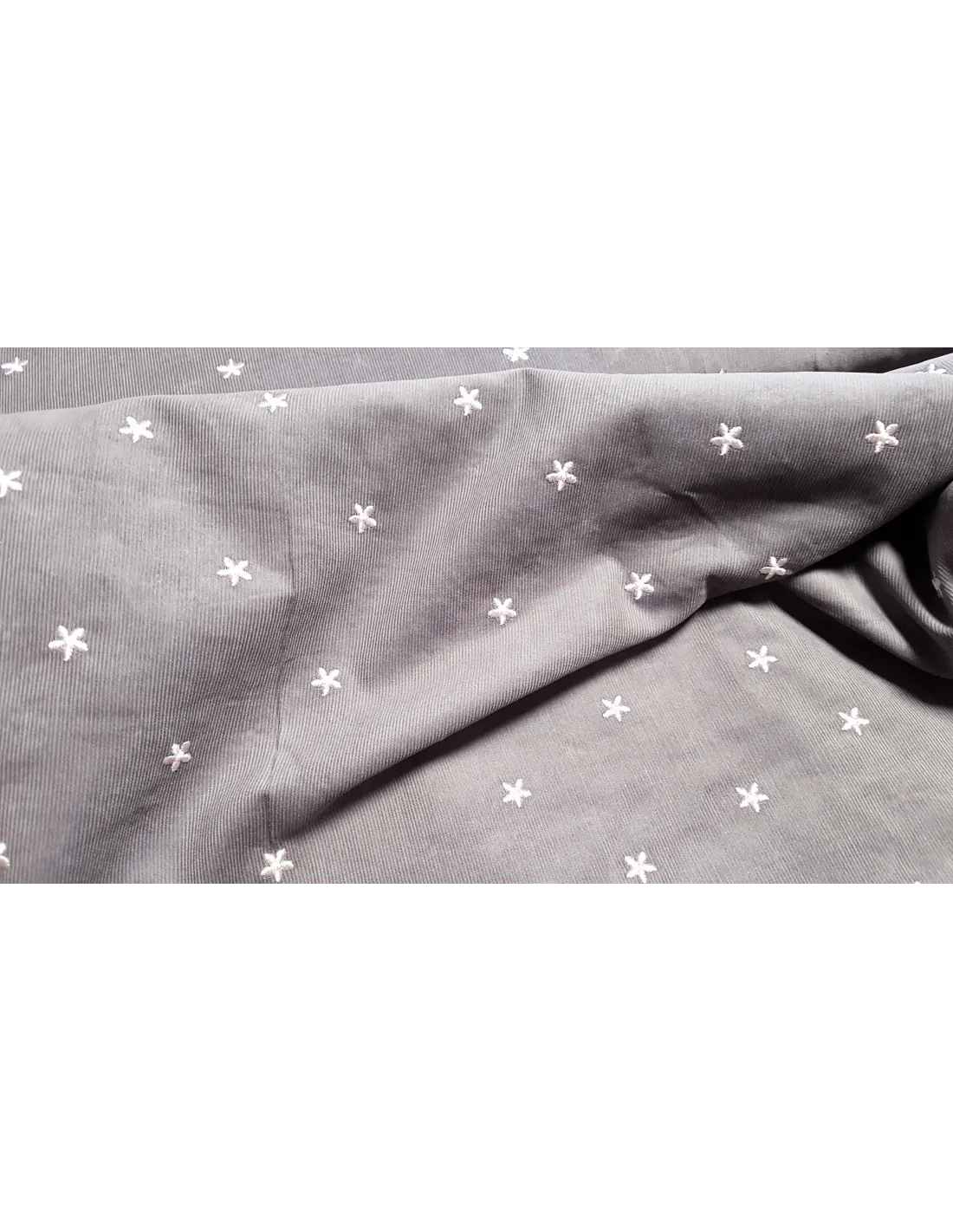Beau velours milleraies à imprimés petites fleurs brodées roses sur fond gris moyen.