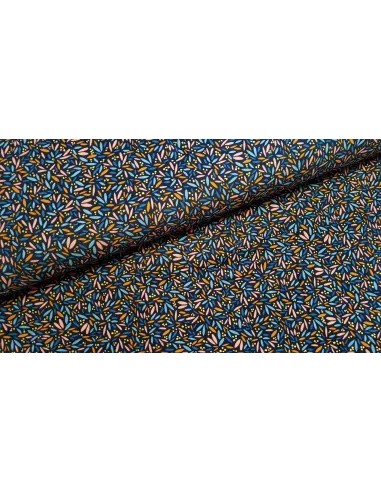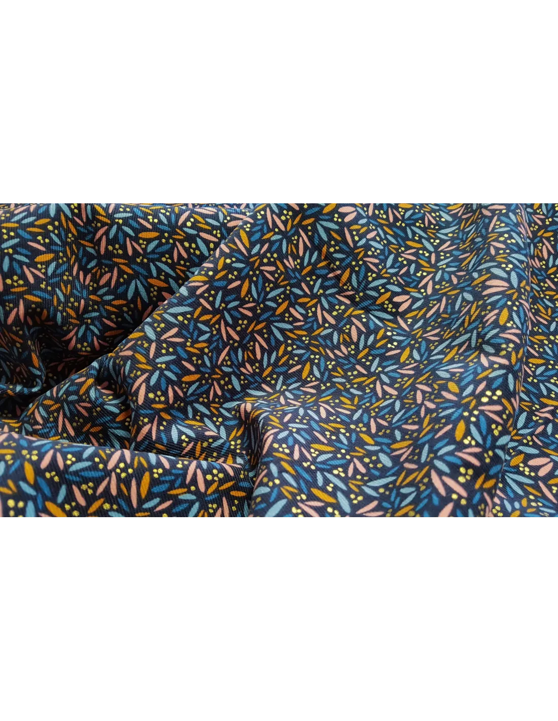 Velours milleraies avec de petites de petites feuilles et points dorés. Ce tissu est parfait pour la confection de pantalons, robes,...