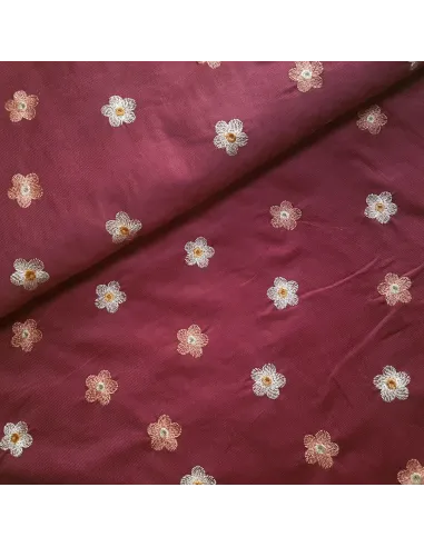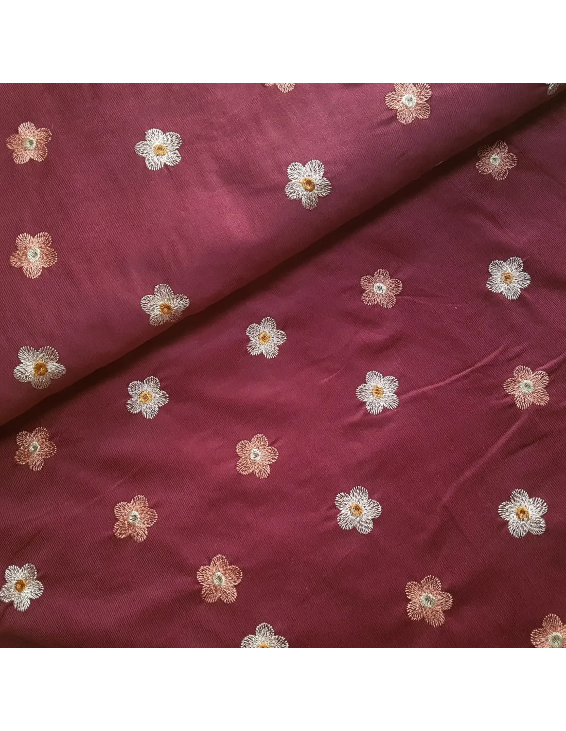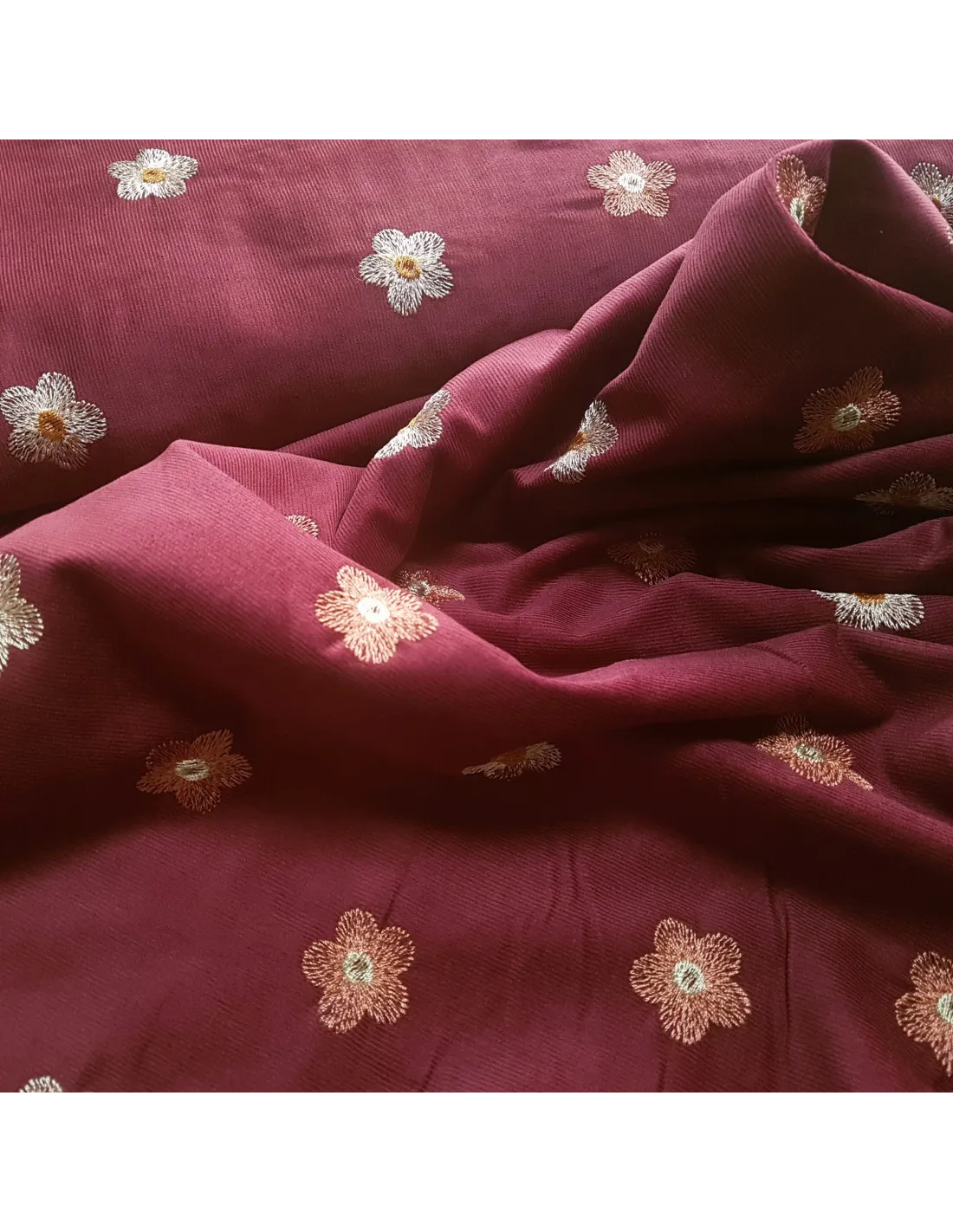 Velours milleraies prune avec des fleurs brodées roses et blanches. Ce tissu est parfait pour la confection de pantalons, robes,...