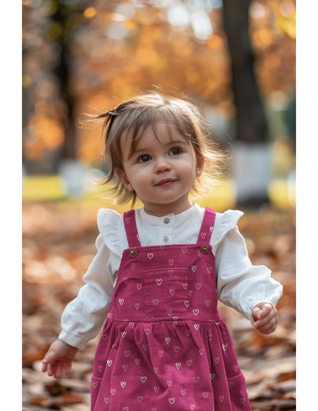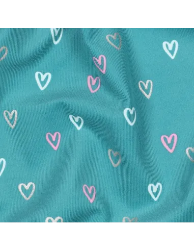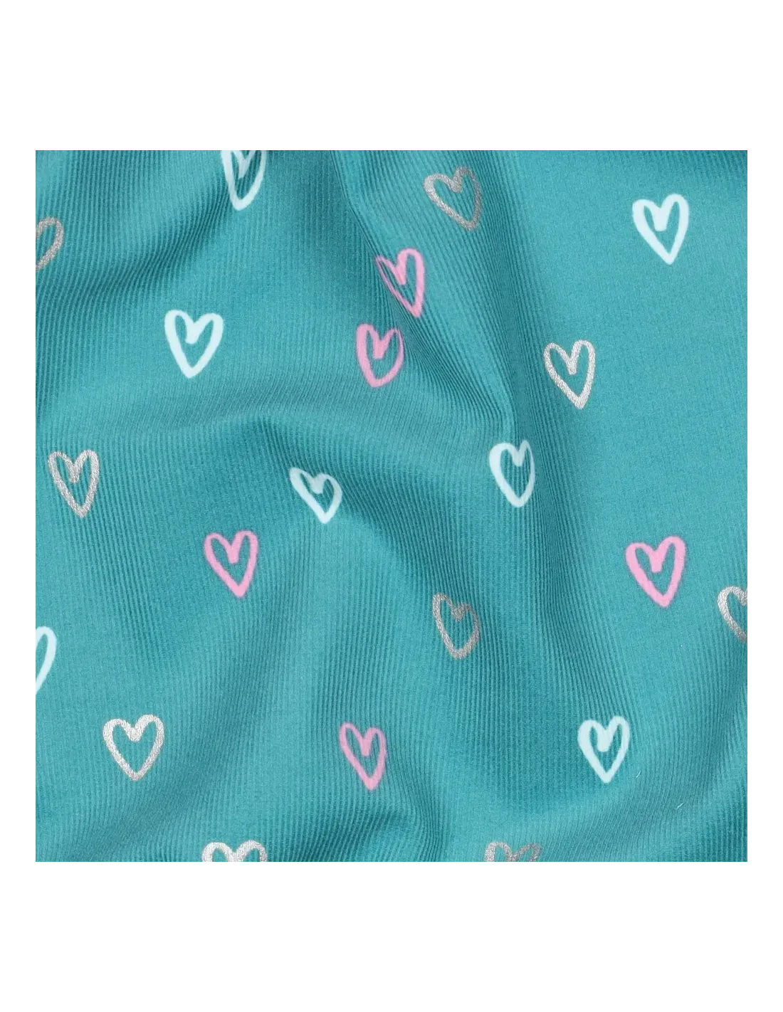 Ce tissu est un velours milleraies, caractérisé par ses fines côtes, imprimé de motifs de cœurs et idéal pour la confection de vêtements structurés pour enfants ou adultes, ainsi que pour des accessoires doux et confortables.