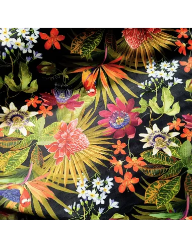 Velours d'ameublement, d'excellente qualité. Motifs fleurs exotiques sur fond noir. Ce tissu est parfait pour la confection de rideaux, coussins, dessus de lits...