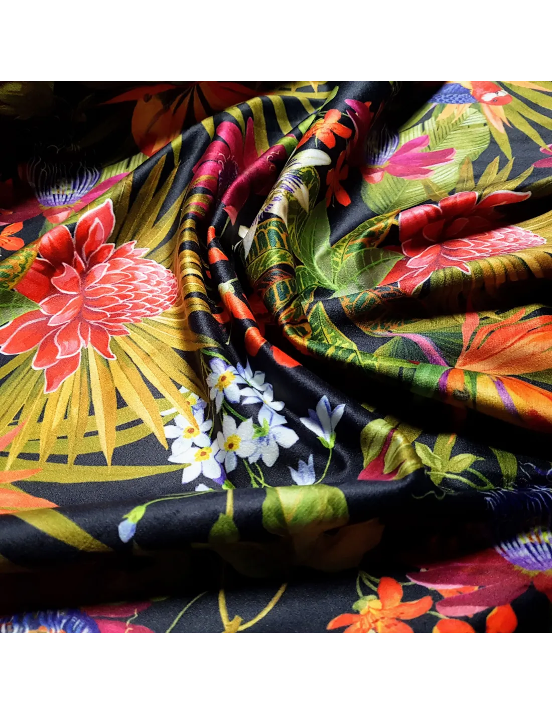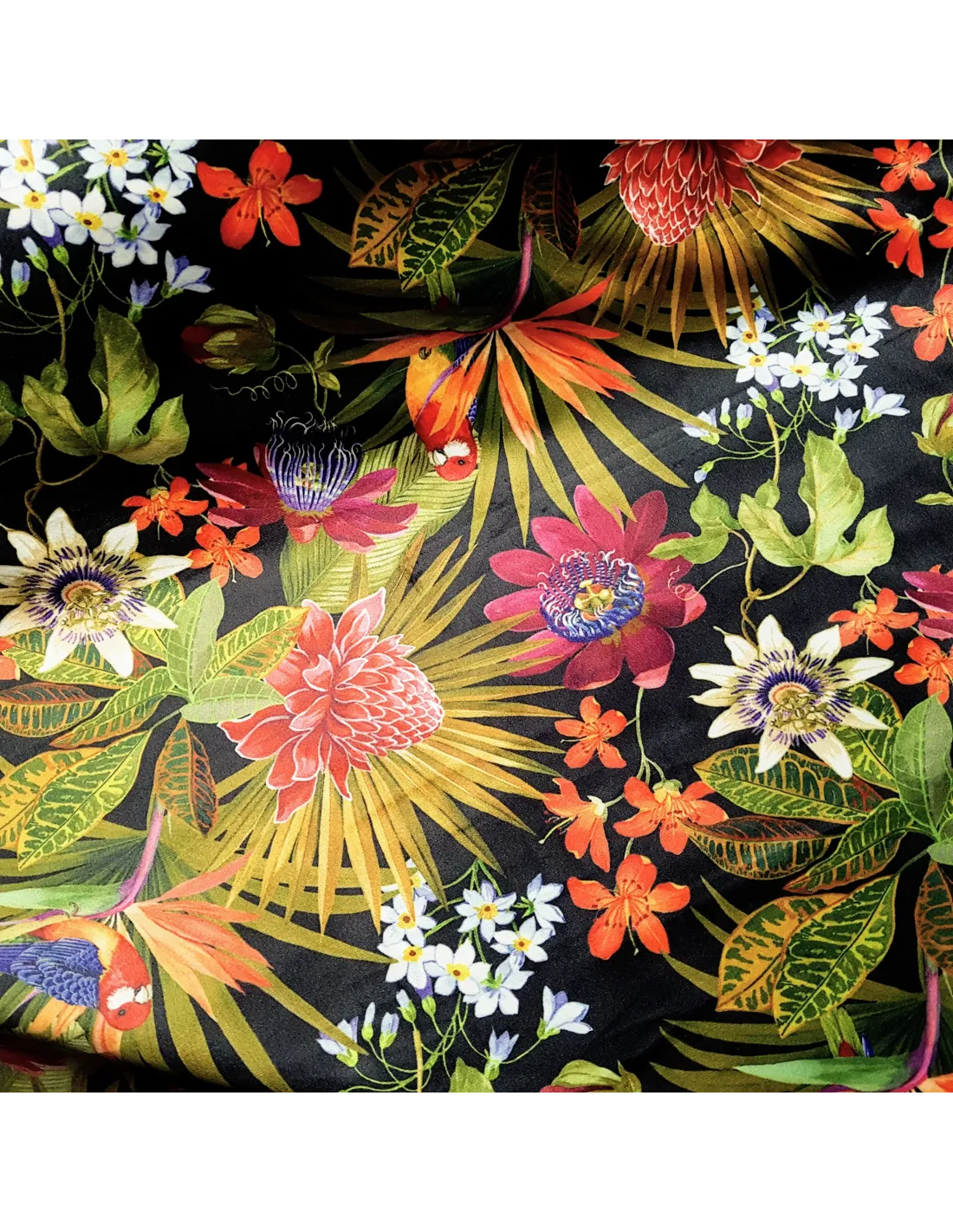 Velours d'ameublement, d'excellente qualité. Motifs fleurs exotiques sur fond noir. Ce tissu est parfait pour la confection de rideaux, coussins, dessus de lits...
