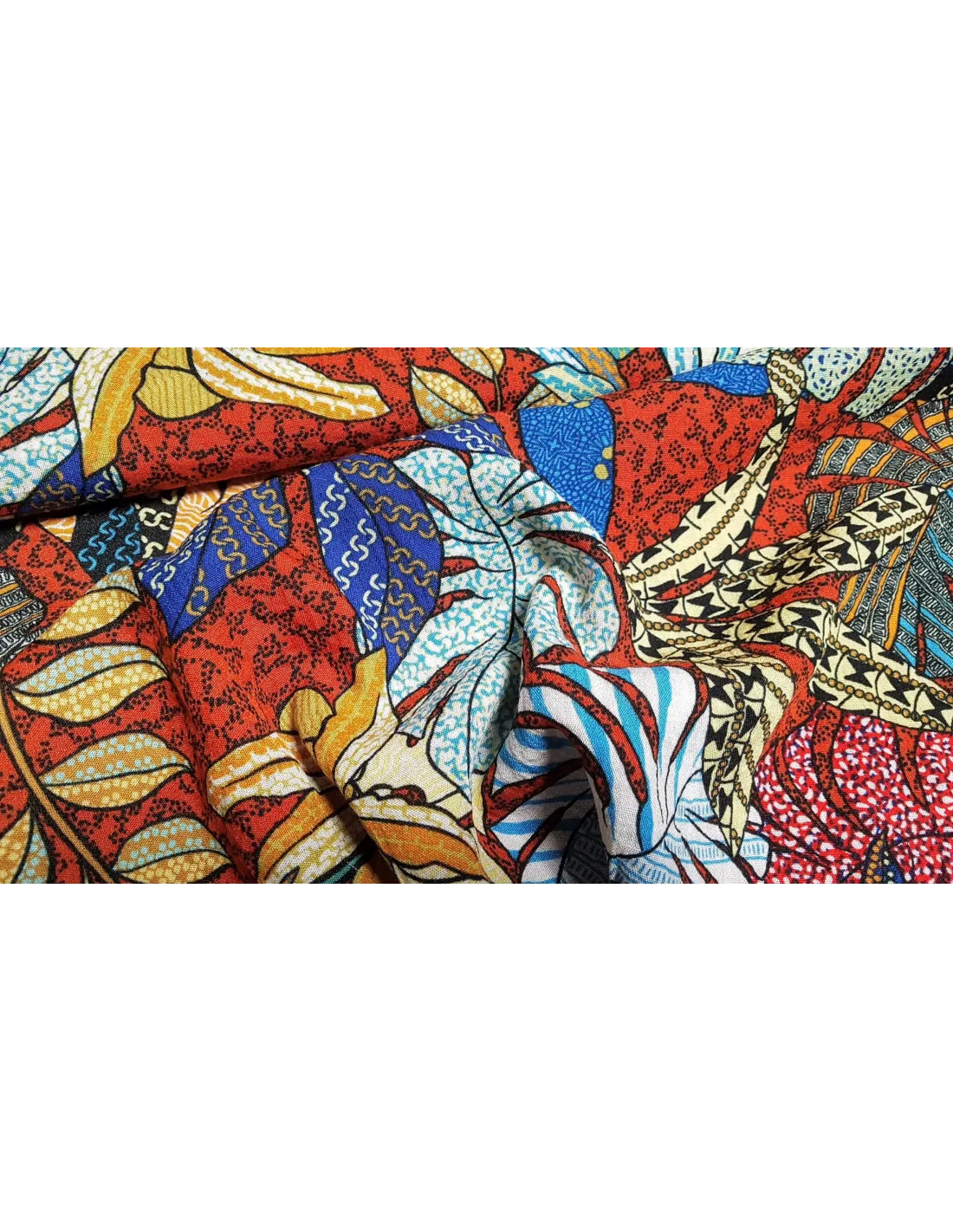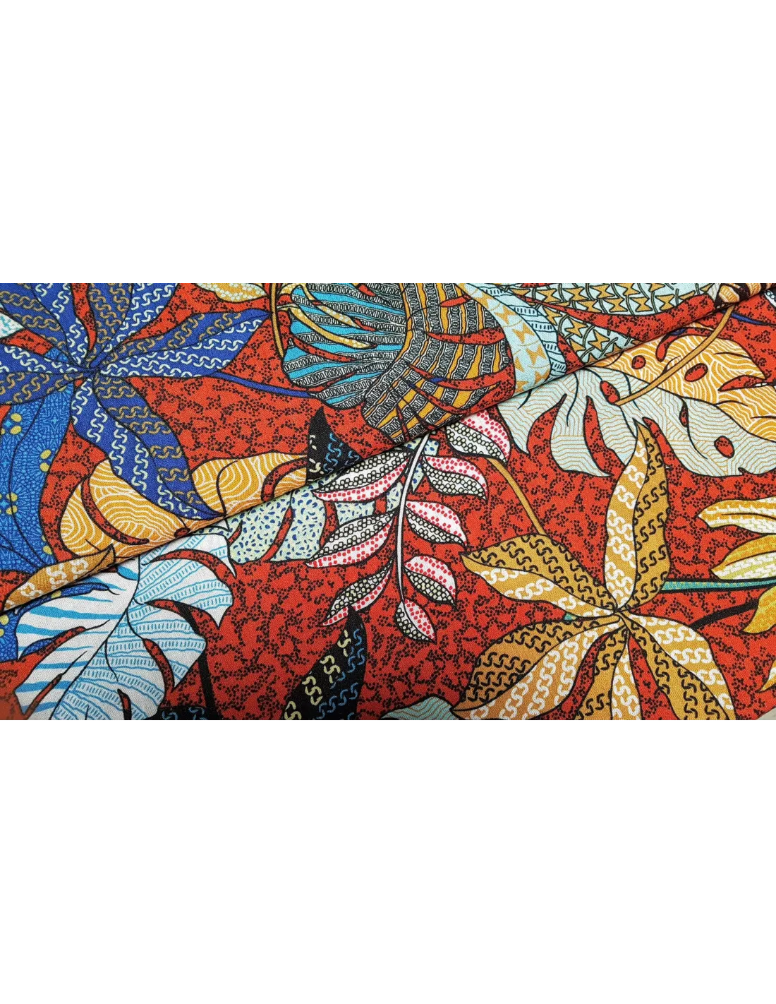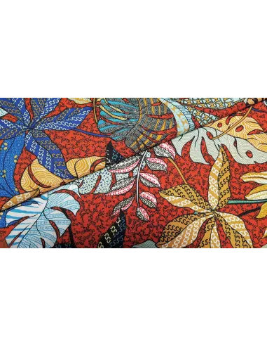 Jolie tissu viscose fleuri style wax sur fond terracota. Ce tissu léger est idéale pour la confection de vêtements d’été comme des robes...