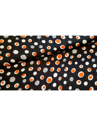 Joli tissu viscose aux motifs cercles colorés sur fond noir. Ce tissu léger est idéal pour la confection de vêtements d'été comme des chemisiers…