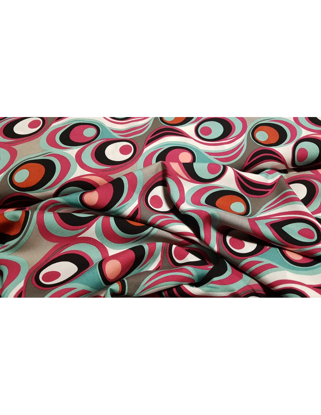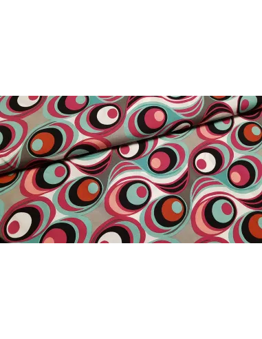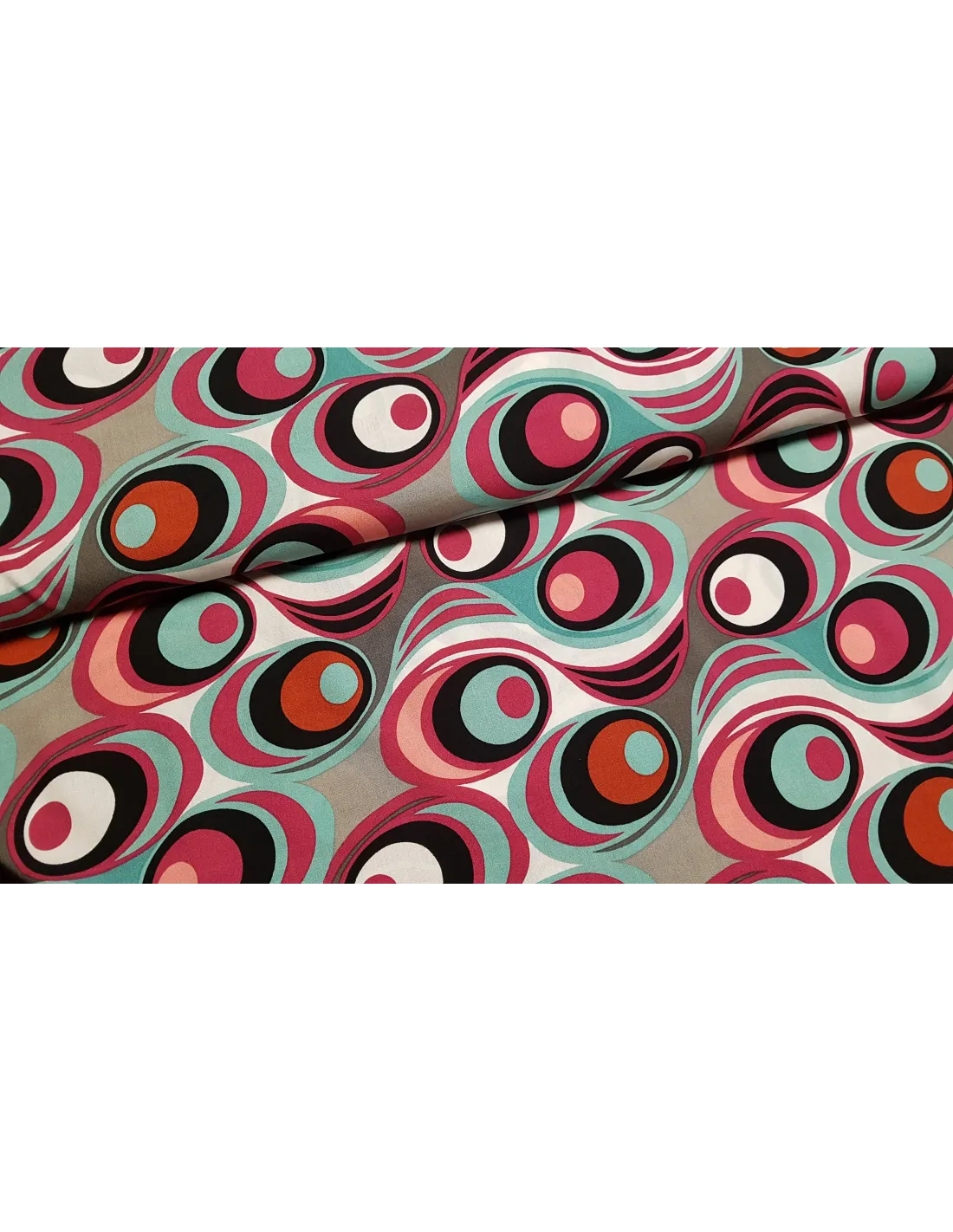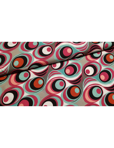 Tissu viscose au motifs 70's. Ce tissu est léger, très coloré, parfait pour le confection de vêtements d'été.