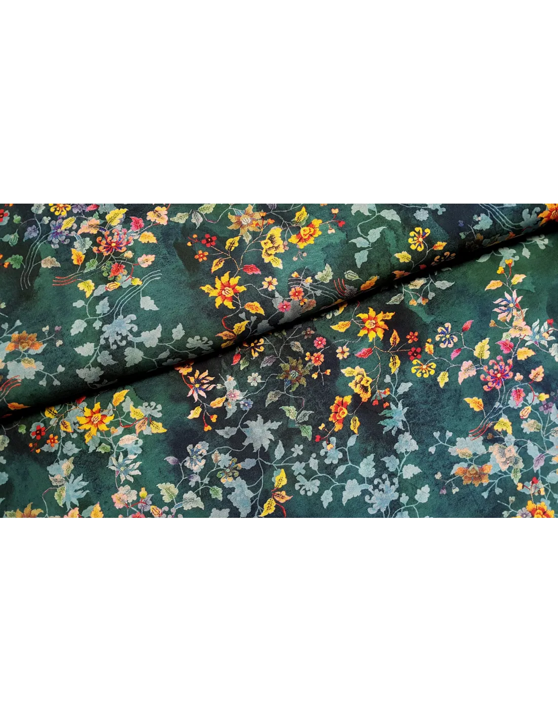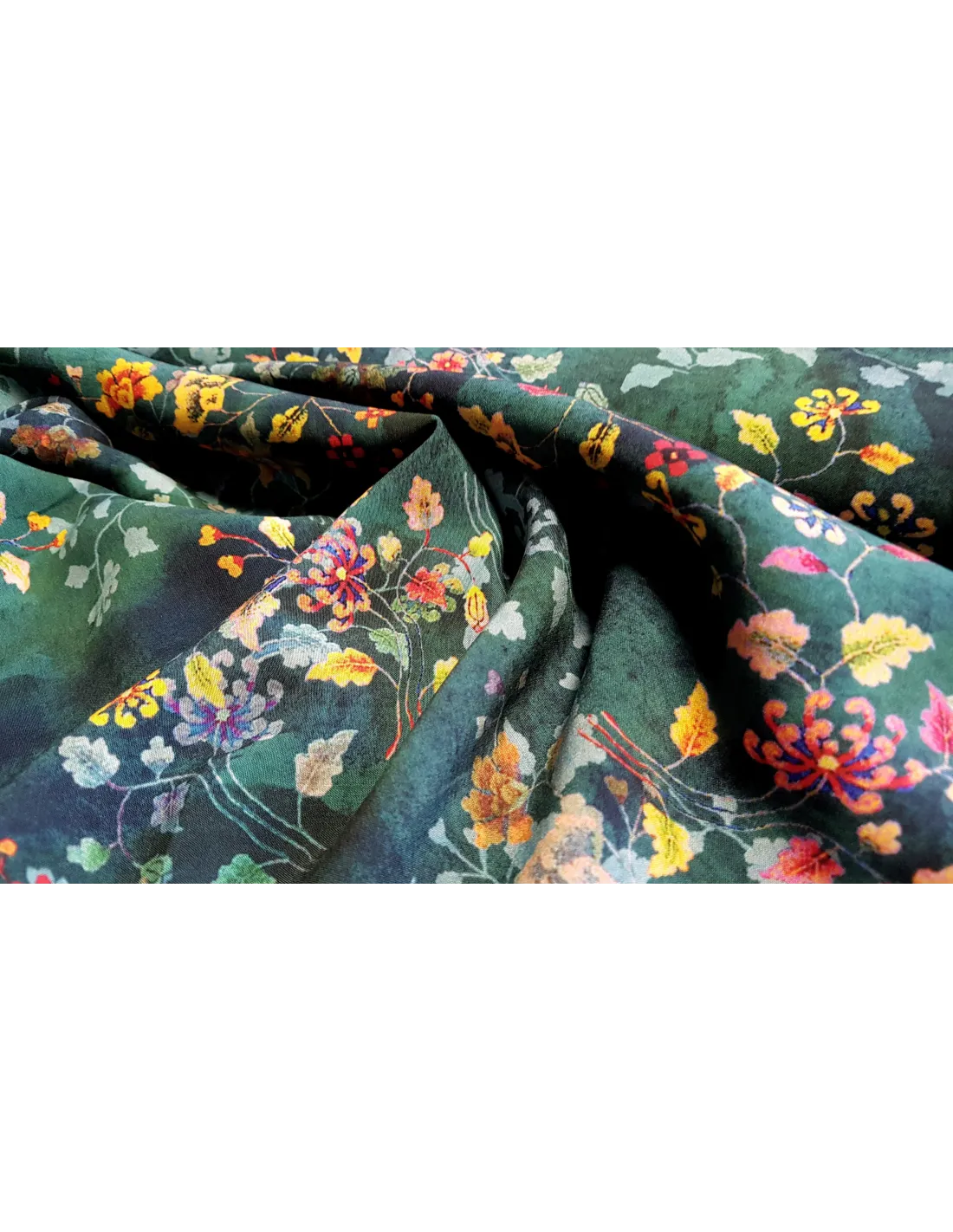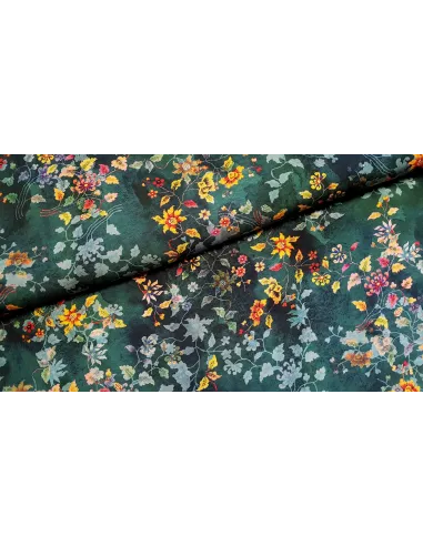 Tissu viscose, imprimé feuillage et fleurs sur fond vert émeraude. Parfait pour une robe, un pantalon d'été, une chemise...