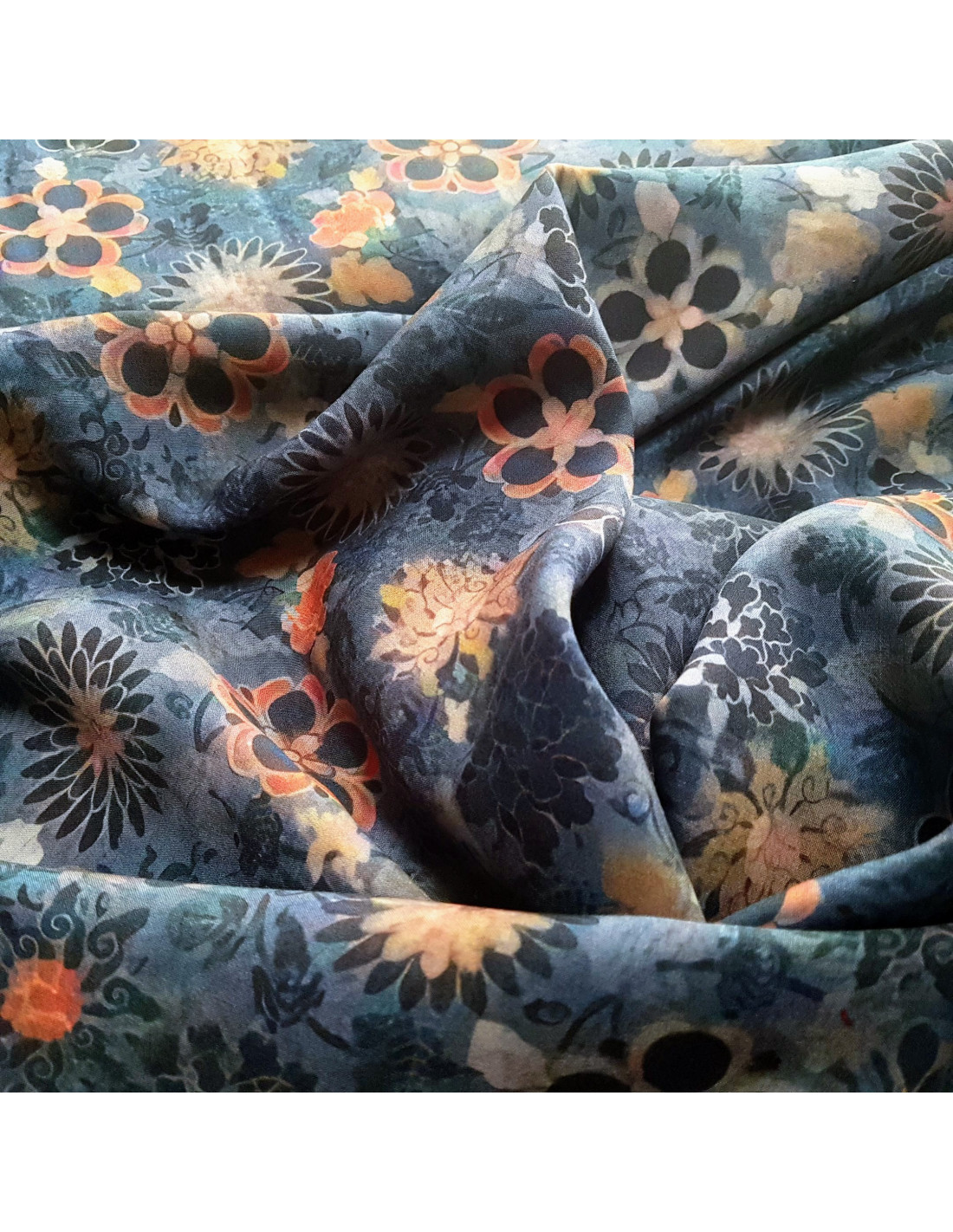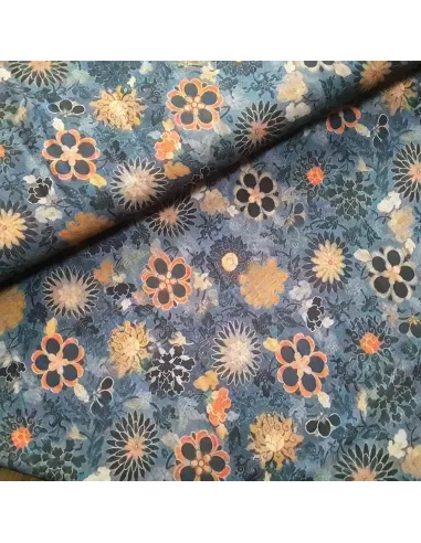 Tissu viscose fleurs sur fond marine. Ce tissu est léger, très coloré, parfait pour le confection de vêtements légers d'été ou d'hiver.