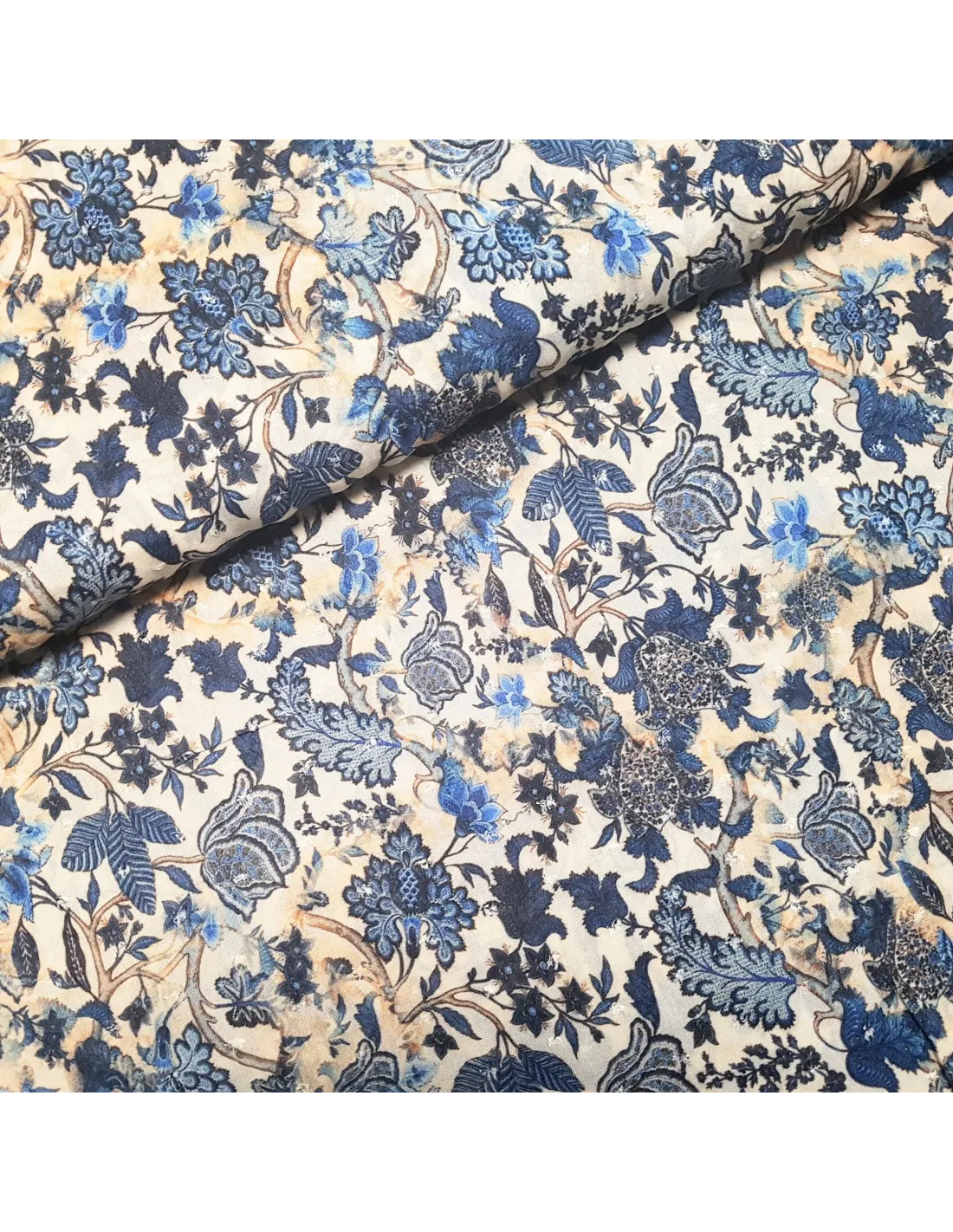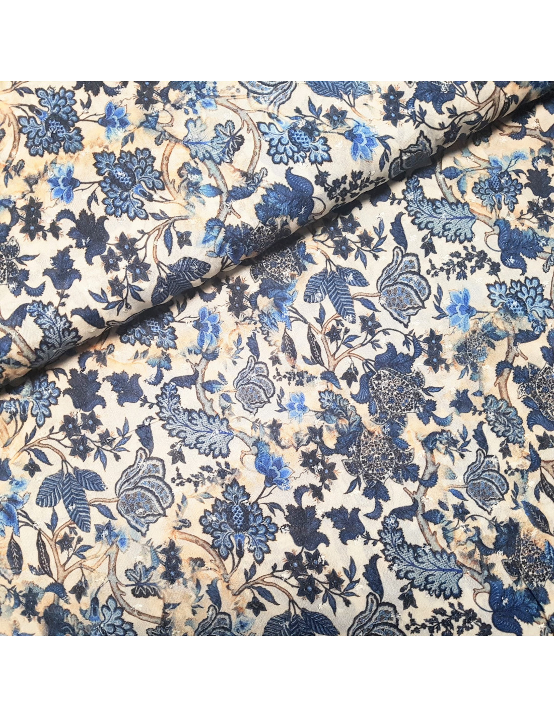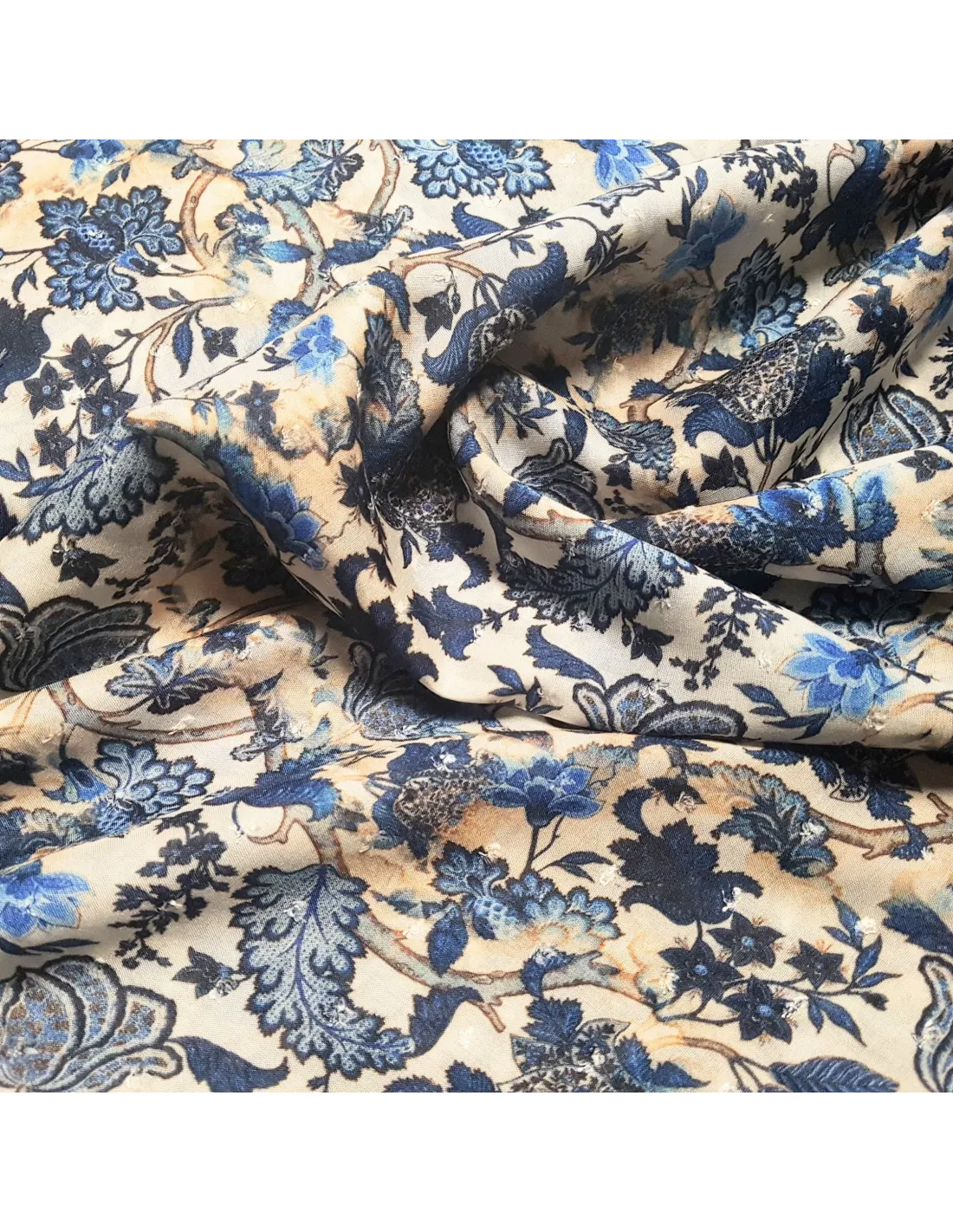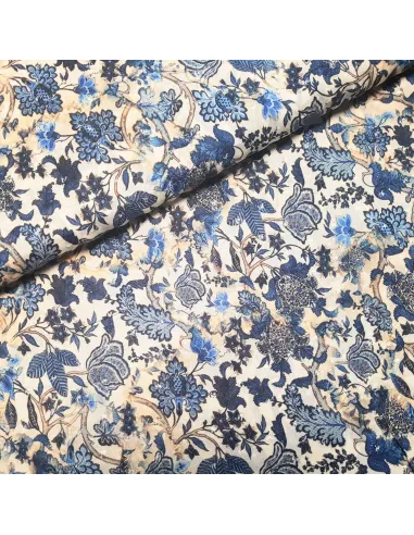 Tissu viscose piqué, fleurs bleues sur fond écru. Ce tissu est léger, parfait pour le confection de vêtements légers d'été ou d'hiver.