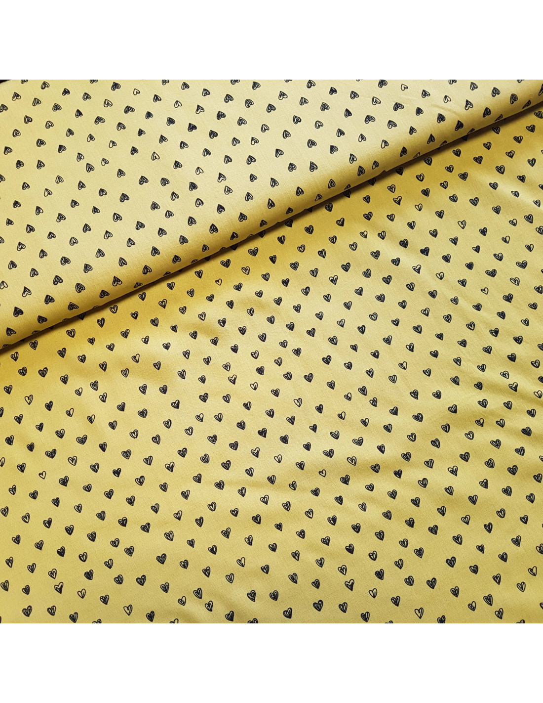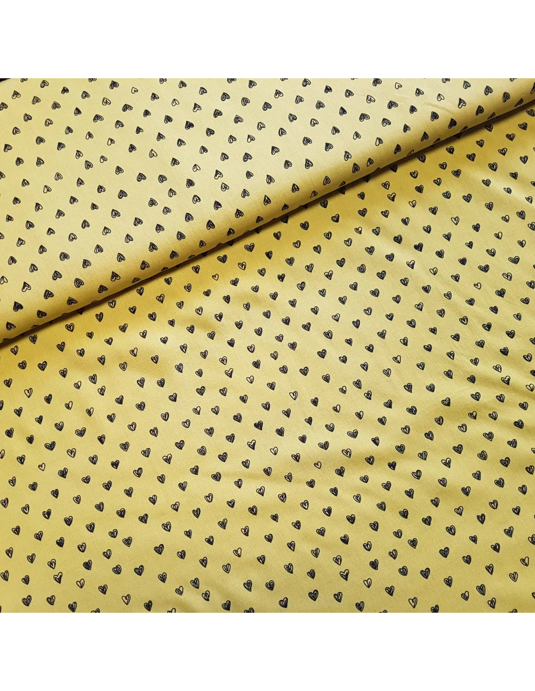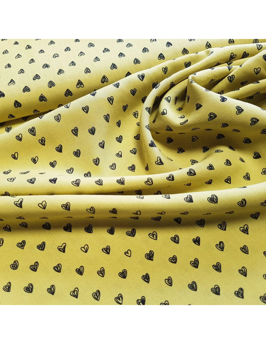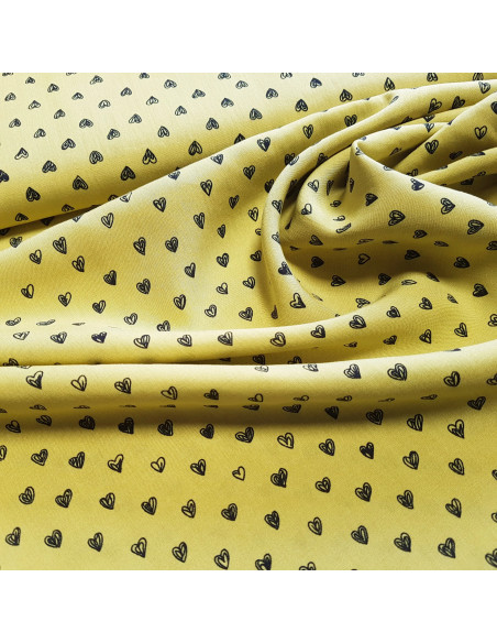 Viscose légère, imprimée cœurs sur fond jaune vert. Parfait pour un haut, ou une robe.