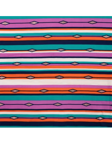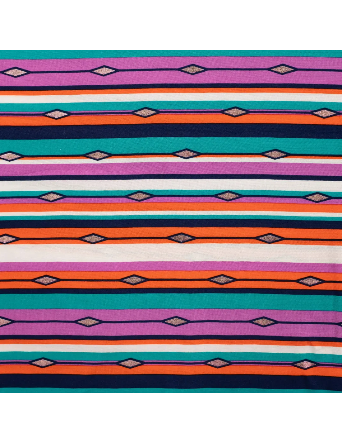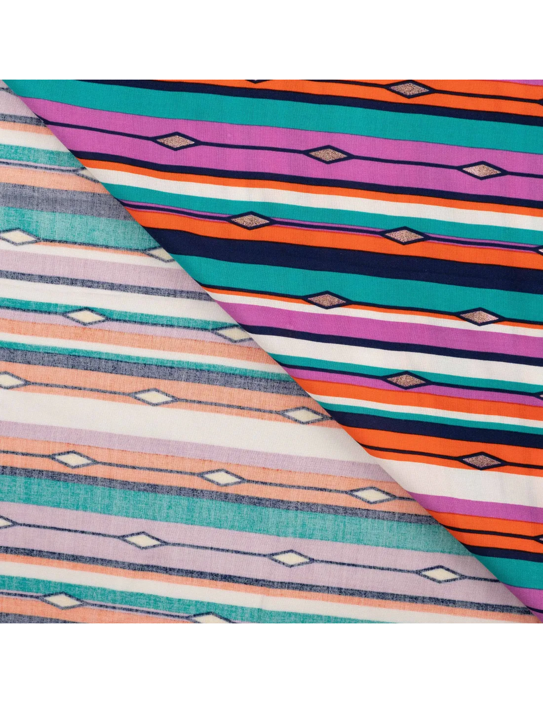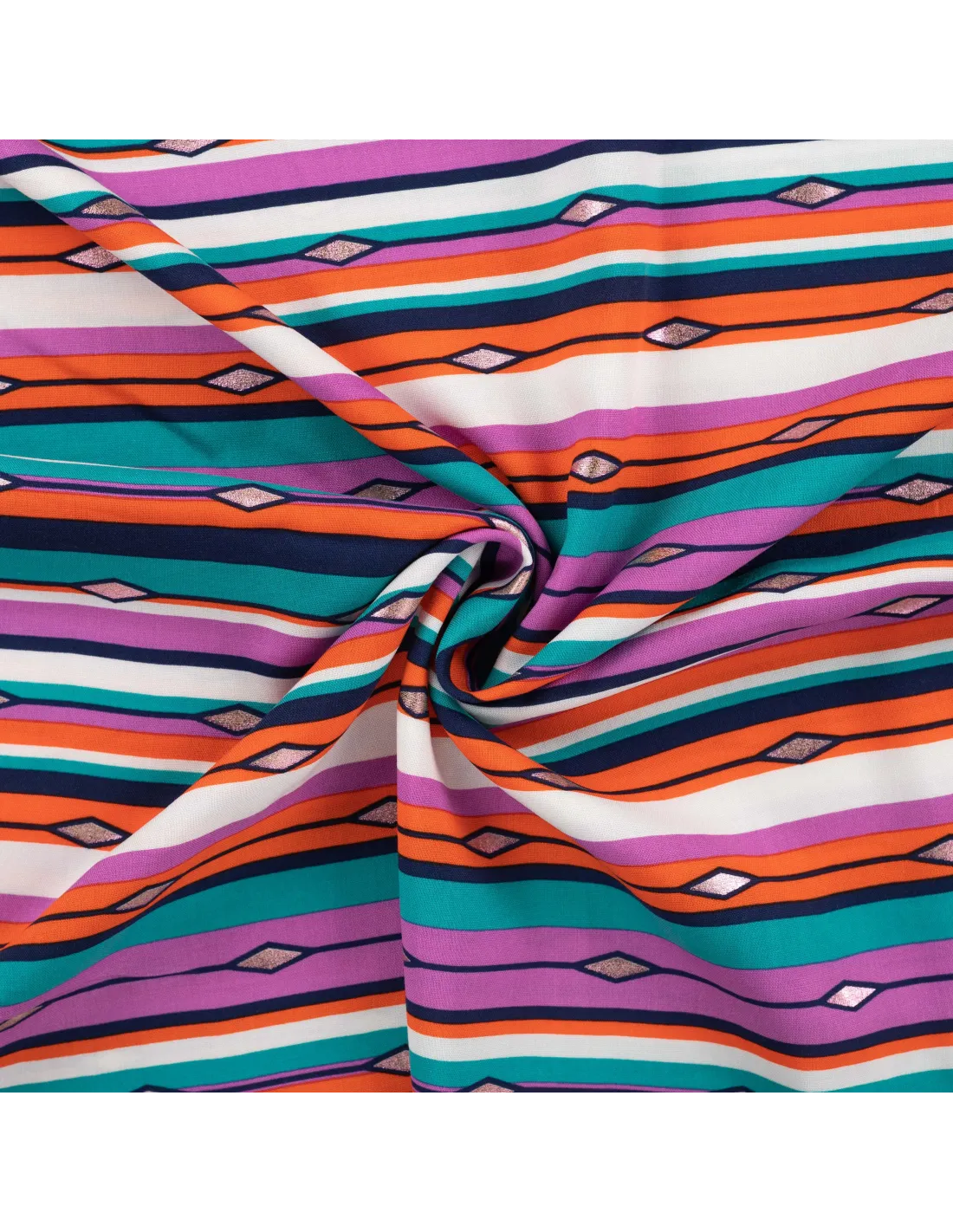 Viscose imprimée rayures colorées et losanges lurex roses. Parfait pour un haut, ou une robe.