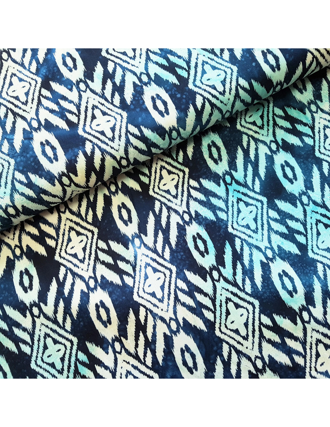 Batik viscose graphique dans les tons bleus. Parfait pour un haut, ou une robe.