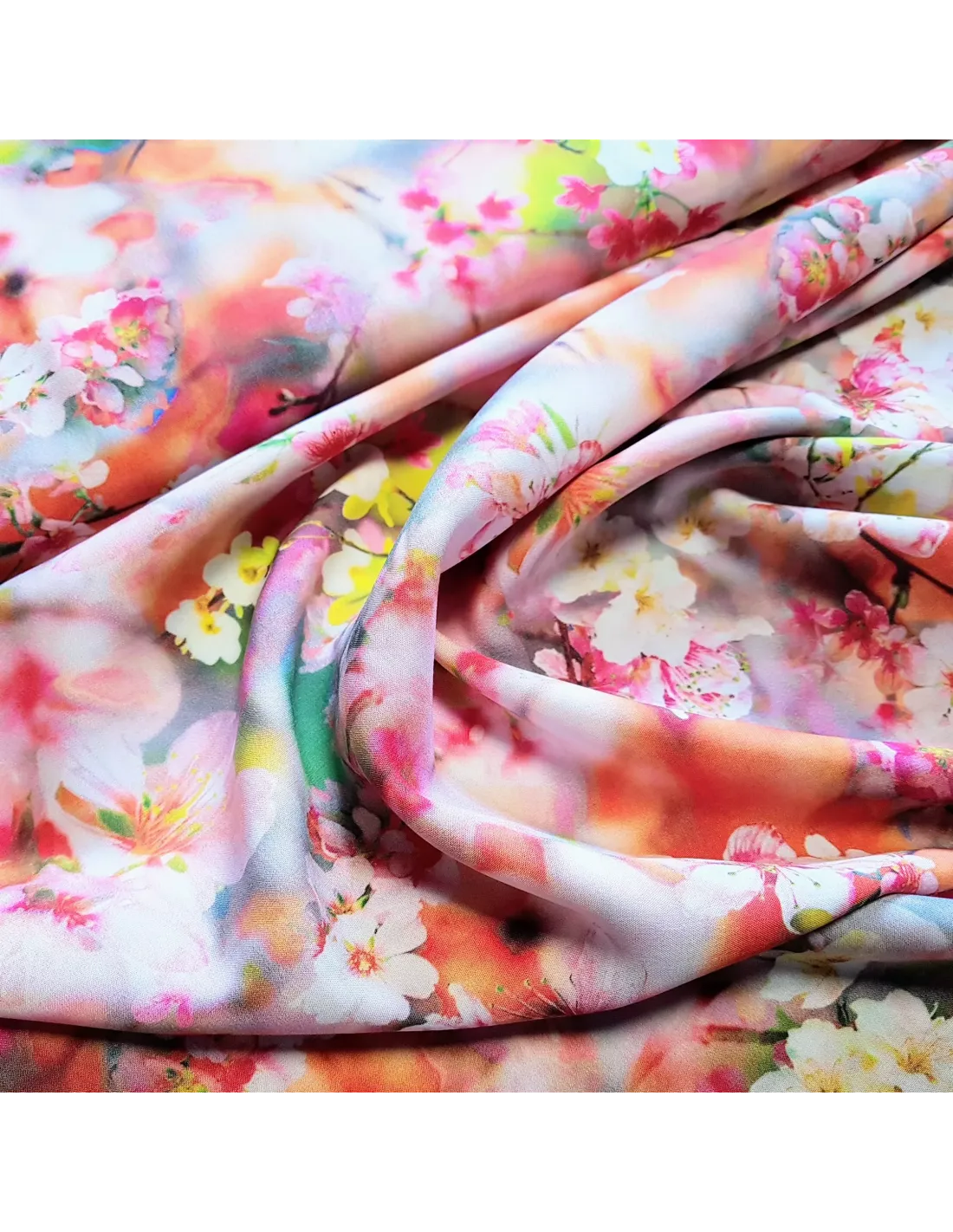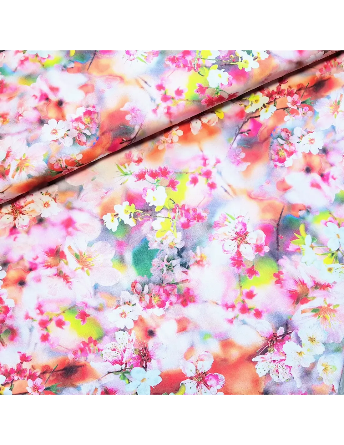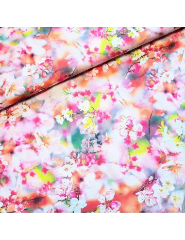 Viscose impression digitale, fleurs de cerisier japonais, dans les tons roses. Parfait pour un haut, ou une robe.