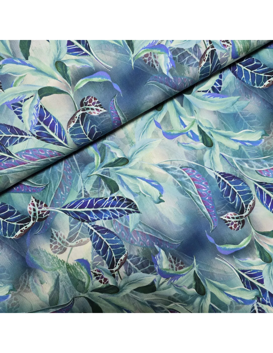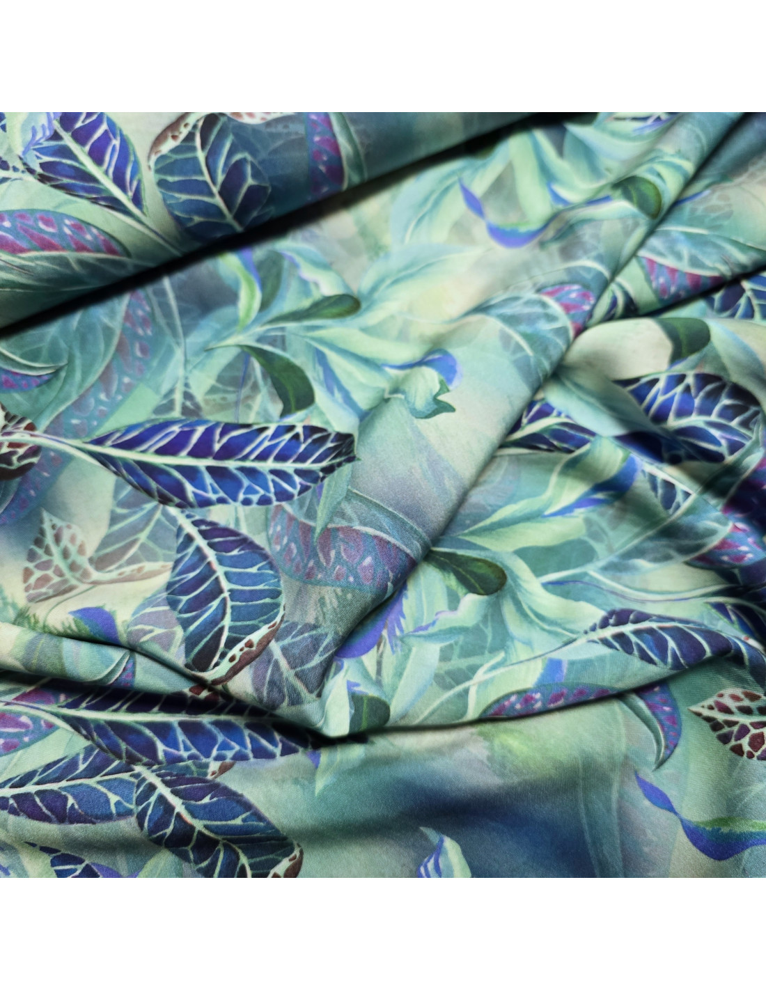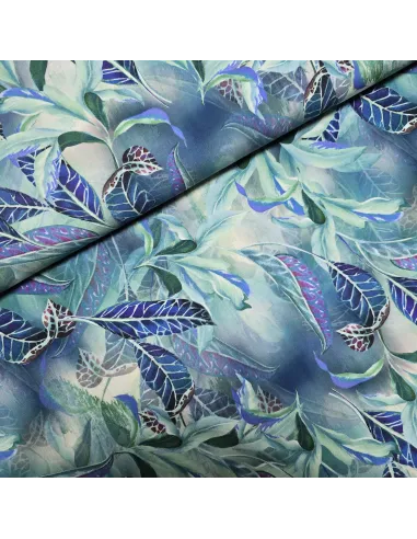 Viscose imprimée, feuilles bleues et vertes. Parfait pour un haut, ou une robe.