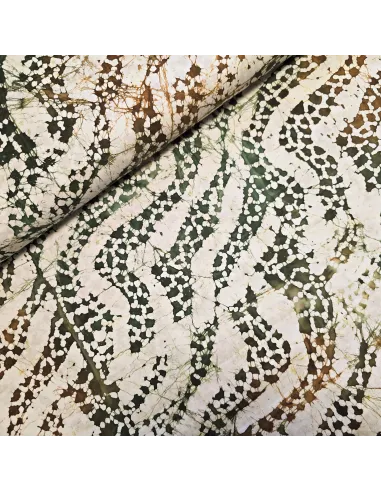 Ce tissu batik coton est un véritable trésor pour les couturiers en quête d'originalité et de naturel. Ses nuances de vert, obtenues grâce à la technique artisanale du batik, évoquent la nature et apportent une touche de fraîcheur à vos créations. Le coton, matière naturelle et confortable, en fait un tissu agréable à porter et facile à travailler.