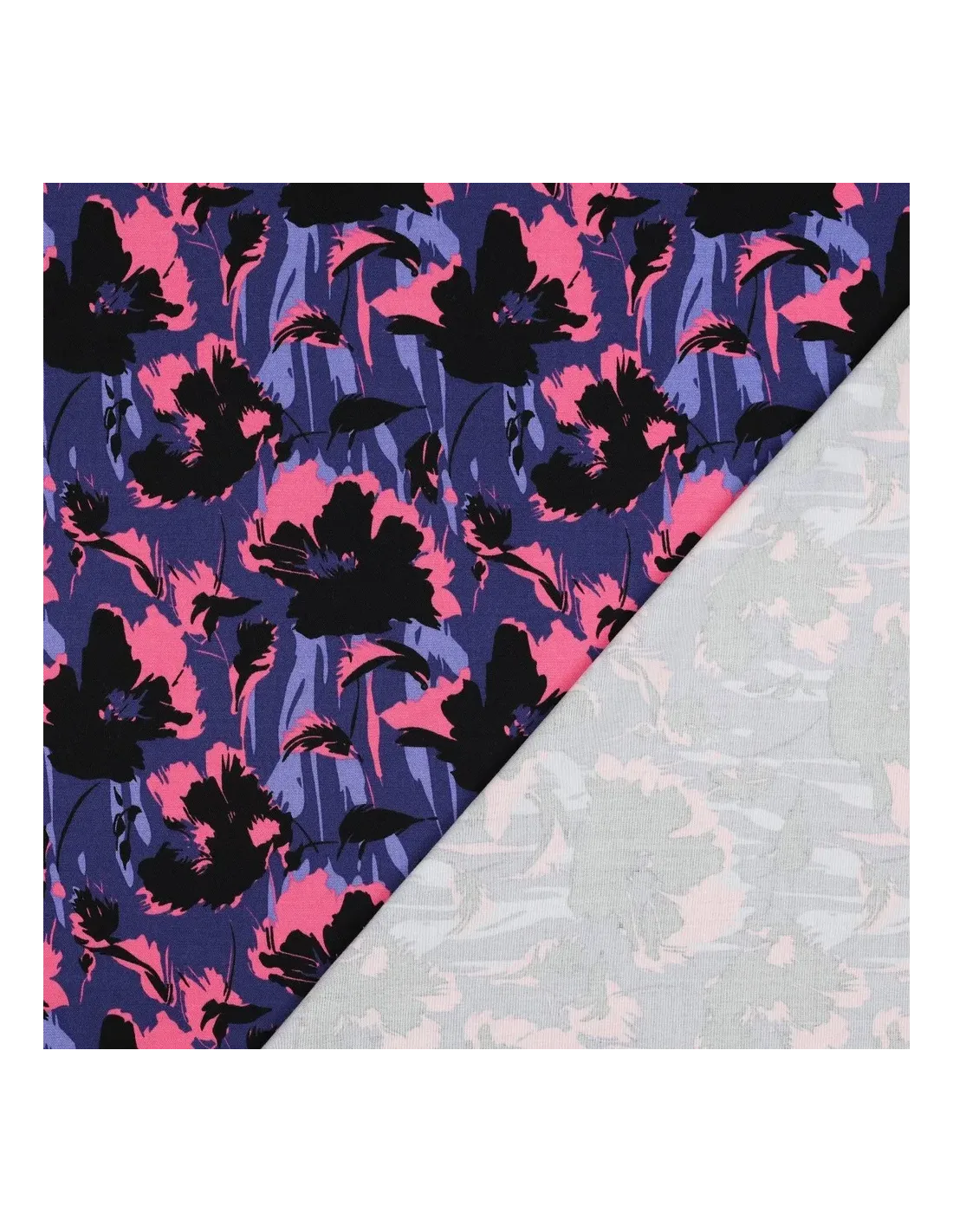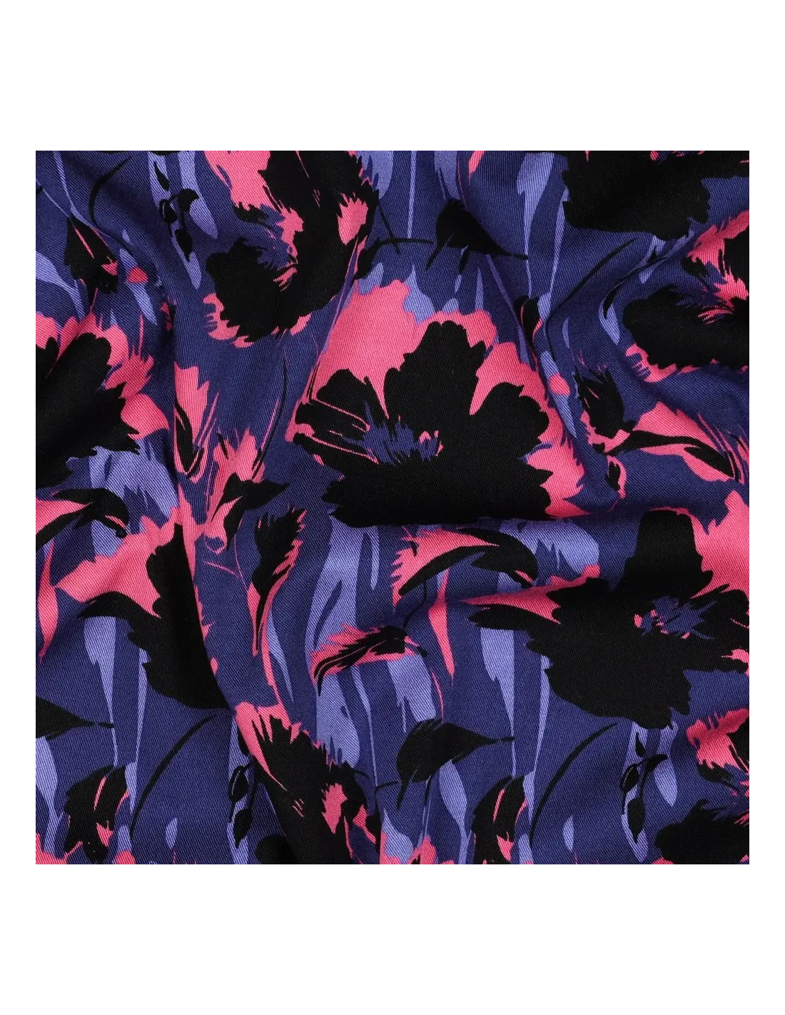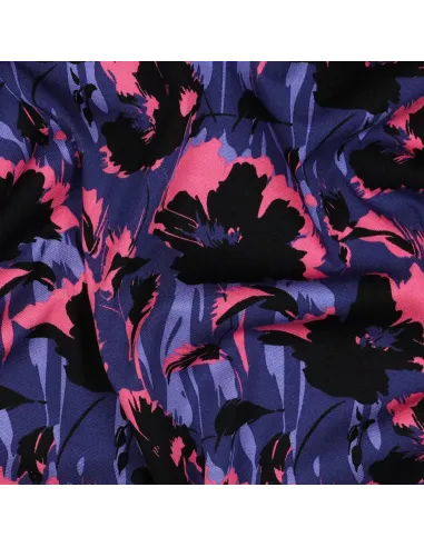 Découvrez notre twill de viscose, une matière d'exception qui allie l'élégance à un confort absolu. Ce tissu fluide se distingue par son motif floral saisissant, où des fleurs stylisées se déploient dans un camaïeu sophistiqué de bleu et de noir, rehaussé de touches de rose vif. Un design chic et intemporel, parfait pour un look féminin et moderne.